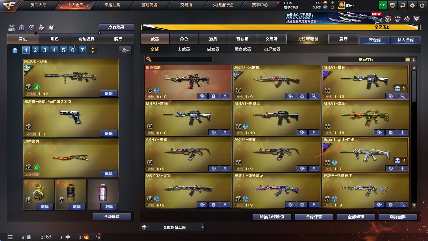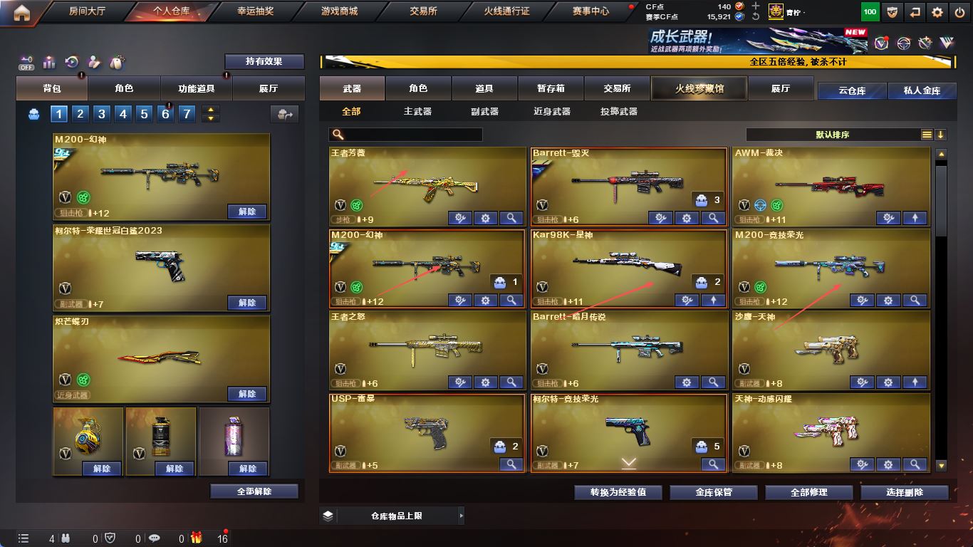 【亮点解析 幻神三件套 Kar98K-星神带卡】 【M200-幻神+音效卡+幻神-冠军之幻+cfs2022】 【竞技荣光套+四防云悠悠+usp雷暴】 【Kar98K-星神+音效卡】 【传说暗裔】 【ScarLight-白虎+音效卡+巅峰荣耀】 【QBZ03-金色蔷薇+cfs2024】 【裁决】 【毁灭+音效卡】 【火麒麟】 【雷神+音效卡+巅峰荣耀】 【黑骑士】 【王者之势 王者芳薇 王者之怒】 【8手枪 天神 usp雷暴 柯尔特荣耀世冠白鲨2023*2 柯尔特无冕之王 cop雷霆王者】 【10近战 屠龙*2 龙啸 麒麟刺 炽芒蝶刃蝴蝶刀】 【手雷 幻灵雷 竞技荣光*2 雷霆王者】 【四防 王者葵貂蝉 王者炽天使 王者潘多拉 王者影豹】;USP-雷暴,柯尔特-无冕之王,柯尔特-荣耀世冠白鲨2023,炽芒蝶刃,电竞教官-云悠悠,QBZ03-金色蔷薇,M200-幻神,