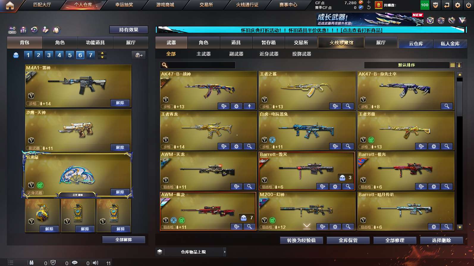 《4防传说影煞》《m200幻神+幻神世冠白鲨+2幻神电流骇客》《裁决+裁决百城联赛+裁决流光秘银》《王者凰鸣》《柯尔特竞技荣光 cop云龙 柯尔特世冠白鲨 cop白鲨 cop旗袍 1911大黄蜂》《云龙套》《g36幻影》《白虎电玩蓝兔》《王者青龙》《白虎》《朱雀》《王者芳薇/猎神》《青龙之魄》《毁灭》《火麒麟》《雷神》《黑骑士》《黑龙吞噬者》《雷神精英刀锋 火麒麟灵狐 天龙曼陀罗 海滩汪汪芭蕾特 m37葵》《云悠悠 雨墨 奇洋探员满配 乔伊教练满配 4防王者潘多拉 云海玲珑 4防暗夜审判 职业选手》《毁灭音效卡 黑龙音效卡 雷神音效卡 黑骑士音效卡 烈火动感闪耀音效卡 黑骑士音效卡》《雷神机甲刑天 无影神兵利器 雷神宇航兔 黑骑士战神马超 火麒麟ag战队皮 天龙70kg》;柯尔特-荣耀世冠白鲨2023,传说影煞,电竞教官-云悠悠,G36C-幻影,M200-幻神,Scar Light-白虎,