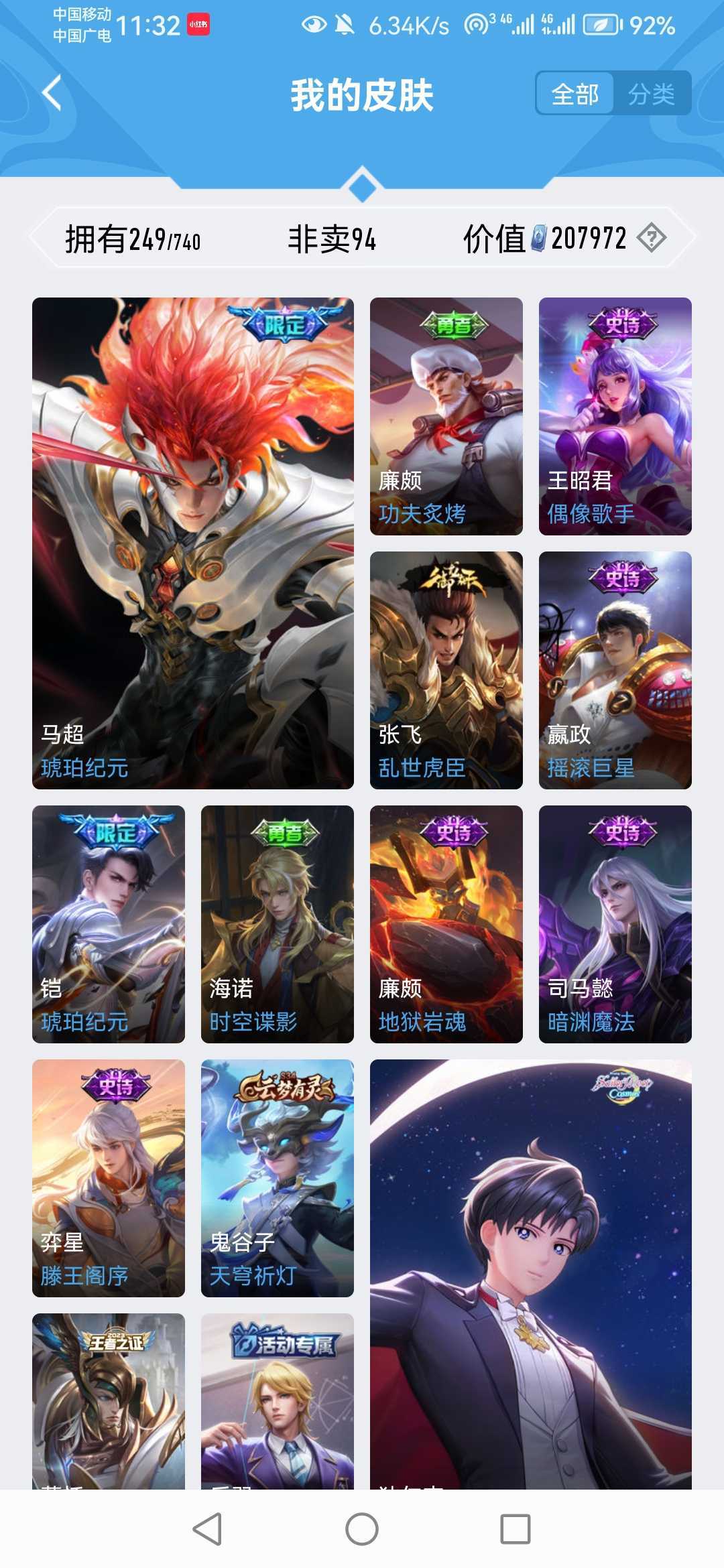 扫码登录。VIP10。385皮肤,七水,四星元,双王者之证!武则天神域,李白荣耀典藏,全息碎影,全符文,各种限定,各种机甲,皮肤都有,绝对满足各位
