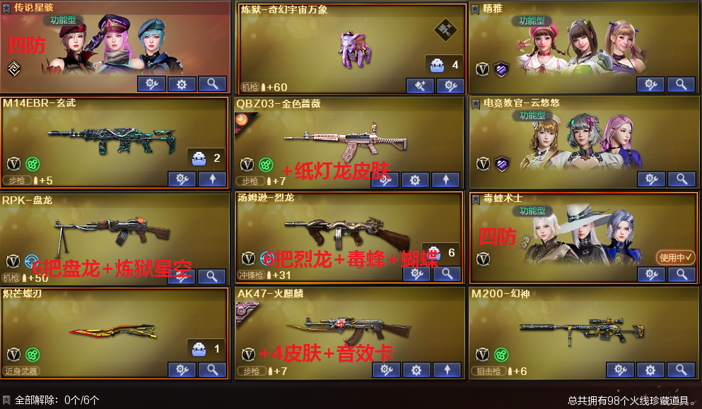 生化天花板✅传说星骇+6烈龙蝴蝶+6盘龙泡泡象+炽芒蝶刃✅幻神+QBZ+火麒麟4皮音效卡 稀有武器:M200幻神、6把烈龙+、6把盘龙+2炼狱(星空皮肤)、炽芒蝶刃、QBZ金色蔷薇(纸灯龙皮肤)、QBZ天罚、M4青龙、M14玄武、千变、火麒麟(火麒麟音效卡、心动糖果皮肤、平天大圣皮肤、CFstar皮肤、AG战队皮肤)、黑龙(暗月皮肤)、雷神(能量核心皮肤)、黑骑士、黑武士、黑鲨、龙血、无影神兵利器、黑武士锦绣游龙、超新星热带奇洋、机械迷城穹宇、玫瑰精灵、猎神、烈火动感闪耀、黑骑士海王、天龙、毁灭、裁决、Barrett金色蔷薇、烈龙云海游龙、A12雷霆、修罗X4(能量核心皮肤、CFstar皮肤)、天神X4、天神动感闪耀、Ana玄豹、屠龙X3、龙啸、擎天、麒麟刺、麒麟刺堕天神、龙啸堕天神X2、屠龙动感闪耀、擎天云海游龙、龙啸热带奇洋、冰龙粉碎者白马银枪、黑龙吞噬者、神圣爆裂者末日3、巡航者、MAC10涂鸦 稀有角色:传说星骇(四防:挑战背包+觉醒肾上腺素+挑战暴走时间提升+防爆盾)、电竞教官云悠悠、毒蝰术士(四防:生化背包变更+佣兵觉醒无需换弹+移动速度提升+生化觉醒狂暴化)、机械姬、葵、迷迭香、晴雅、樱、魅影、奇洋探员、乔伊教练、蛇影宗、王者瞳闭月羞花、王者凌霄、王者樱热浪之夏、云海玲珑 王者炫金武器:王者之戮觉醒、王者之幻觉醒、王者之怒觉醒、王者之灵觉醒、王者冰峰觉醒、王者之魄X2、炫金骑士、蔷薇青龙、炫金毁灭、 投掷套装:堕天神套X4、手雷动感闪耀、手雷云海游龙、手雷热带奇洋、音乐手雷X2 小人枪武器特殊武器:火麒麟灵狐、炼狱奇幻宇宙象、迷你宝贝、迷你钢铁终结者、迷你救赎猎手、MK5炽火炎龙、毒蜂、异变清道夫蛇影双骄、迷你律动酷熊、斯太尔蝴蝶、跳跳鲨、C.A.T、M37葵、COP旗袍、迷你生化手雷X4;炽芒蝶刃,传说星骇,电竞教官-云悠悠,晴雅,RPK-盘龙,QBZ03-金色蔷薇,M200-幻神,