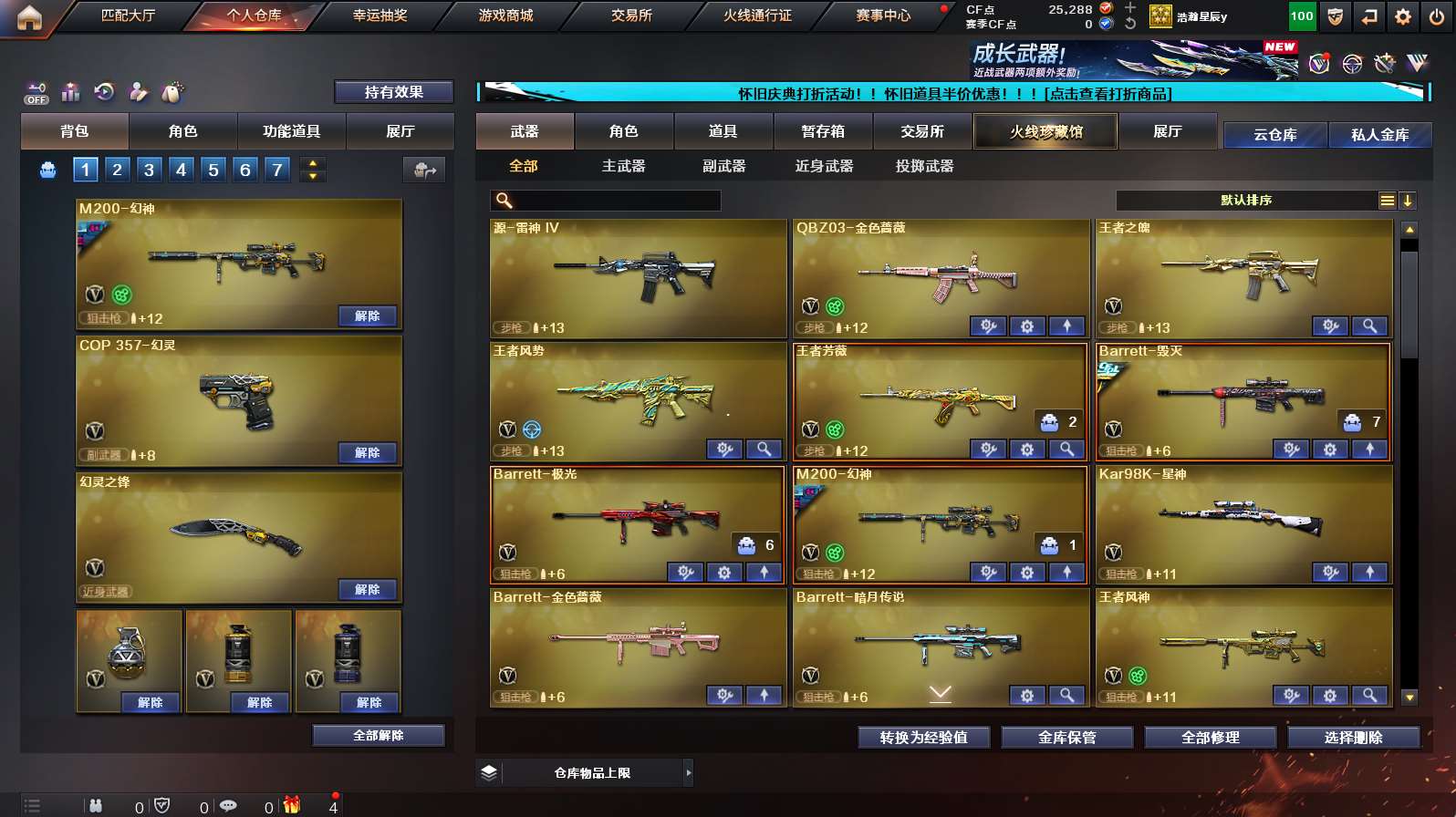 《传说辉光》《m200幻神+幻神世冠白鲨+电流骇客+幻神音效卡》《星神》《王者风神》《cop幻灵 cop白鲨 1911大黄蜂》《g36幻影》《青龙》《王者风势/芳薇》《qbz金色蔷薇》《王者之魄》《火麒麟》《雷神》《黑骑士》《黑武士》《黑龙》《6烈 6炼狱 炼狱迷你小钢 斯泰尔蝴蝶 斯泰尔呛娘暗刃》《4防晴雅 雨棠 4防王者潘多拉 葵赛博朋克 女主播》《毁灭音效卡 极光音效卡 黑骑士音效卡》;晴雅,QBZ03-金色蔷薇,G36C-幻影,M200-幻神,Kar98K-星神,