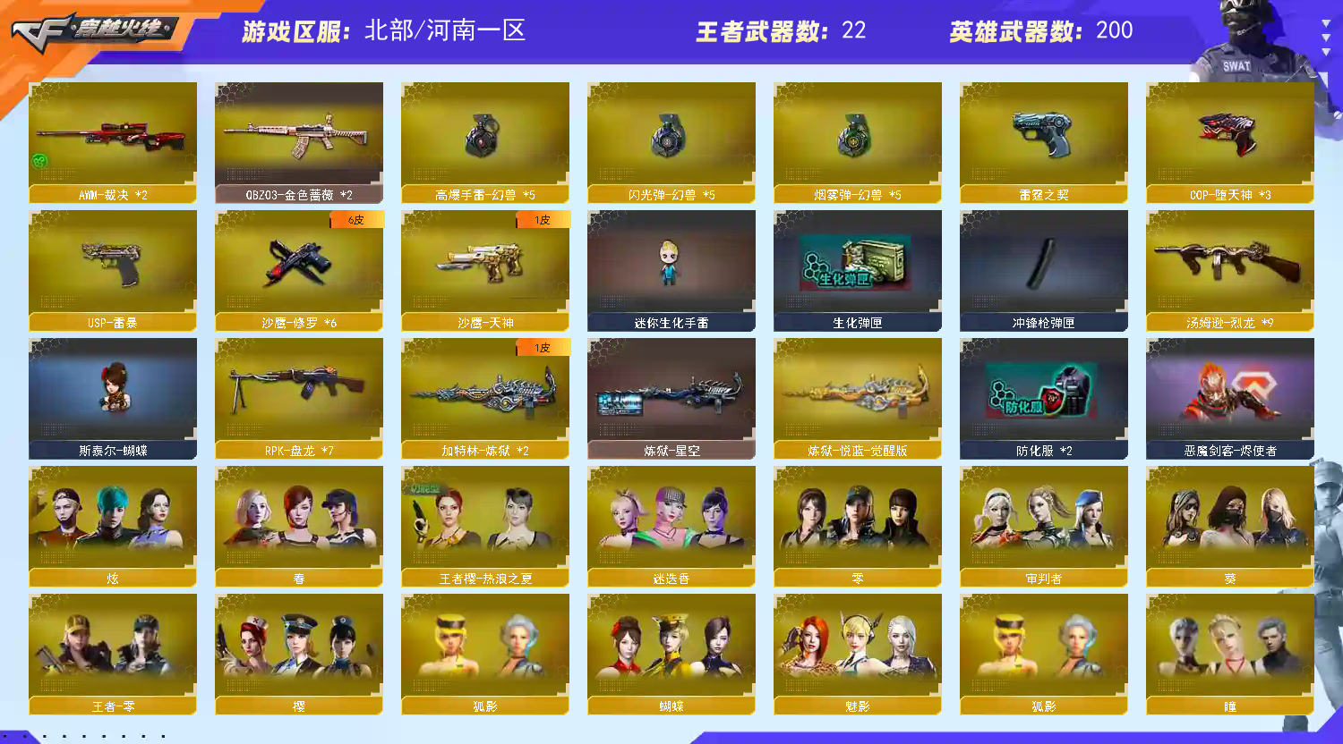 此号价值过大,已向公安机关报备,如有开G开辅助封号的,由平台提供,身份信息证据和地址进行报警处理并依法追究.;USP-雷暴,RPK-盘龙,QBZ03-金色蔷薇,