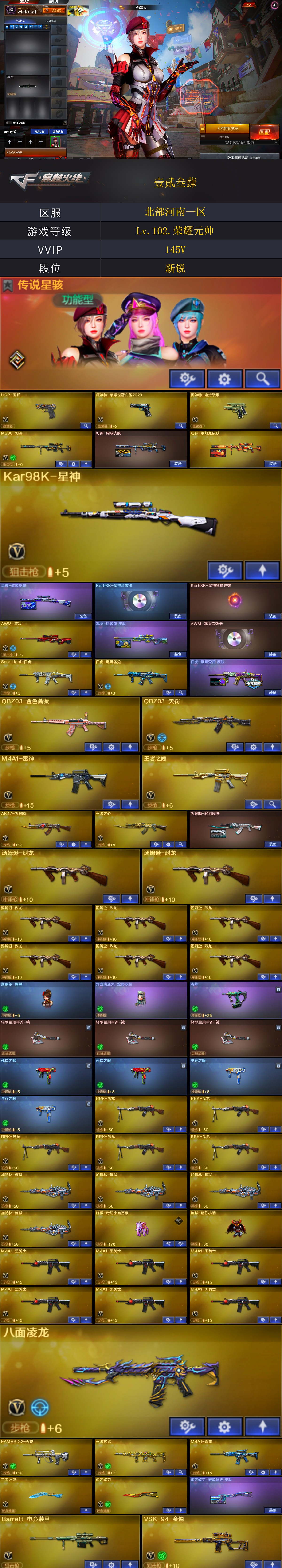 【商品标题】:北部河南一区-145V-可二次实名-【Lv.102.荣耀元帅】-【段位:新锐】 【稀有武器】:M200-幻神/Kar98K-星神/VSK-94-金蚀/八面凌龙/ScarLight-白虎/M4A1-青龙/QBZ03-天罚/USP-雷暴/柯尔特-电竞装甲/柯尔特-荣耀世冠白鲨2023/修罗-古蛇迷踪/金色蔷薇-古蛇迷踪/QBZ03-金色蔷薇/AK47-火麒麟(2)/M4A1-雷神(2)/M4A1-黑骑士(6)/AK47-黑武士/白虎-电玩蓝兔/Barrett-毁灭(2)/AWM-裁决/Barrett-电竞装甲/RPK-盘龙(5)/加特林-炼狱(4)/悦蓝-惊涛骇浪-觉醒版/汤姆逊-烈龙(8)/炽芒蝶刃/斩神刀-雷暴/尼泊尔-电竞装甲/幻灵之锋 【王者武器】:王者之心-觉醒版/王者之魄-觉醒版/M4A1-雷霆王者-觉醒版/王者之力-觉醒版/王者之怒/王者之力 【热门角色】:沙漠玫瑰/奇洋探员/乔伊教练/蛇隐宗/兔囡囡 【热门音效卡】:Kar98K-星神音效卡/AWM-裁决音效卡/QBZ03-天罚音效卡/Barrett-毁灭音效卡/M4A1-黑骑士音效卡 【热门皮肤】:幻神-周瑜皮肤/幻神-纸灯龙皮肤/白虎-巅峰荣耀 皮肤/炼狱-电子连击皮肤/星神-璀璨皮肤/炽芒蝶刃-破浪逐光皮肤/毁灭-荣耀之怒 【其他亮点】:斯泰尔-蝴蝶/炼狱-迷你小钢/毒蜂/异变清道夫/金刚伞-电玩红兔/烟雾弹-荣耀世冠白鲨2023(2);USP-雷暴,柯尔特-荣耀世冠白鲨2023,炽芒蝶刃,沙漠玫瑰,传说星骇,RPK-盘龙,QBZ03-金色蔷薇,