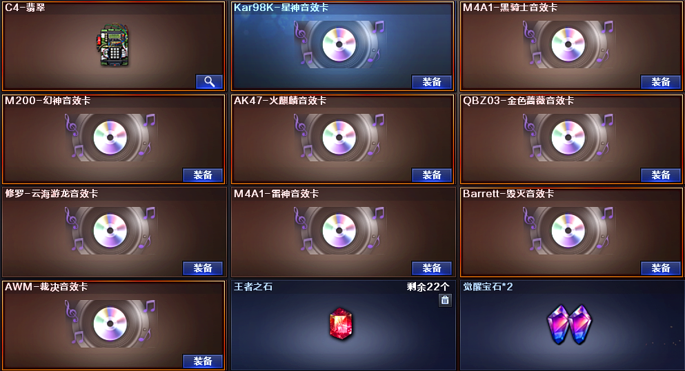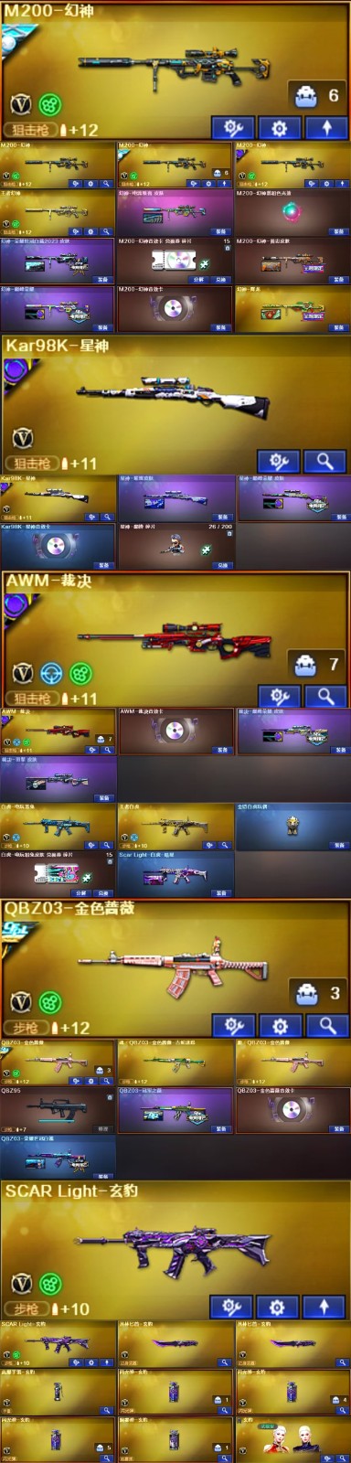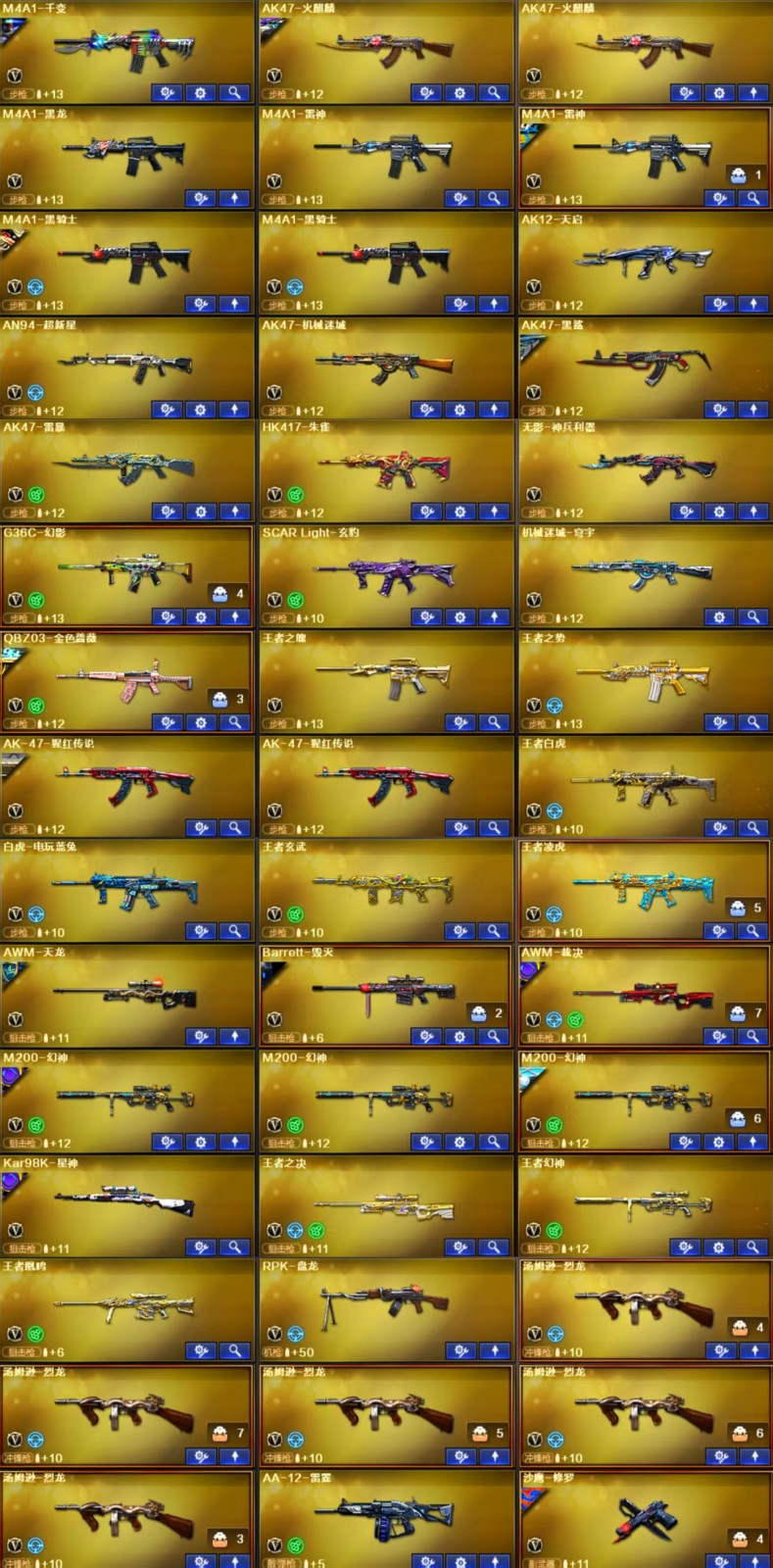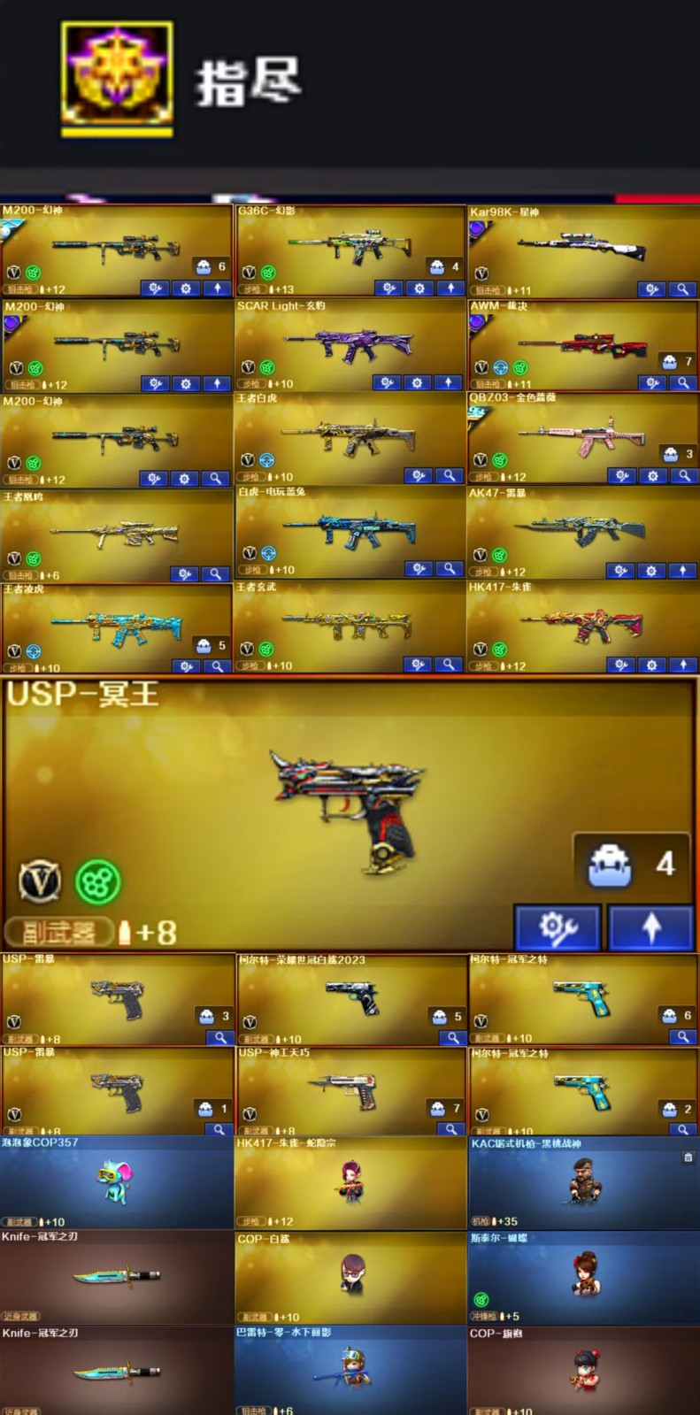 【王者武器】:【炫金雷神-1,炫金毁灭-1,王者青龙-1,王者冰锋-1,王者玄武-1,王者之决-觉醒版-1,王者之击-觉醒版-1,王者之势-觉醒版-1,王者之魄-觉醒版-1,王者幻神-觉醒版-1,王者白虎-觉醒版-1,王者凌虎-1】 【英雄武器】:【AK12-天启-1,AN94-超新星-1,M4A1-千变-1,M4A1-黑骑士-2,屠龙-5,AK47-机械迷城-1,龙啸-2,麒麟刺-1,AK47-火麒麟-2,AWM-天龙-1,Barrett-毁灭-1,汤姆逊-烈龙-5,RPK-盘龙-1,沙鹰-修罗-4,沙鹰-天神-2,M4A1-雷神-2,M4A1-黑龙-1,M200-幻神-3,USP-雷暴-2,高爆手雷-雷暴-7,烟雾弹-雷霆-1,闪光弹-雷暴-7,烟雾弹-雷暴-7,斩神刀-雷暴-1,柯尔特-冠军之特-2,机械迷城-穹宇-1,白虎-电玩蓝兔-1,高爆手雷-夜魔-1,马来剑-夜魔-1,闪光弹-夜魔-1,烟雾弹-夜魔-1,USP-神工天巧-1,AK-47-猩红传说-2,无影-神兵利器-1,AA-12-雷霆-1,QBZ03-金色蔷薇-1,SCAR Light-玄豹-1,丛林匕首-玄豹-2,USP-冥王-1,高爆手雷-玄豹-1,闪光弹-玄豹-3,烟雾弹-玄豹-1,HK417-朱雀-1,G36C-幻影-1,手雷-动感闪耀-1,天神-动感闪耀-1,屠龙-动感闪耀-1,柯尔特-荣耀世冠白鲨2023-1,Kar98K-星神-1,泡泡象COP357-1,擎天-2,AWM-裁决-1,高爆手雷-堕天神-1,麒麟刺-堕天神-1,闪光弹-堕天神-1,烟雾弹-堕天神-1,AK47-雷暴-1,烟雾弹-幻灵-1,闪光弹-幻灵-1,高爆手雷-幻灵-1,AK47-黑鲨-1】 【装饰品】:【火麒麟-CF STAR-1,天龙-CF STAR-1,修罗-CF STAR-1,雷神-暗月-1,黑龙-能量核心-1,修罗-能量核心-1,AWM-天龙-传奇白鲨-1,火麒麟-冠军之心-1,AWM-天龙-传奇70KG-1,幻神-荣耀世冠白鲨2023 皮肤-1,毁灭-虹光风暴 皮肤-1,雷神-宇航兔皮肤-1,雷神-烈虎皮肤-1,毁灭-冠军之怒-1,M4A1-战神赵云-1,M4A1-千变-孔明皮肤-1,AK47-火麒麟-传奇EVEN-1,雷神-虎将-1,黑骑士-少林-1,黑骑士耀金皮肤-1,雷神-星空-1,关羽玩偶-1,火麒麟玩偶-1,Scar Light-白虎-暗星-1,QBZ03-荣耀世冠白鲨-1,屠龙-星耀 皮肤-1,QBZ03-冠军之薇-1,毁灭-星耀 皮肤-1,AK47-B-常胜将军-刘备-1,屠龙-荣耀之锋-1,雷神-荣耀之魄-1,毁灭-荣耀之怒-1,毁灭耀金皮肤-1,幻神-降龙-1,幻神-巅峰荣耀-1,星神-璀璨皮肤-1,擎天-冠军之击-1,毁灭-风暴-1,星神-巅峰荣耀 皮肤-1,裁决-羽掣 皮肤-1,雷神-冠军之魄-1,龙啸-冠军之啸-1,魅影玩偶-1,裁决-巅峰荣耀 皮肤-1,绝迹语音包-1,零-水下丽影玩偶-1,修罗-冠军之魂-1,白泽玩偶-1,龙啸-巅峰荣耀 皮肤-1,蝴蝶玩偶-1,M200-幻神-黄忠皮肤-1】 【角色】:【金戈,零,堕天使,复仇者,幻影,雷霆-β,飞虎队,猎狐者,刀锋,兰,灵狐者,春,嘉年华灵狐,潘多拉-锋芒精英,关小雨,灵狐者-黄金海岸,夜玫瑰-X,精英部队,猎狐者-X,星际战将,代号:翼,虎妞,龙儿,玄豹,斯沃特-锋芒精英,传说星骇,隼,王者-魅影,兔囡囡,芳心审判者,王者玲珑,青霞仙子,职业选手,蜀雪】 【道具】:【超级背包-1,炫彩背包-1,烟雾保护头盔-1,闪光护目镜-1,防弹衣-1,防弹头盔-1,手雷包-1,C4工具钳-1,防化服-1,夺命之镰-1,灵魂忍者-1,疯狂宝贝-1,迷雾幽灵-1,步枪弹匣-1,冲锋枪弹匣-1,手枪弹匣-1,Barrett-毁灭音效卡-1,M4A1-雷神音效卡-1,AK47-火麒麟音效卡-1,M4A1-黑骑士音效卡-1,M200-幻神音效卡-1,QBZ03-金色蔷薇音效卡-1,绿色巨人-1,Kar98K-星神音效卡-1,AWM-裁决音效卡-1】;USP-雷暴,柯尔特-荣耀世冠白鲨2023,柯尔特-冠军之特,Knife-冠军之刃,传说星骇,隼,RPK-盘龙,