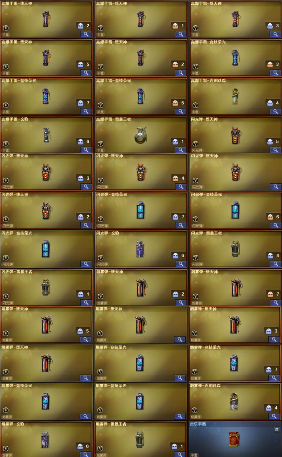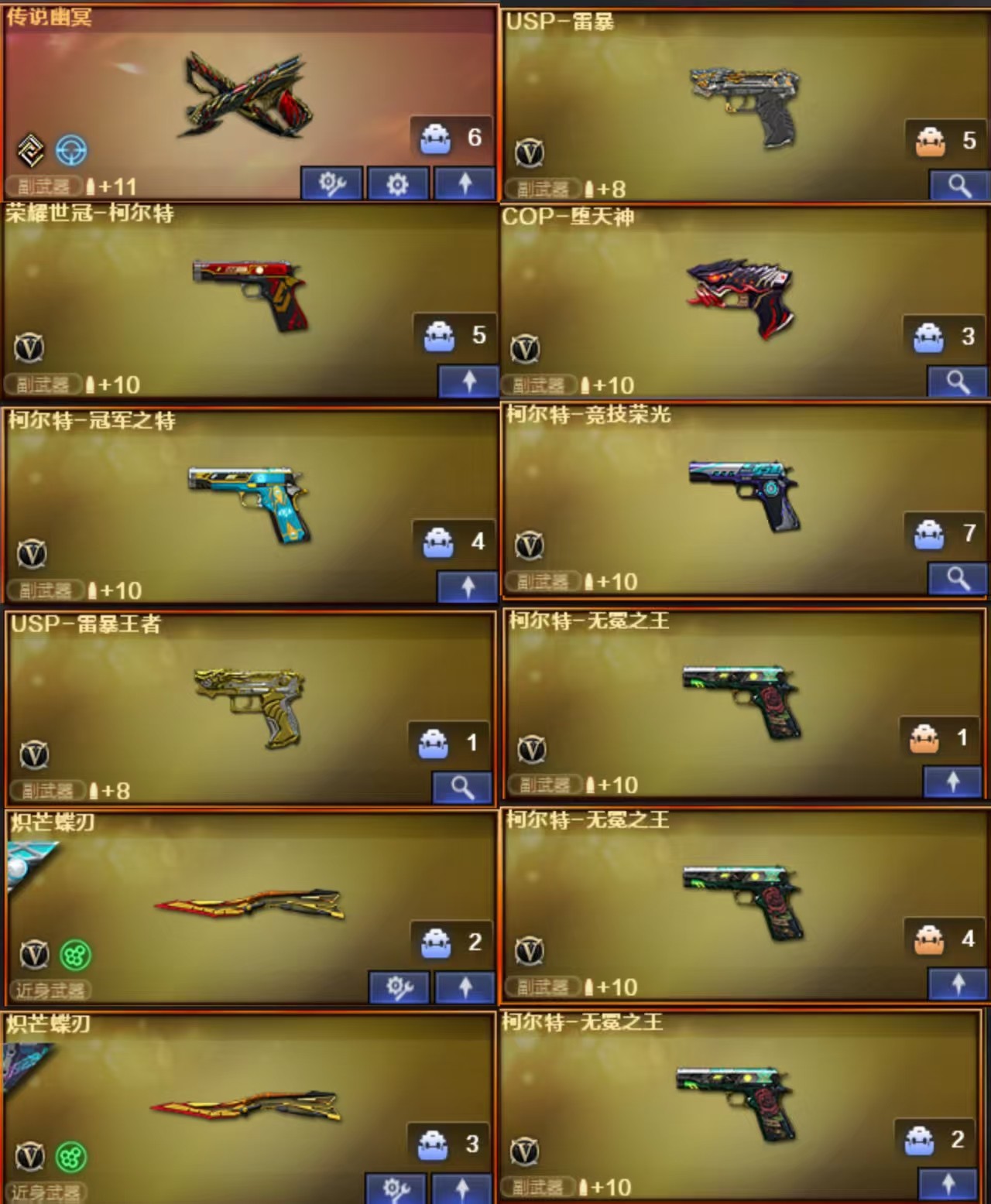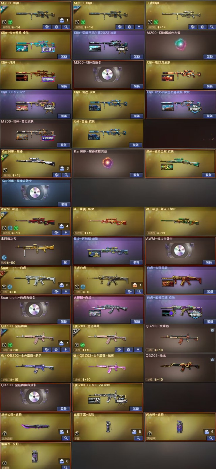 【英雄武器】:【M4A1-黑骑士-2,屠龙-6,AK47-火麒麟-2,AWM-天龙-1,Barrett-毁灭-2,Barrett-极光-2,沙鹰-修罗-2,沙鹰-天神-2,M4A1-雷神-2,M4A1-黑龙-1,M200-幻神-2,USP-雷暴-1,M200-竞技荣光-1,传说夜影-1,擎天-竞技荣光-1,柯尔特-冠军之特-1,机械迷城-穹宇-1,柯尔特-竞技荣光-1,烟雾弹-竞技荣光-4,闪光弹-竞技荣光-3,高爆手雷-竞技荣光-3,Scar Light-白虎-1,炽芒蝶刃-2,AA-12-雷霆-1,Barrett-暗月传说-1,QBZ03-金色蔷薇-2,丛林匕首-玄豹-1,高爆手雷-玄豹-1,闪光弹-玄豹-1,烟雾弹-玄豹-1,传说幽瞳-1,G36C-幻影-1,传说幽冥-1,柯尔特-无冕之王-3,Kar98K-星神-1,擎天-1,COP-堕天神-1,AWM-裁决-1,高爆手雷-堕天神-5,龙啸-堕天神-1,麒麟刺-堕天神-1,闪光弹-堕天神-5,烟雾弹-堕天神-6,荣耀世冠-柯尔特-1,荣耀世冠-雷神-1,荣耀世冠-龙啸-1】 【装饰品】:【火麒麟-CF STAR-1,天龙-CF STAR-1,修罗-CF STAR-1,黑骑士-暗月-1,无影-暗月-1,毁灭-暗月-1,黑龙-能量核心-1,修罗-能量核心-1,王者刀锋玩偶-1,AWM-天龙-传奇白鲨-1,炽芒蝶刃-荣耀世冠白鲨2023 皮肤-1,幻神-荣耀世冠白鲨2023 皮肤-1,擎天-梧桐 皮肤-1,屠龙-小叮当 皮肤-1,雷神-R.LGD-CFPLS18冠军-1,M4A1-战神赵云-1,AK47-火麒麟-传奇EVEN-1,幻神-纸灯龙 皮肤-1,金色蔷薇-纸灯龙 皮肤-1,龙啸-纸灯龙 皮肤-1,火麒麟-新春kwai乐-1,火麒麟-白虎-1,火麒麟-轻羽皮肤-1,黑骑士-伏羲-1,黑骑士-CFS2021-1,白虎-大汉风骨-1,毁灭-黑曼巴 皮肤-1,修罗-星空-1,幻神-星火小队签名臻藏版 皮肤-1,幻神-CFS2022-1,幻神-丹凤-1,裁决-运输船 皮肤-1,炽芒蝶刃-破浪逐光 皮肤-1,幻神-曹操 皮肤-1,金色蔷薇-破浪逐光 皮肤-1,雷神-刘备 皮肤-1,QBZ03-CFS2024 皮肤-1,毁灭-CFS2020-1,白虎-巅峰荣耀 皮肤-1,屠龙-惊鸿 皮肤-1,幻神-AG-CFPL S24冠军 皮肤-1,毁灭-SV-CFPLS16冠军-1,黑龙-墨子皮肤-1,黑骑士-战神马超-1,火麒麟-傲竹金蛇 皮肤-1,毁灭-战神张飞-1,擎天-傲竹金蛇 皮肤-1,屠龙-巅峰荣耀 皮肤-1,屠龙-破浪逐光 皮肤-1,星神-傲竹金蛇 皮肤-1,M200-幻神-黄忠皮肤-1】 【角色】:【樱,零,审判者,堕天使,复仇者,幻影,雷霆-β,雷豹,铁骑,飞虎队,潘多拉,G.E.M.邓紫棋,波塞冬,刀锋,夜玫瑰,兰,灵狐者,木兰,威锋,救世主,电竞教官-云悠悠,圣诞潘多拉-X,影武者-X,剑齿虎-X,烈锋,猎狐者-X,斯沃特精英,星际战将,潘多拉-甜心教官,新娜塔莎,娜塔莎,隼,暗夜-X,迷迭香,葵-赛博朋克】 【道具】:【超级背包-1,炫彩背包-1,金蛇戒-1,银蛇戒-1,烟雾保护头盔-1,闪光护目镜-1,防弹头盔-1,手雷包-1,C4工具钳-1,防化服-1,夺命之镰-1,疯狂宝贝-1,迷雾幽灵-1,步枪弹匣-1,M4A1-雷神音效卡-1,M4A1-黑骑士音效卡-1,M200-幻神音效卡-1,QBZ03-金色蔷薇音效卡-1,Scar Light-白虎音效卡-1,变相怪杰-1,绿色巨人-1,黄金头骨护目镜-1,兔子发带-1,Kar98K-星神音效卡-1,AWM-裁决音效卡-1】;USP-雷暴,柯尔特-无冕之王,USP-雷暴王者,荣耀世冠-柯尔特,传说幽冥,柯尔特-冠军之特,炽芒蝶刃,