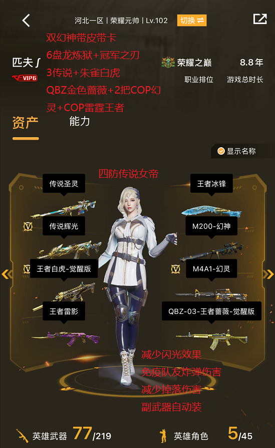 编号:HHB344北部河北一区✅爆破挑战全装✅四防传说女帝+传说辉光圣灵+双幻神带皮带卡✅6盘炼狱+COP雷霆王者+冠军之刃✅ 稀有武器:传说辉光、传说圣灵、M200幻神X2、盘龙X6、炼狱风暴、炼狱悦蓝、Barrett朱雀、Scar白虎、M4A1幻灵、QBZ金色蔷薇、火麒麟、黑龙、雷神、黑骑士、无影神兵利器、黑武士锦绣游龙、超新星热带奇洋、机械迷城穹宇、烈火、烈火动感闪耀、毁灭、暗月传说、修罗X3、COP幻灵X2、天神动感闪耀、屠龙X3、斩神刀雷暴、幻灵之锋、屠龙动感闪耀、龙啸热带奇洋、荣耀世冠龙啸、M4A1雷霆王者、Knife冠军之刃 稀有角色:四防传说女帝(减少闪光效果/免疫队友炸弹伤害/减少掉落伤害/副武器自动装弹)、四防影豹(捕食者之眼/生化背包变更/佣兵觉醒/生化觉醒)、零、炫、战地猎狐、奇洋探员、乔伊教练、王者玲珑、王者涂鸦、修道士、初恋灵狐、灵狐者职业经理 音效卡:幻神音效卡、黑龙音效卡、黑骑士音效卡 稀有皮肤:幻神宠儿2021MVP皮肤、雷神烈火皮肤/暗月皮肤/机甲刑天皮肤/RLGD CFPLS18冠军皮肤、黑骑士摸金校尉皮肤/耀金皮肤/地狱火皮肤、毁灭风暴皮肤X2/青帝皮肤/神秘黑洞皮肤、火麒麟百城皮肤/AG战队皮肤/CF STAR皮肤X2/巅峰荣耀皮肤、修罗CF STAR皮肤X2 王者武器:QBZ王者蔷薇、王者雷影、王者白虎、王者火魄、Barrett雷霆王者、COP雷霆王者、王者之灵、雷霆王者之锋、王者冰锋、王者之锋、炫金雷神 小人枪及特殊武器:雷神小红、巡航者、QBZ吕布、Scar马枪、KAC锯式机枪黑桃战神、金刚伞、AWM灵狐15周年嘉年华、Barrett朱雀、Scar白虎、M4A1幻灵、QBZ金色蔷薇、Barrett夜玫瑰、AK47斯沃特、猫猫手套 投掷武器及套装:雷暴套装、堕天神套装、幻灵套装X7、动感闪耀套装、热带奇洋套装、雷霆王者套装X2、迷你生化手雷黑桃战神X3;Knife-冠军之刃,传说女帝,RPK-盘龙,QBZ03-金色蔷薇,M200-幻神,Scar Light-白虎,