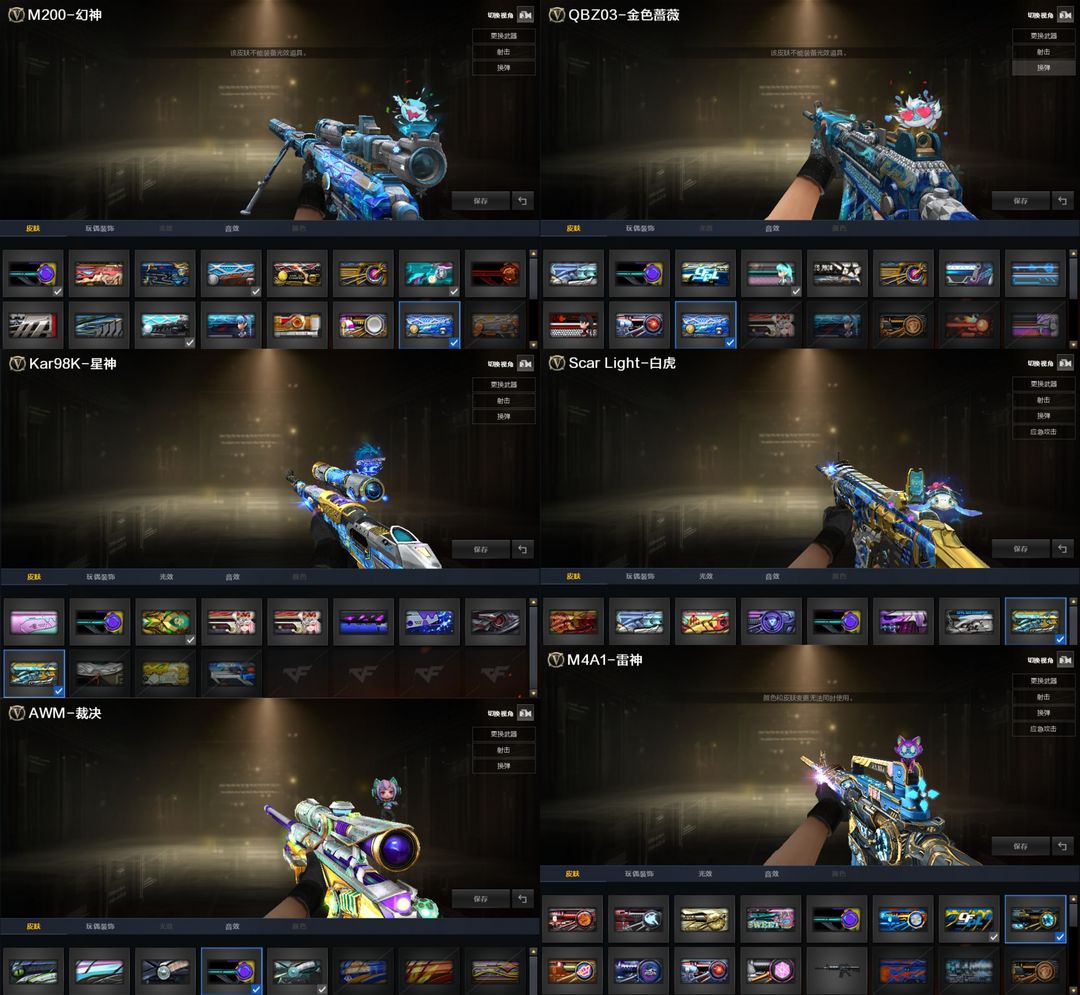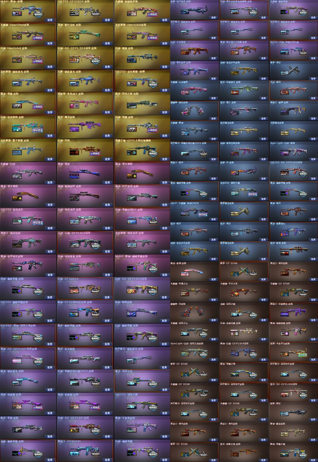 星骇-影煞-艾莉莎-圣谕-幽瞳-辉光-破晓*2-幽冥,神秘礼盒背包,雷神臻藏版,幻神-EP-欧欧-AGS24冠军-白鲨2023-女团-星火小队-星耀-巅峰荣耀-白鲨2022-AGS17-CFS2022-曹操-丹凤-电流骇客-动感闪耀-音效卡,星神-黯钢战甲-冠军之星-AG冠军-傲竹金蛇-巅峰荣耀-漫游-璀璨-枪娘默*2-音效卡,裁决-音效卡-巅峰荣耀-流光秘银-叶芒苍灵-羽掣-异化之源,白虎-白鲨-冠军之虎-AG冠军-巅峰荣耀-霓虹机甲-大汉风骨-暗星-热带奇洋-音效卡,QBZ03-传奇宠儿-冠军之薇-女团-量子蔷薇-拼搏-破浪逐光-AG冠军-巅峰荣耀-CFS2024-热带奇洋-音效卡,玄豹,天戎,幻影-破浪逐光,银翼,玄武,USP-雷暴*2,USP-冥王*2,冠军之特*3,无冕之王*4,世冠柯尔特,COP*7,炽芒蝶刃*7-白鲨-破浪逐光*4-冠军炽芒*3,冠军之刃,炼狱-奇幻宇宙万象,炼狱-迷你小钢,炼狱*6,盘龙*6,烈龙*6,斯泰尔枪娘*2,异变清道夫-蛇影双骄,MK5-炽火炎龙,毒蜂,QBZ03-威猛悍鲨,MAC-10-千针棘鲨,跳跳鲨,M200-喜狮迎春