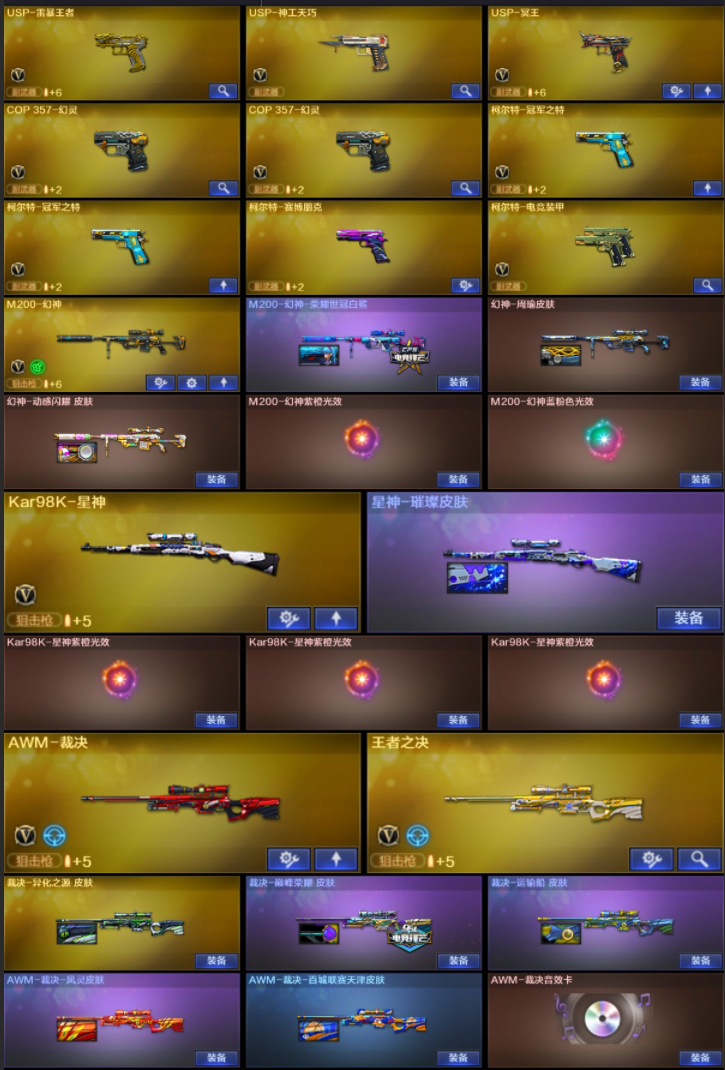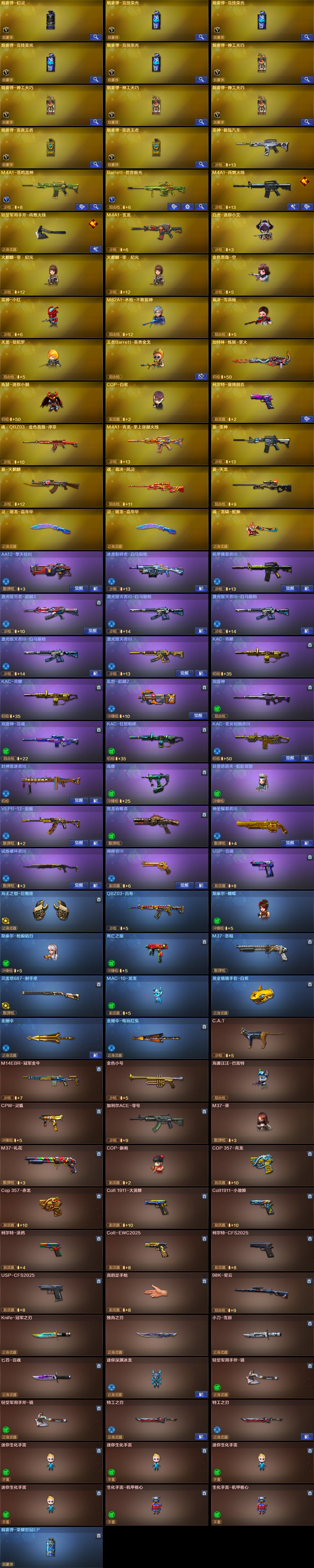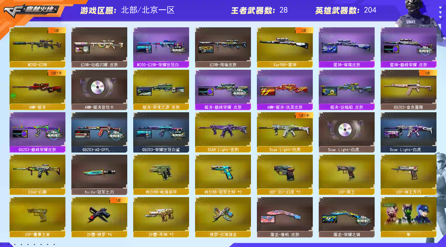 稀有武器】:M200-幻神/Kar98K-星神/ScarLight-白虎/M14EBR-玄武(2)/M4A1-青龙/HK417-朱雀/M4A1-幻灵/M4A1-神工天巧/柯尔特-电竞装甲/COP357-幻灵(2)/USP-神工天巧/天神-动感闪耀/修罗-云海游龙/柯尔特-冠军之特(2)/QBZ03-金色蔷薇/AK47-火麒麟/M4A1-黑龙/M4A1-雷神/M4A1-黑骑士(4)/AK47-无影/AK47-黑武士/白虎-电玩蓝兔/Barrett-毁灭(2)/Barrett-极光(2)/AWM-裁决/Barrett-电竞装甲/RPK-盘龙(6)/加特林-炼狱/汤姆逊-烈龙(6)/AA-12-雷霆/炽芒蝶刃/麒麟刺-堕天神/龙啸-堕天神/马来剑-夜魔/尼泊尔-电竞装甲/幻灵之锋/擎天-竞技荣光/唐刀-神工天巧 【王者武器】:QBZ-03-王者蔷薇-觉醒版/王者之光-觉醒版/王者之决-觉醒版 【热门角色】:迷迭香/晴雅/沙漠玫瑰/鹰/影豹/月兔特工/隼/魅影/乔伊教练/王者春/王者-魅影/王者潘多拉/灵狐者-职业经理/女主播/潘多拉-X/兔囡囡/幽/职业选手/潘多拉 【热门音效卡】:AWM-裁决音效卡/Scar Light-白虎音效卡/HK417-朱雀音效卡/加特林-炼狱音效卡/M4A1-雷神音效卡/Barrett-毁灭音效卡/M4A1-黑骑士音效卡/Barrett-极光音效卡 【热门皮肤】:M200-幻神-荣耀世冠白鲨/幻神-周瑜皮肤/幻神-动感闪耀皮肤/裁决-巅峰荣耀皮肤/裁决-异化之源皮肤/M4A1-雷神-巅峰荣耀皮肤/QBZ03-巅峰荣耀皮肤/火麒麟-荣耀世冠AG/擎天-冠军之击/死神-机甲核心皮肤/星神-璀璨皮肤/毁灭-直播专属/QBZ03-AG-CFPLS19冠军/传奇石头-横秒之巅/火麒麟-战神关羽/QBZ03-荣耀世冠白鲨/毁灭-战神张飞/ScarLight-白虎-暗星/毁灭-冠军之怒/黑骑士-AG-S4冠军典藏/屠龙-荣耀之锋/屠龙-春桃皮肤/雷神-冠军之魄 【其他亮点】:斯泰尔-蝴蝶/炼狱-迷你小钢/Knife-冠军之刃/白虎-迷你小艾/金色蔷薇-空/柯尔特-赛博朋克/毒蜂/VEPR-12-金魔/斯泰尔-枪娘暗刃/贝雷塔687-射手座/MAC-10-龙宝/黄金猫猫手套-白鲨/金刚伞-电玩红兔/M14EBR-冠军金牛/哔哩哔哩名片 (截图展示段位不代表实际段位,如赛季更新等不可抗拒因素发生变化,其余道具看截图或咨询客服);USP-雷暴王者,柯尔特-冠军之特,炽芒蝶刃,Knife-冠军之刃,沙漠玫瑰,隼,晴雅,