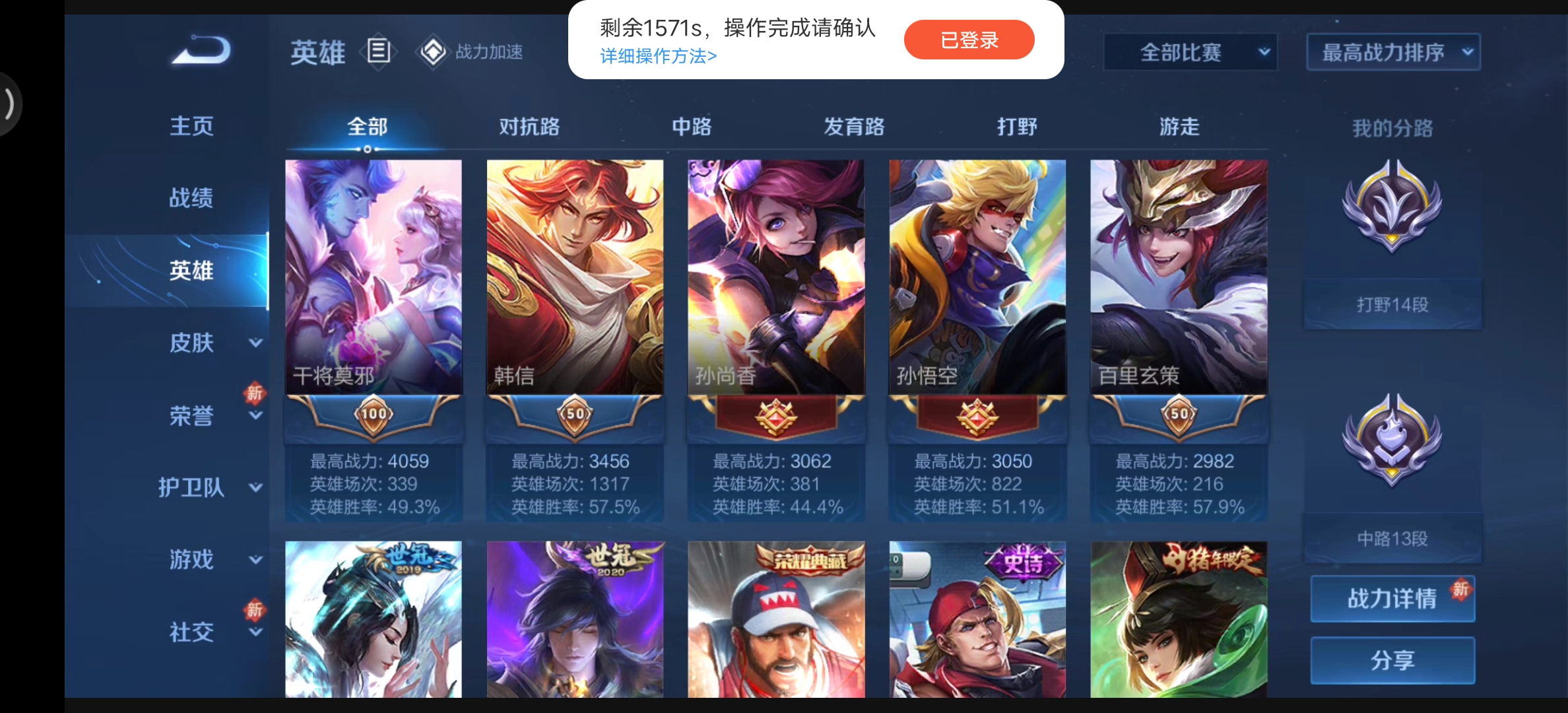 扫码登录🌸小黄鸭个性小兵🌸V10🌸500皮肤🌸韩信典藏🌸9颗荣耀水晶🌸安卓Q153区🌸已禁言,禁止巅峰赛