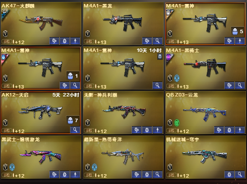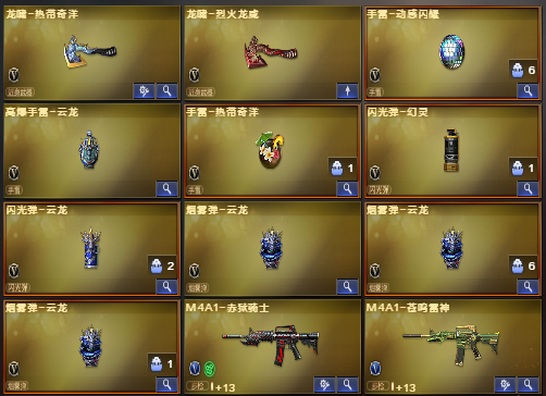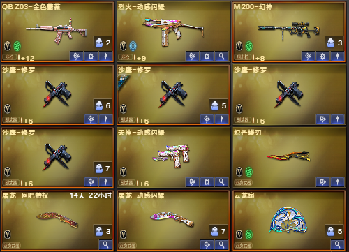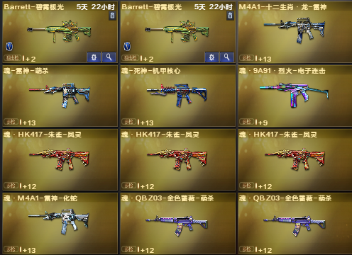英雄武器:M4A1-黑骑士;屠龙;麒麟刺;AK47-火麒麟;Barrett-毁灭;M4A1-雷神;无影-神兵利器;QBZ03-金色蔷薇;HK417-朱雀;Kar98K-星神;黑武士-锦绣游龙;黑骑士-海王;Barrett-朱雀 装饰品:M4A1-千变-孔明皮肤;火麒麟-平天大圣;曼陀罗玩偶;火麒麟-心动糖果;黑骑士-AG-S4冠军典藏 角色:堕天使;复仇者;雷霆-β;潘多拉;嘉年华灵狐;木兰;游珑儿;救世复仇;风暴女;猎狐者-X;海宝;麻雀;暗夜-X 道具:(极限战斗背包);
