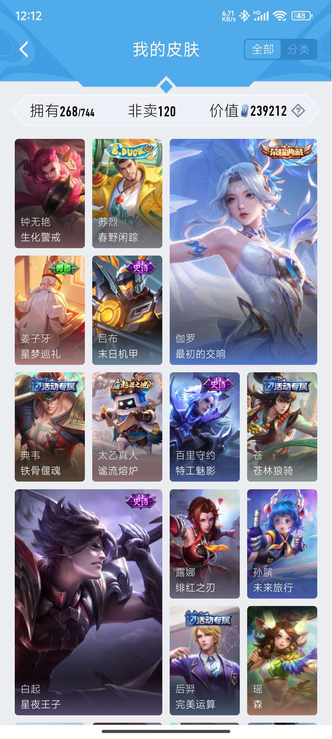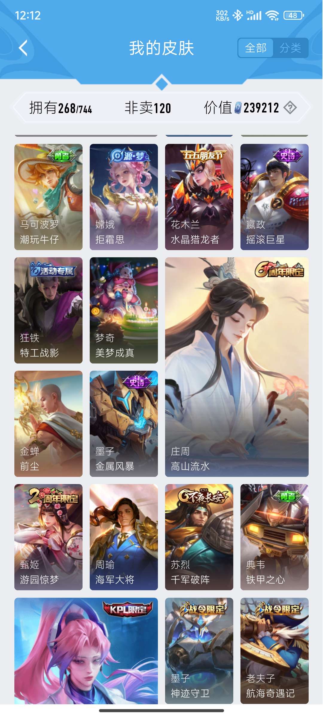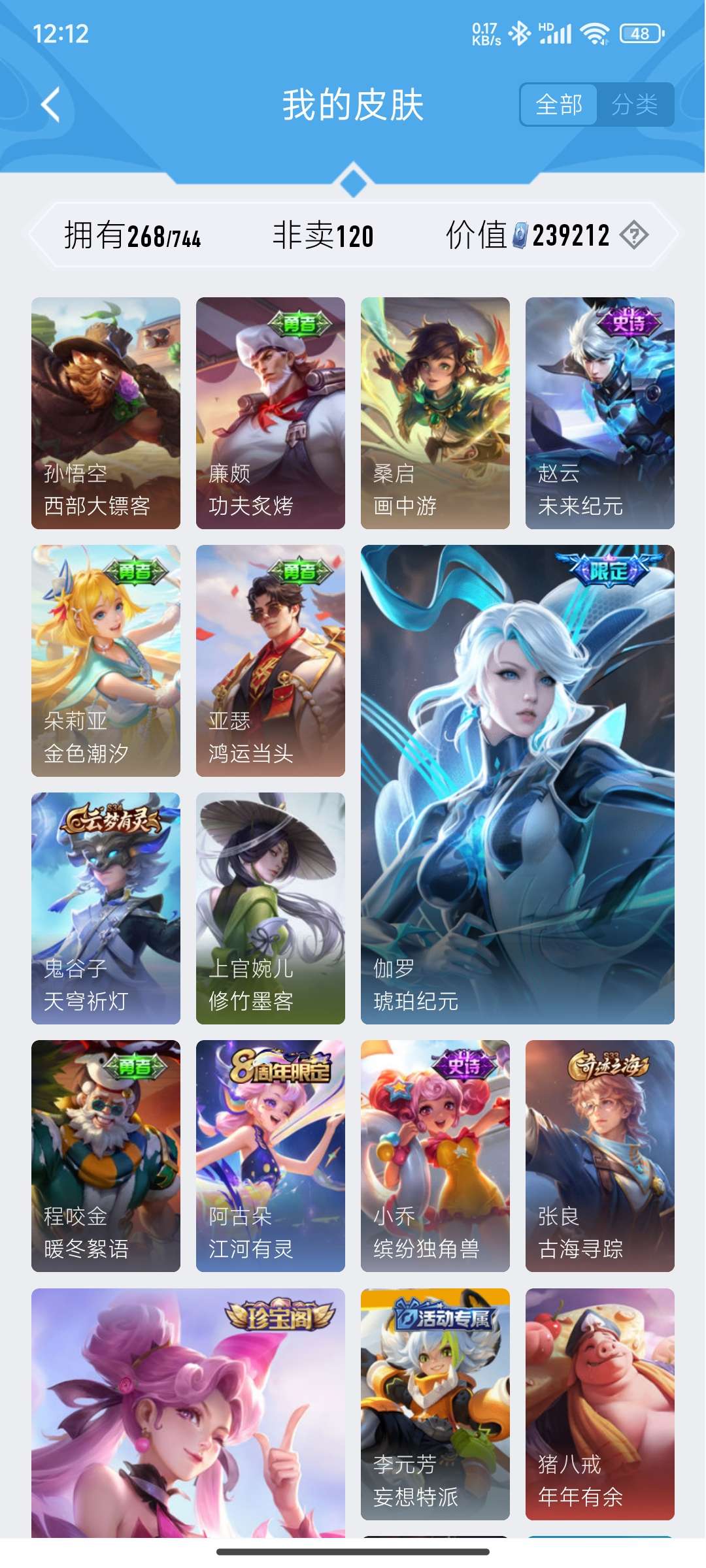 全英雄❤️268个英雄皮肤皮肤 荣耀典藏三个❤️分别是,孙悟空(全息碎影)小乔(天鹅之梦)伽罗(最初的交响)限定102个❤️史诗89个❤️传说9个等其他一系列皮肤❤️欢迎各位老板下单哦❤️爱你们🥰🥰