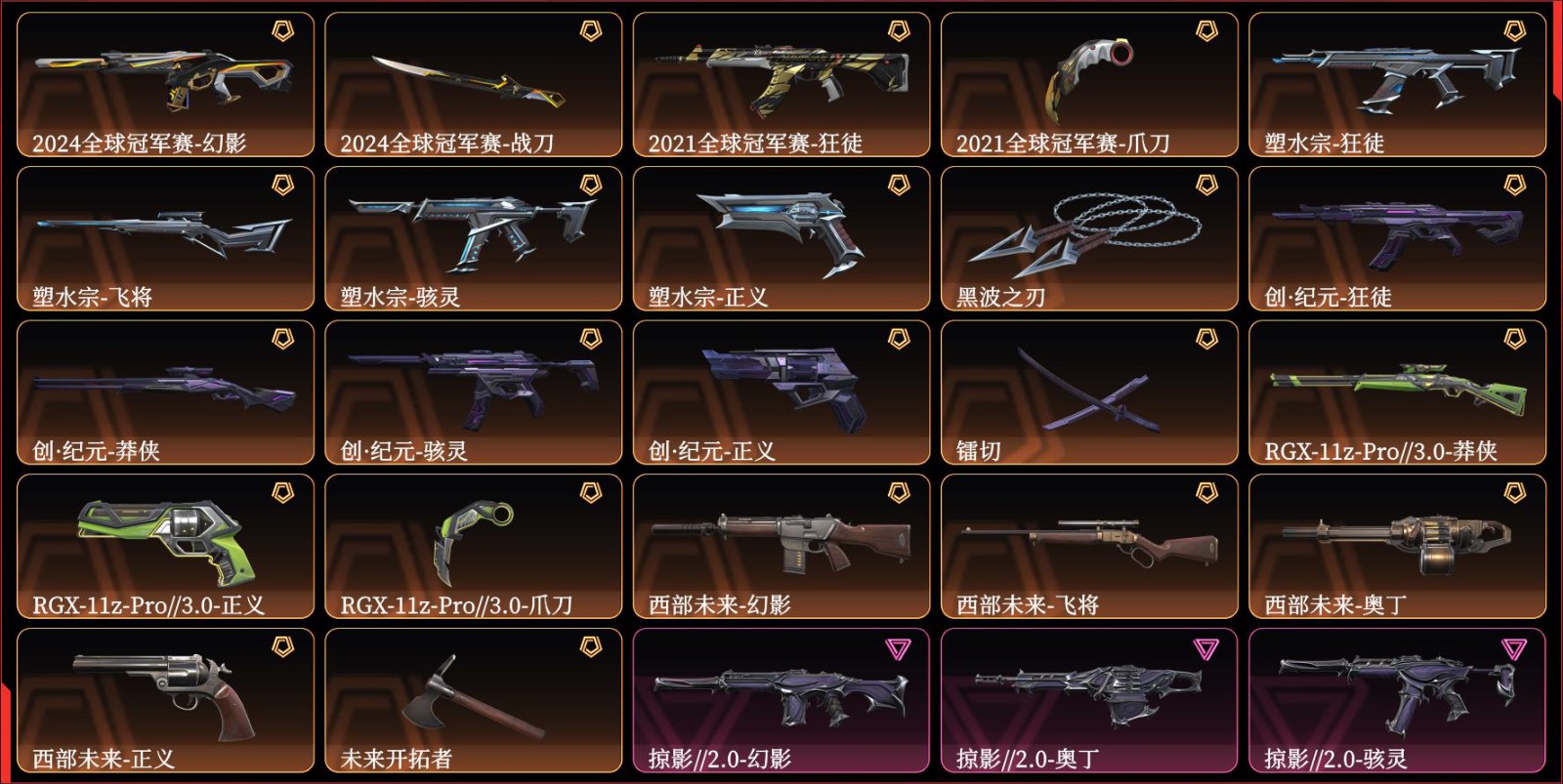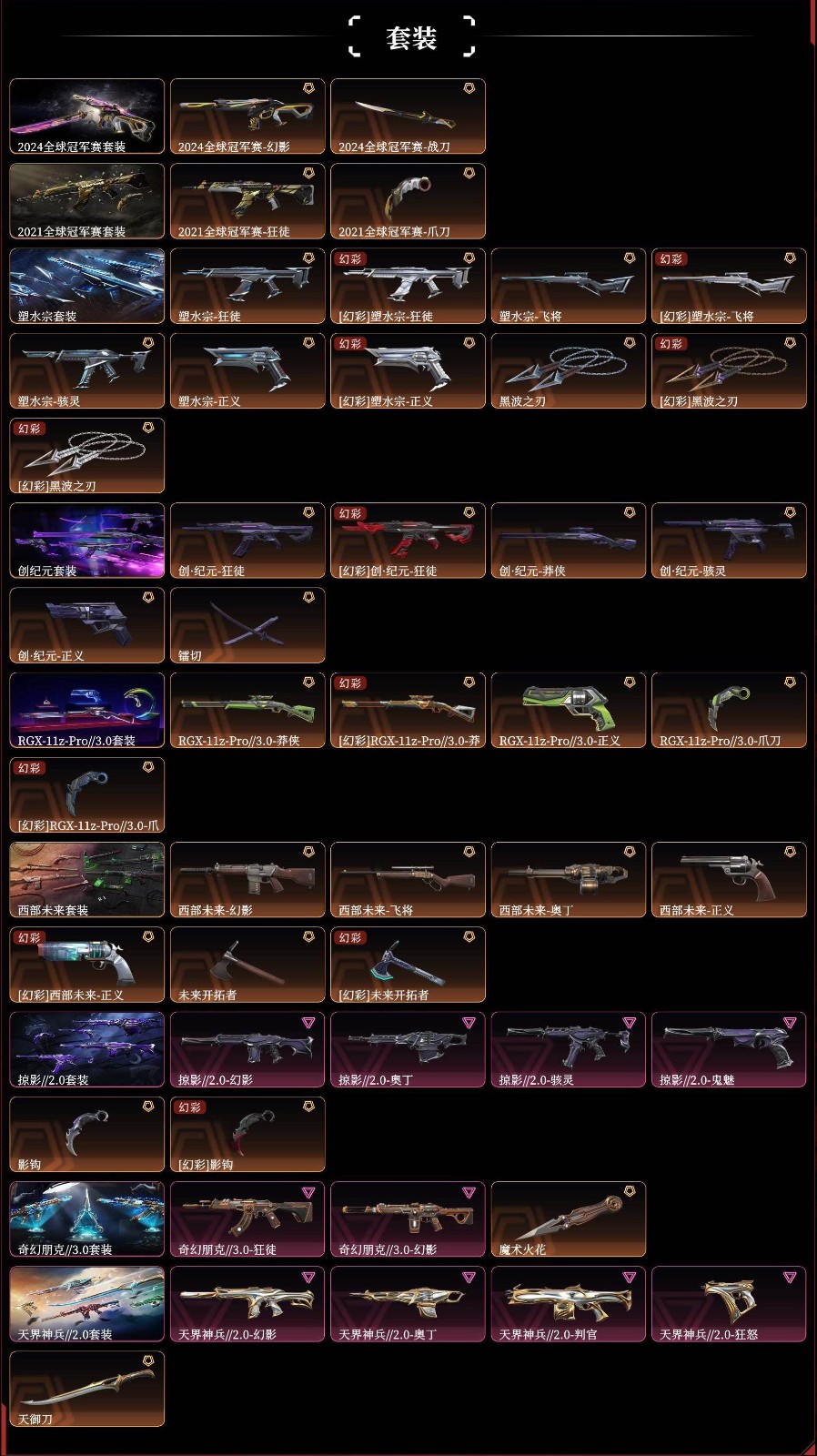 【拥有套装】掠影//2.0套装(掠影//2.0-幻影,掠影//2.0-奥丁,掠影//2.0-骇灵,掠影//2.0-鬼魅,影钩)西部未来套装(西部未来-幻影,西部未来-奥丁,西部未来-飞将,西部未来-正义,未来开拓者)创纪元套装(创·纪元-狂徒,创·纪元-莽侠,创·纪元-骇灵,创·纪元-正义,镭切)塑水宗套装(塑水宗-骇灵,塑水宗-狂徒,塑水宗-飞将,塑水宗-正义,黑波之刃)2024全球冠军赛套装(2024全球冠军赛-幻影,2024全球冠军赛-战刀)2021全球冠军赛套装(2021全球冠军赛-狂徒,2021全球冠军赛-爪刀)RGX-11z-Pro//3.0套装(RGX-11z-Pro//3.0-莽侠,RGX-11z-Pro//3.0-正义,RGX-11z-Pro//3.0-爪刀)天界神兵2.0套装(天界神兵//2.0-幻影,天界神兵//2.0-奥丁,天界神兵//2.0-判官,天界神兵//2.0-狂怒,天御刀)奇幻朋克3.0套装(奇幻朋克//3.0-狂徒,奇幻朋克//3.0-幻影,魔术火花)