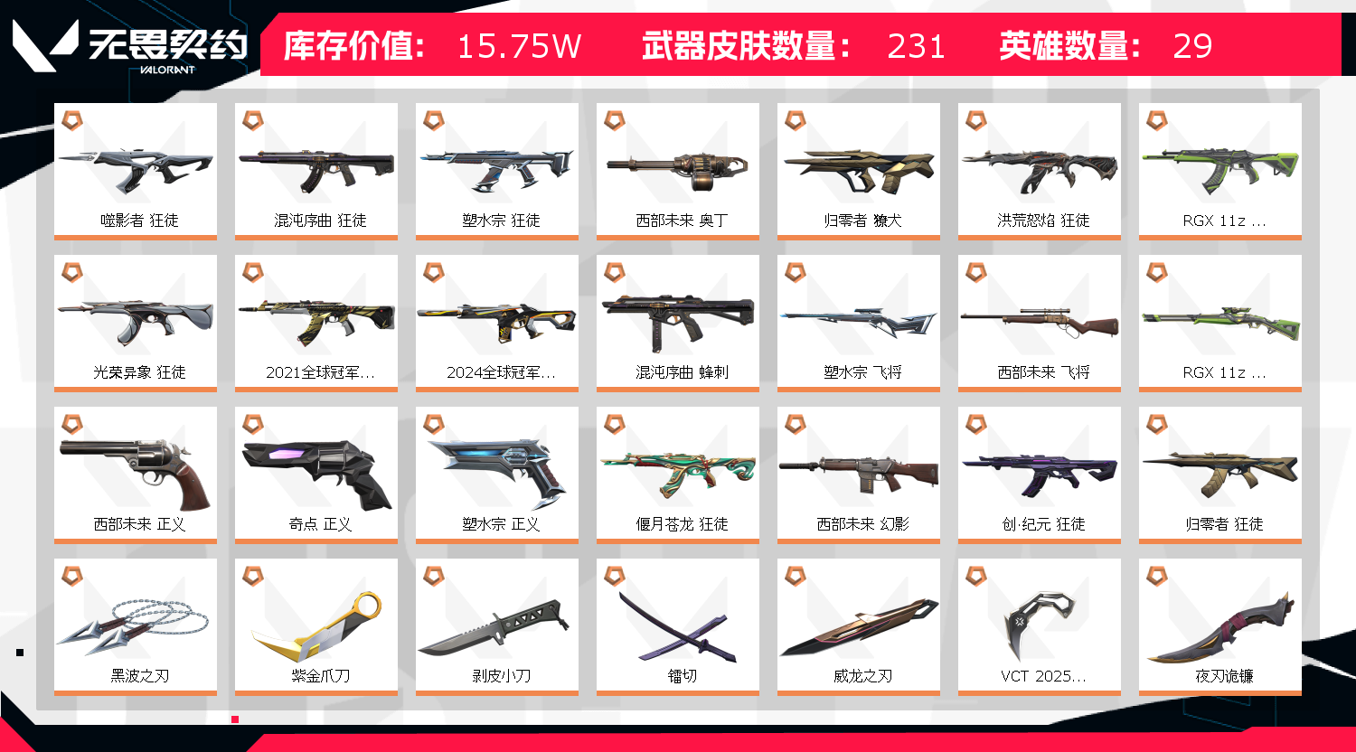 【卡面信息】势不可挡捷风卡面,狼人猎手卡面,我眼中的世界卡面,情人节捷风卡面,VCT2025CN联赛卡面,西部未来卡面,先驱者卡面,神射卡面,分崩离析卡面,双城之战拥抱卡面,RGX11zPro30卡面,超能偶像卡面,许愿星砂卡面,虹吸式咖啡壶卡面,天界神兵20卡面,逆向独行卡面,塑水宗卡面,势不可挡芮娜卡面,Luie卡面,;西部未来 奥丁,黑波之刃,紫金爪刀,剥皮小刀,镭切,威龙之刃,VCT 2025 爪刀,