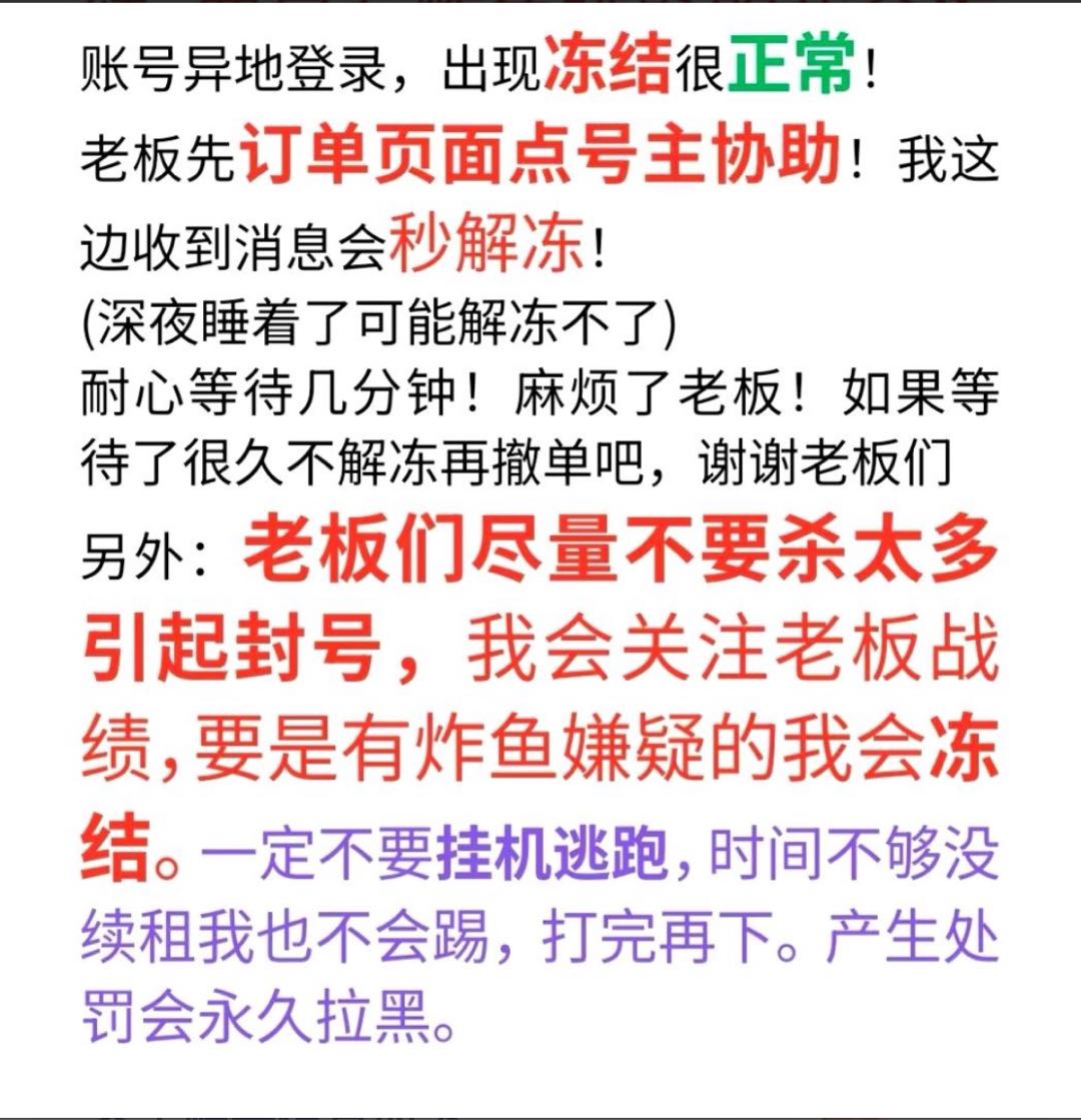 【欢迎光临 下单用户需注意一下几条租凭】 ★禁止游戏内挂机逃跑、辱骂、诈骗送皮肤非法牟利。 ★恶意撤秒改密码顶号拉黑申诉追回租金 ★禁止恶意毁号 开外挂 美化包等非法工具如有发现会上报平台内部技术封杀所有账户IP以及关联账户【如有发现 严惩不贷】 ●以下违规情况保证金不给 ①该账号禁止改非主流名字 ②违规导致 信誉积分减少 ③非法发言导致账号禁言 ④聊天记录出现诈骗记录 【文明素质游戏 让我们共建美好租号平台】;