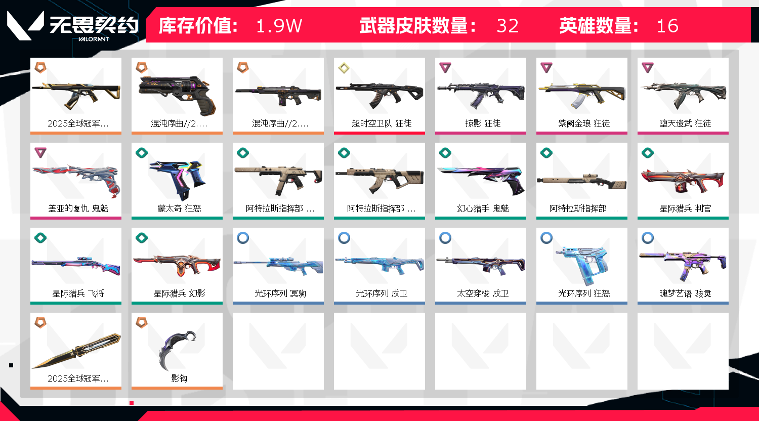 首页 > 租号大厅 > 无畏契约-wegame > wegame/wegame > 2025冠军套装✨影钩✨超时空 堕天 紫金 掠影狂徒✨混沌2.0幻影✨混沌2.0正义