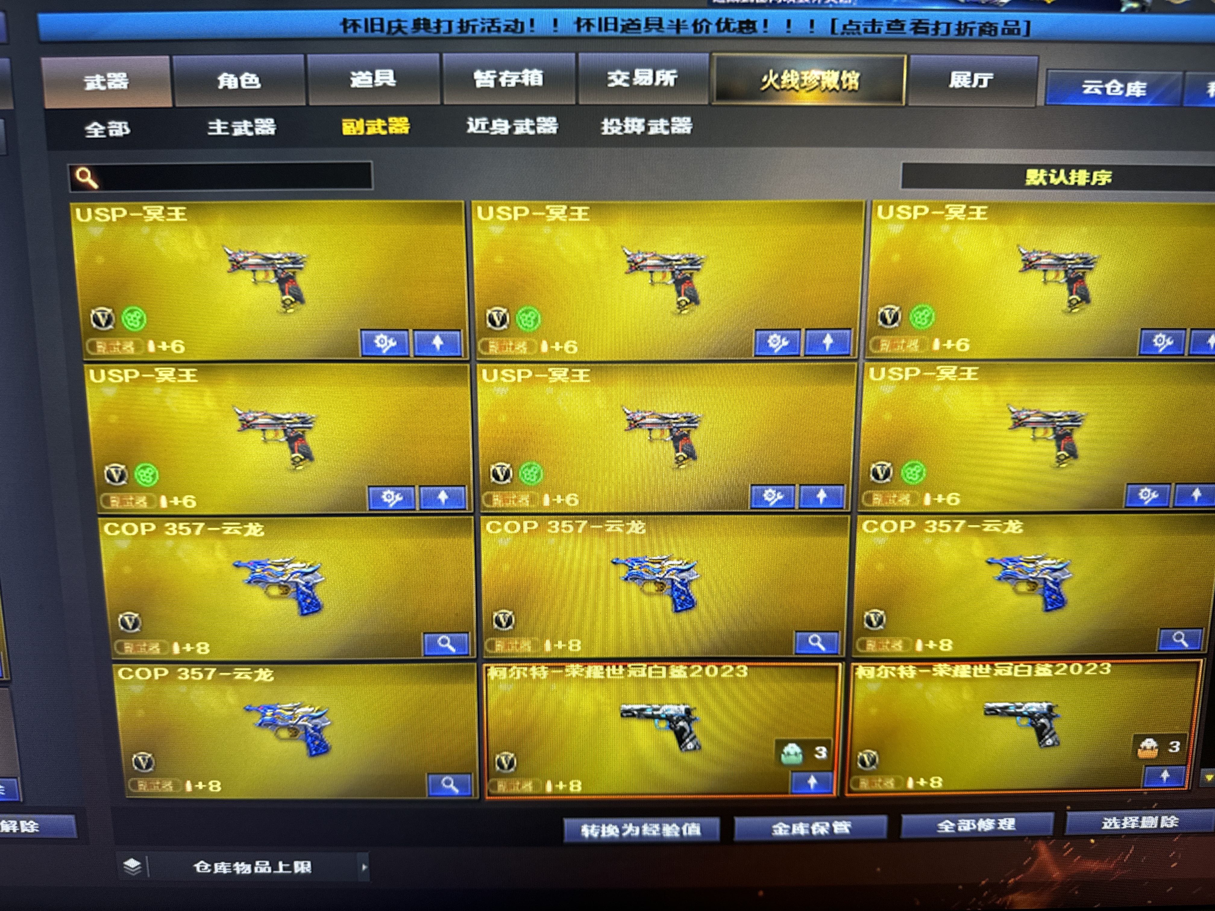 禁止挂机,禁止开挂,帐号已经备案,出现问题依法追究!!!游戏玩的愉快;USP-雷暴,柯尔特-荣耀世冠白鲨2023,传说幽冥,柯尔特-冠军之特,炽芒蝶刃,Knife-冠军之刃,传说影煞,