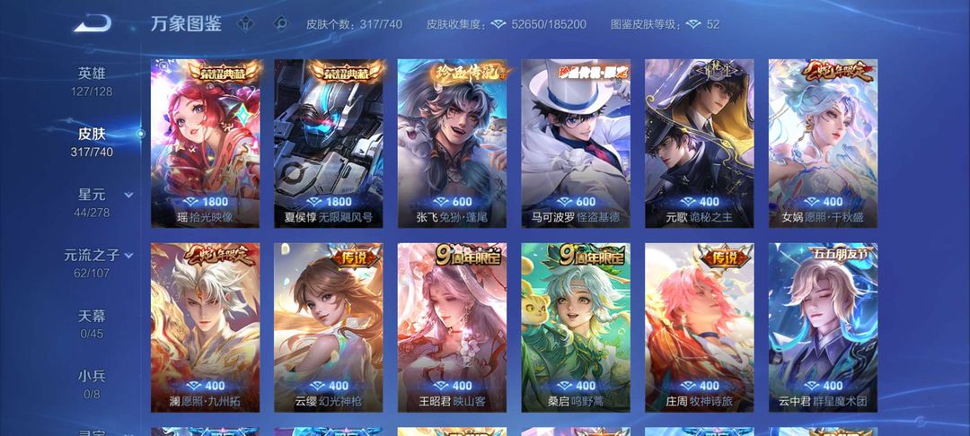 V11✨732皮肤✨神罪✨山海经天机白泽✨全套死神联动✨全套穆夏✨馥梦繁花✨美神临世✨库洛米✨大耳狗✨全荣耀水晶✨螭龙剑✨全无双