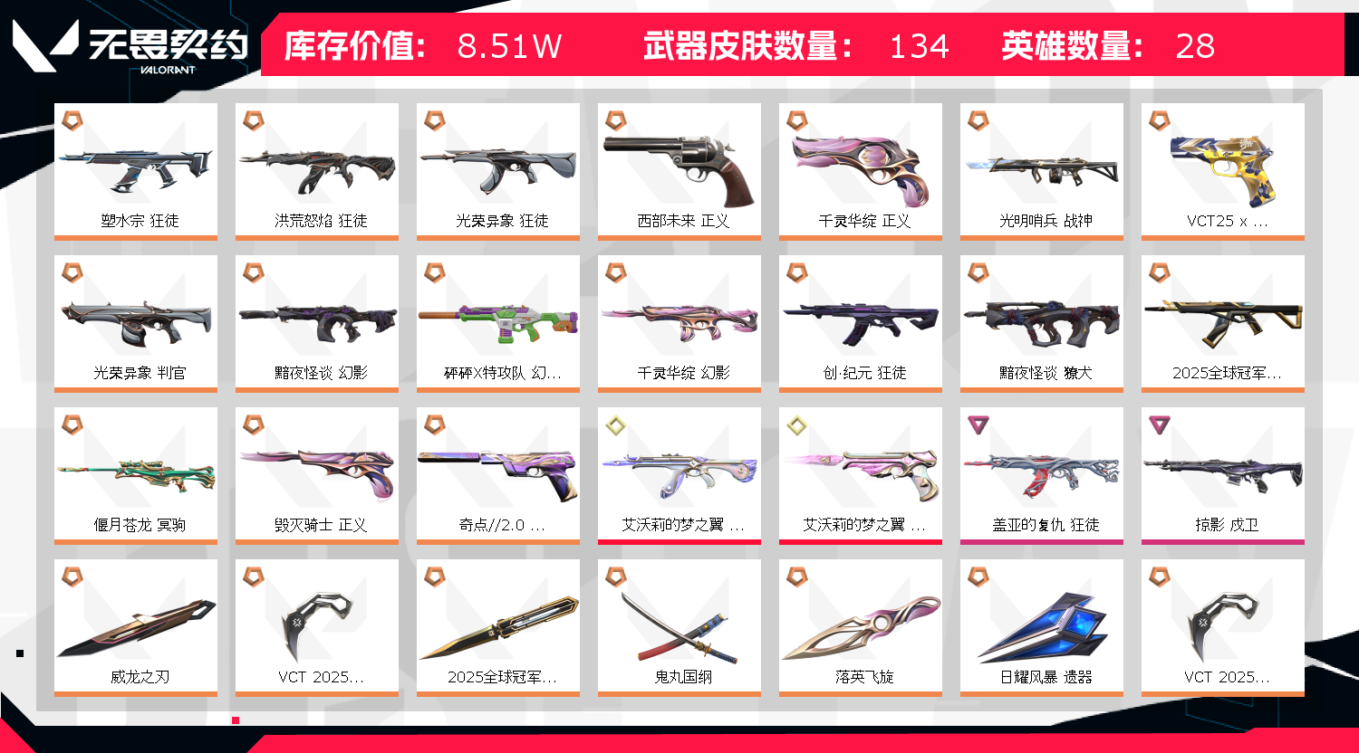 如遇异地冻结,请点击解除冻结后稍等几分钟即可正常登录,感谢等待,禁止开挂,否则必报案追究,禁止挂机,需要调试测试请在训练营,不要实战开了又挂机,感谢配合,喜欢收藏 禁止开挂/挂机/违规行为拉黑;威龙之刃,VCT 2025 爪刀,盖亚的复仇 狂徒,掠影 戍卫,洪荒怒焰 狂徒,异鳞魔蛇 幻影,侦察力量 幻影,