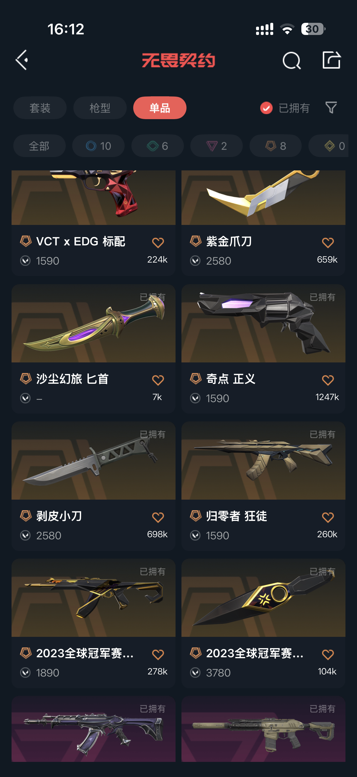 允许 英雄26 武器皮肤数量26;紫金爪刀,剥皮小刀,掠影 狂徒,侦察力量 幻影,2023全球冠军赛 狂徒,奇点 正义,