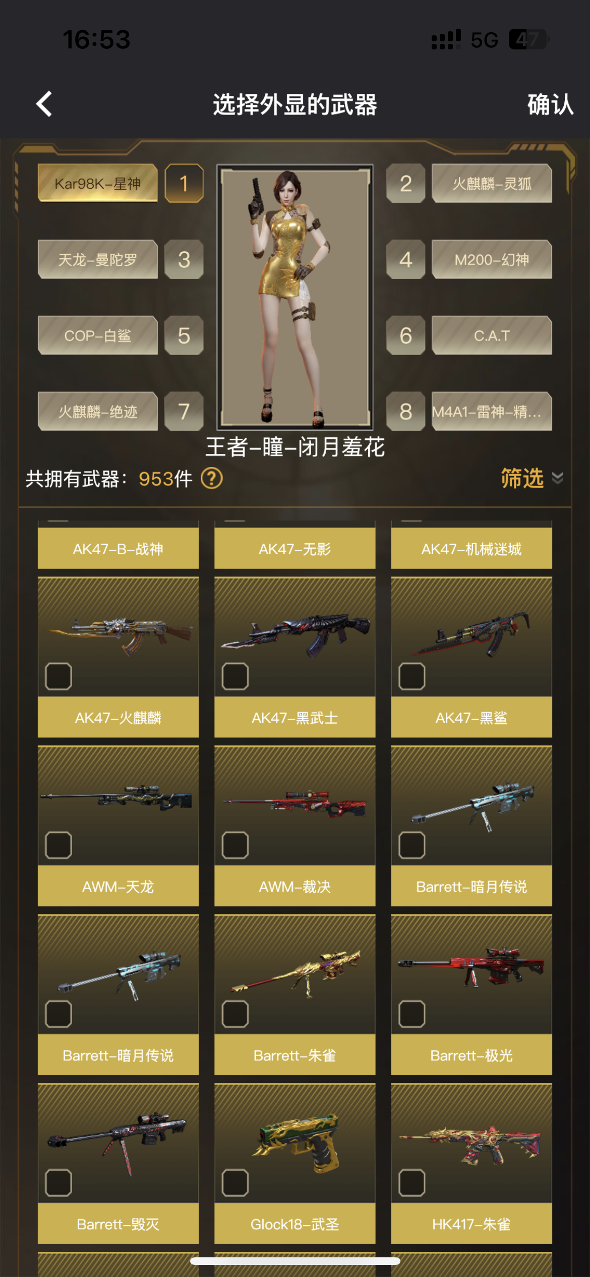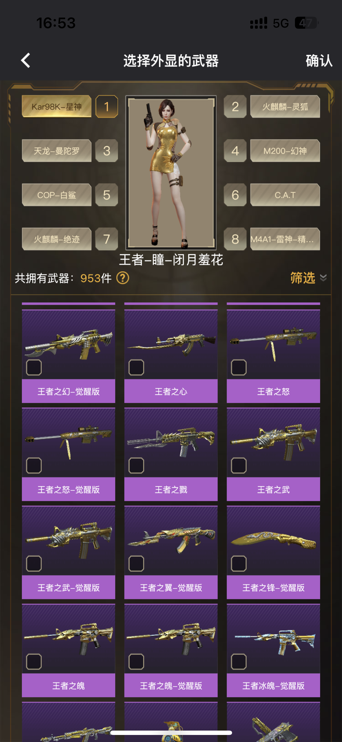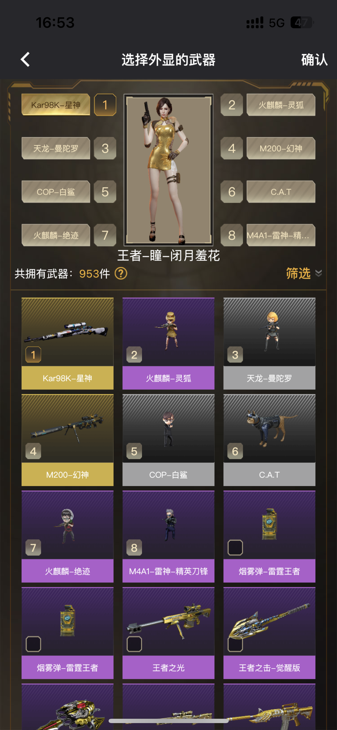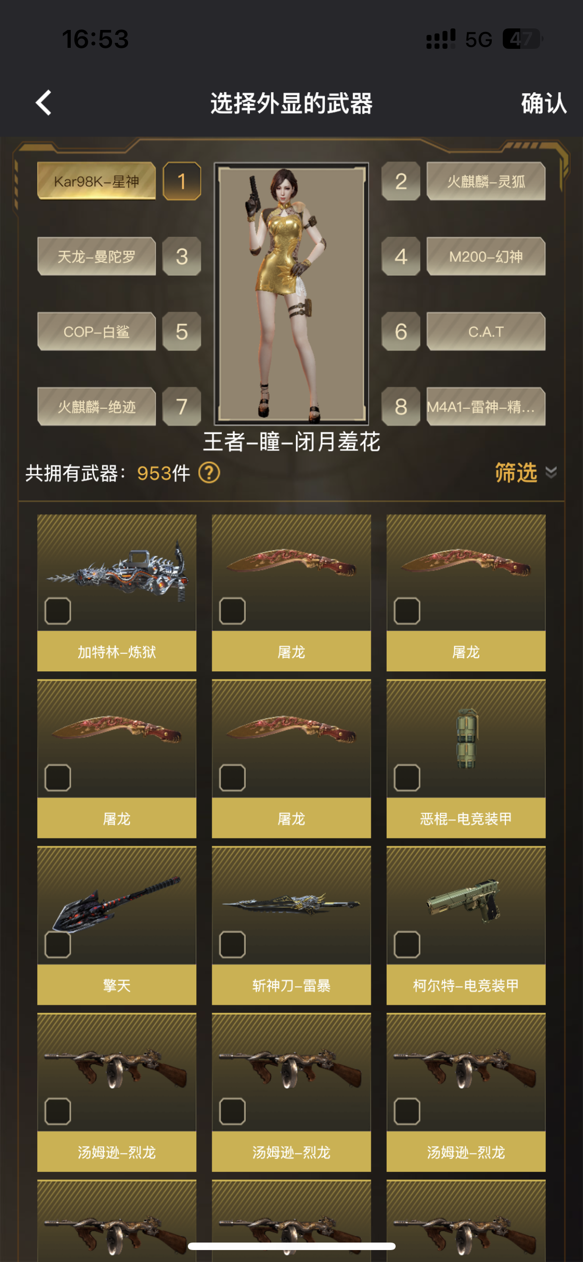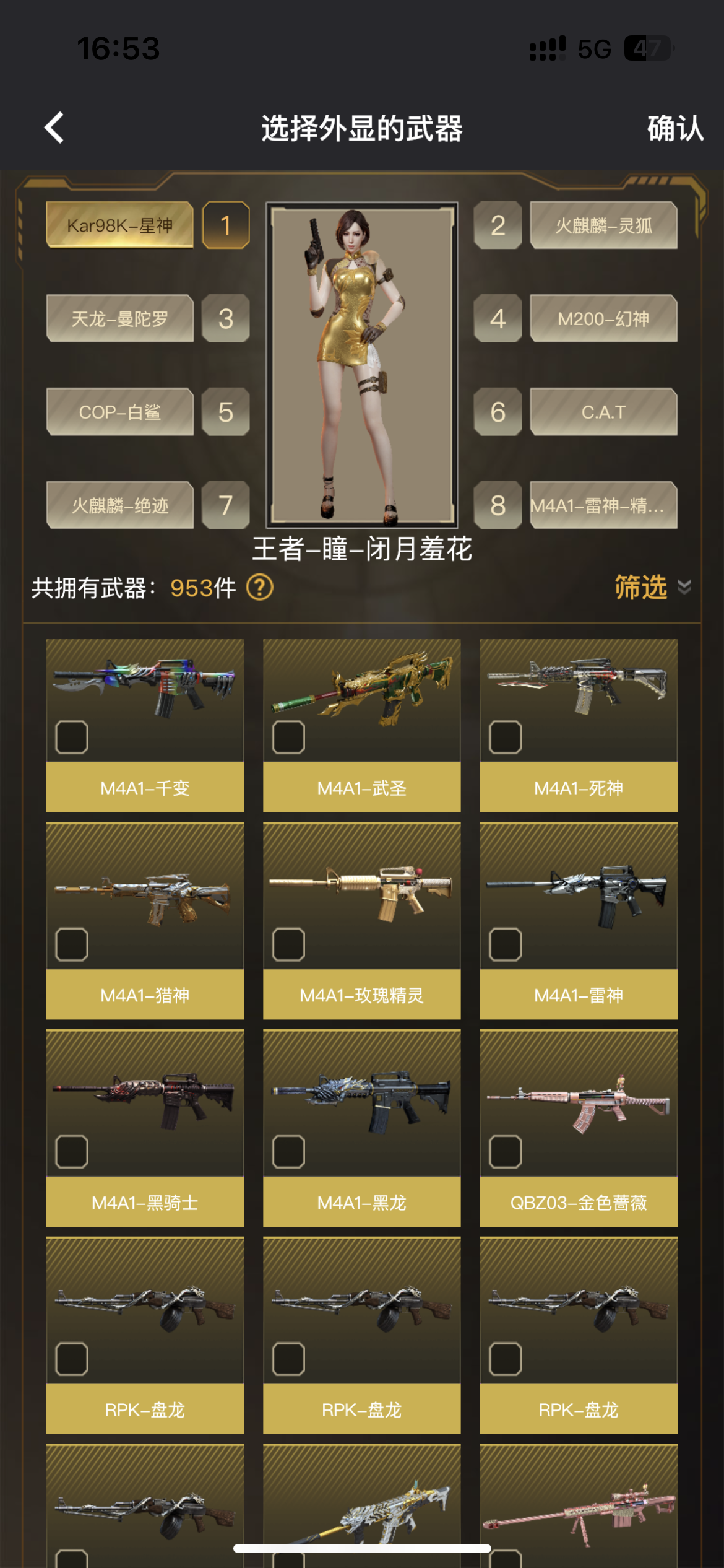 装备皮肤也有不少未挨个列出;RPK-盘龙,QBZ03-金色蔷薇,M200-幻神,Scar Light-白虎,Kar98K-星神,