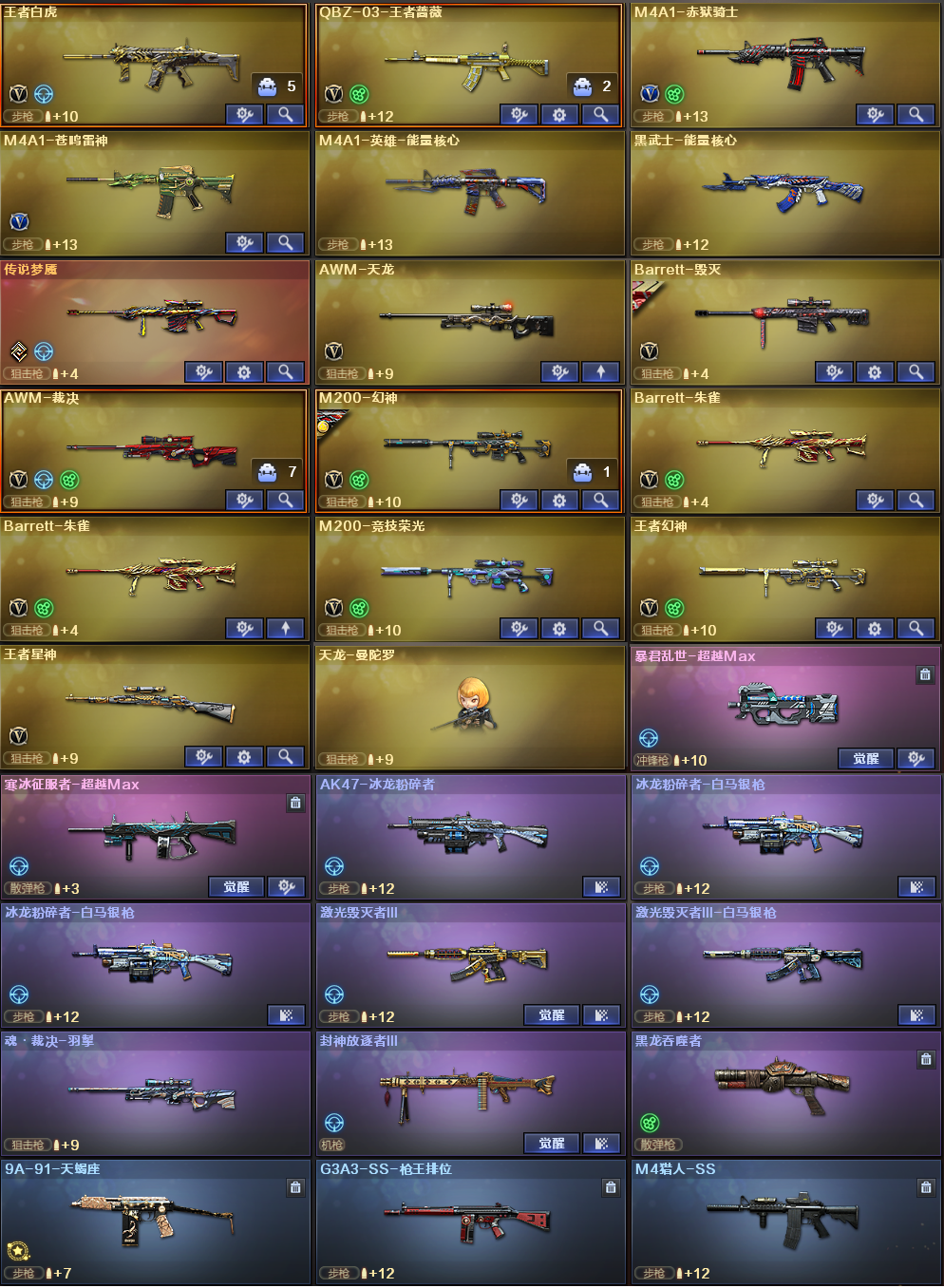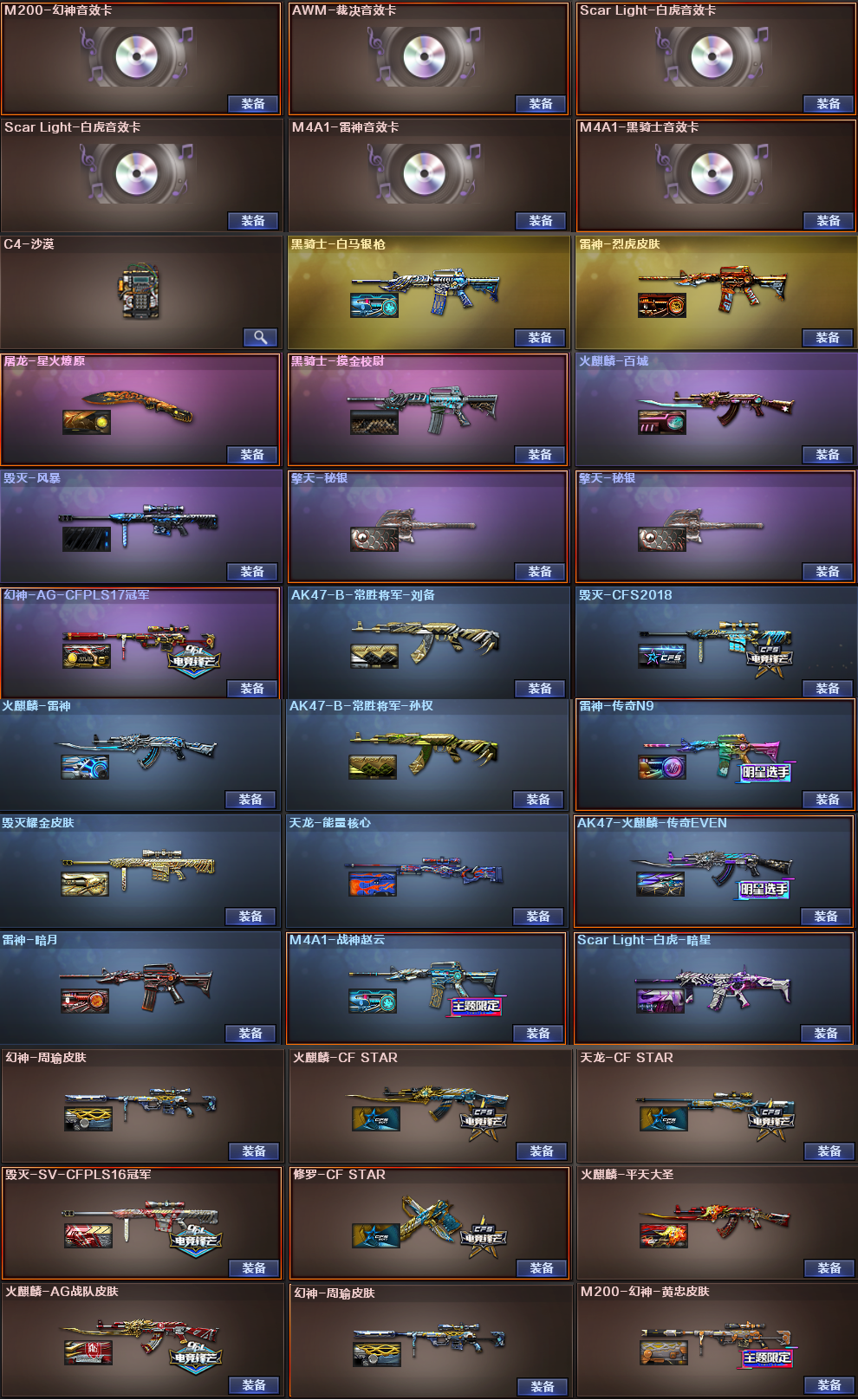 传说梦魇✅幻神4件套+云悠悠✅6烈龙死亡之眼+6盘龙炼狱✅世冠柯尔特✅白虎3件套✅裁决音效✅堕天神全套✅竞技荣光全套 稀有武器:传说梦魇、M200幻神、7把烈龙+死亡之眼、6把盘龙+2把炼狱+炼狱惊涛骇浪、荣耀世冠柯尔特、USP雷暴、M200竞技荣光、QBZ金色蔷薇、HK朱雀、SL白虎、M4堕天神、火麒麟、黑龙、雷神X2、黑骑士X3、黑武士X2、天启、超新星、机械迷城、黑鲨、龙血、黑武士锦绣游龙、玫瑰精灵、猎神、烈火、黑武士CF网剧冠军武器套装X2、黑骑士海王、荣耀世冠雷神、天龙、毁灭、裁决、Barrett朱雀X2、修罗X3、天神X2、COP堕天神、COP幻灵X2、柯尔特竞技荣光、天神CF网剧冠军武器套装X2、COP雷霆王者、屠龙X3、龙啸X9、擎天X3、麒麟刺、麒麟刺堕天神X2、龙啸堕天神X2、幻灵之锋X2、擎天竞技荣光、擎天CF网剧冠军武器套装X2、雷霆王者之锋、暴君乱世-超越MAX、寒冰征服者-超越MAX、冰龙粉碎者、冰龙粉碎者-白马银枪X2、激光毁灭者3-白马银枪、封神放逐者3、黑龙吞噬者 稀有角色:电竞教官云悠悠(四防:减少闪光效果/免疫队友炸弹伤害/减少掉落伤害/副武器自动装弹)、迷迭香、雨棠(四防:减少闪光效果/免疫队友炸弹伤害/减少掉落伤害/副武器自动装弹)、王者春(四防)、王者葵貂蝉(四防)、王者迷迭香(四防)、王者玲珑、王者玲珑小乔 (四防:额外弹匣生化+捕食者之眼+生化子弹穿透+佣兵觉醒无需换弹)、王者樱热浪之夏、修道士、游珑儿、职业选手 音效卡:幻神音效卡、裁决音效卡、白虎音效卡X2、雷神音效卡、黑骑士音效卡 稀有皮肤:幻神AG-CFSPLS17冠军皮肤/周瑜皮肤/黄忠皮肤、白虎暗星皮肤、黑骑士白马银枪皮肤/摸金教尉皮肤、雷神烈虎皮肤/战神赵云皮肤/暗月皮肤/传奇N9皮肤神秘按键皮肤、火麒麟百城皮肤/CFstar皮肤/雷神皮肤/传奇EVEN皮肤/AG战队皮肤/平天大圣皮肤、毁灭风暴皮肤/SV-CFPLS16冠军皮肤/CFS2018皮肤/耀金皮肤、屠龙星火燎原皮肤、擎天秘银皮肤、天龙能量核心皮肤/CFstar皮肤、修罗CFstar皮肤 王者炫金武器:王者之武觉醒、王者冰魄觉醒、王者之烈觉醒、王者白虎觉醒、、QBZ03王者蔷薇、王者幻神觉醒、王者星神觉醒、王者之锋觉醒、王者之啸觉醒、王者之击觉醒、炫金超新星、炫金火麒麟、炫金骑士、 投掷套装:堕天神套X6、幻灵套X4、竞技荣光套X5、雷霆王者套、王者之魄投掷套X3 小人枪武器特殊武器:王者AK47-萌萌银发刀锋、天龙曼陀罗、巴雷特-零-水下丽影、KAC黑桃战神、牛牛AK47、迷你生化手雷X2;USP-雷暴,荣耀世冠-柯尔特,电竞教官-云悠悠,RPK-盘龙,QBZ03-金色蔷薇,M200-幻神,Scar Light-白虎,