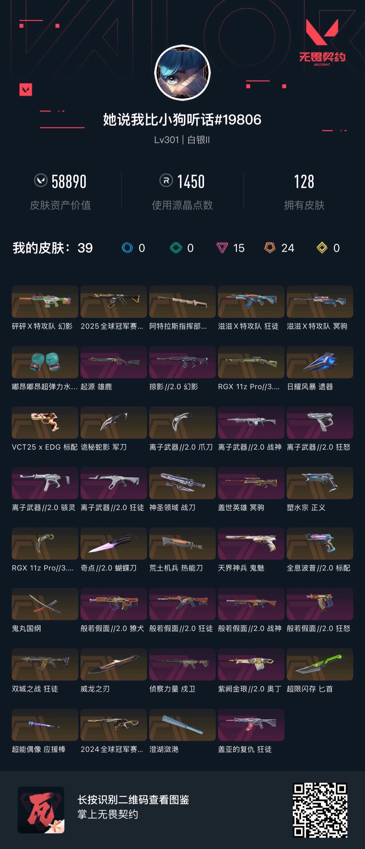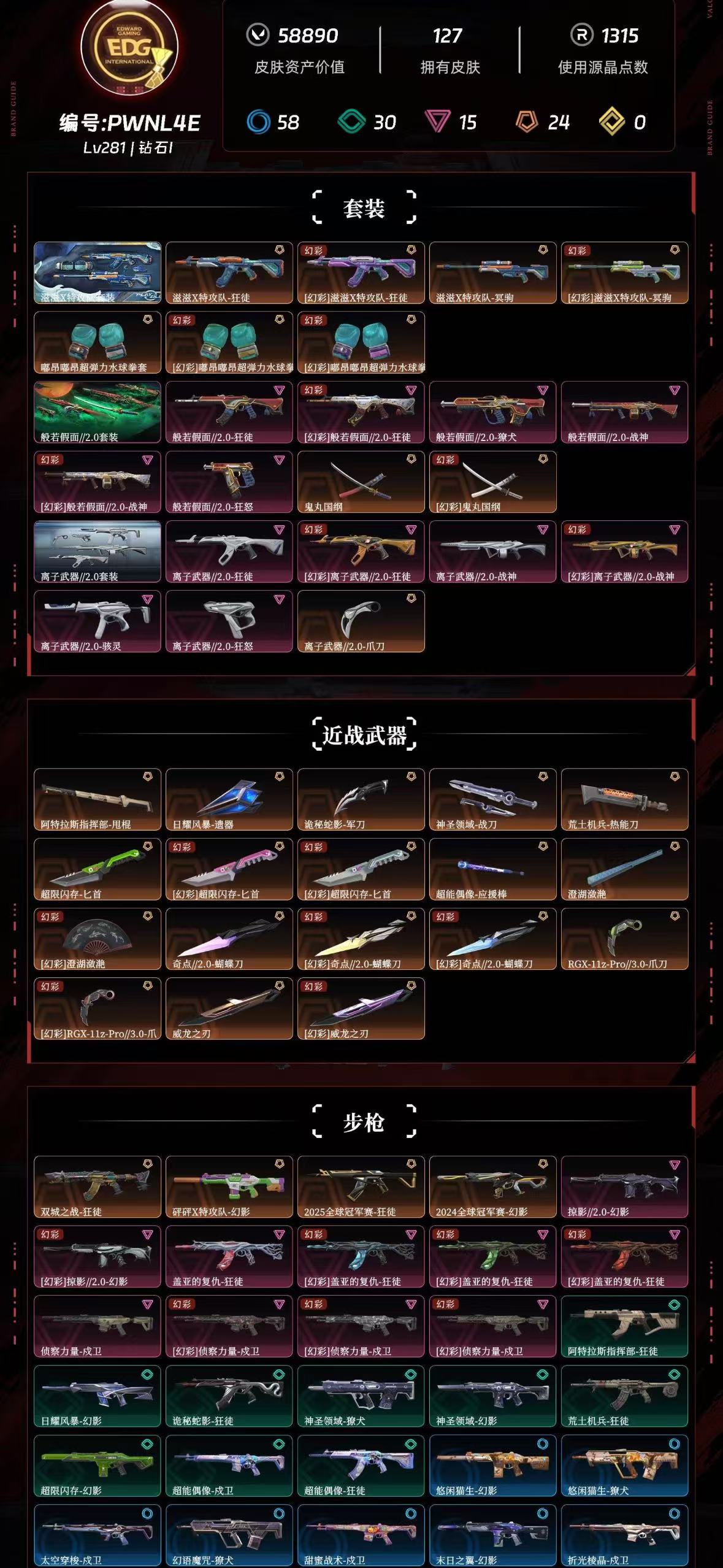 【拥有套装】滋滋X特攻队套装(滋滋X特攻队-狂徒,滋滋X特攻队-冥驹,嘟昂嘟昂超弹力水球拳套)离子武器//2.0套装(离子武器//2.0-狂徒,离子武器//2.0-战神,离子武器//2.0-骇灵,离子武器//2.0-狂怒,离子武器//2.0-爪刀)般若假面2.0套装(般若假面//2.0-狂徒,般若假面//2.0-獠犬,般若假面//2.0-战神,般若假面//2.0-狂怒,鬼丸国纲) 【拥有近战武器】澄湖,奇点//2.0-蝴蝶刀,RGX-11z-Pro//3.0-爪刀,威龙之刃, 【拥有步枪】双城之战-狂徒,砰砰X特攻队-幻影,2025全球冠军赛-狂徒,2024全球冠军赛-幻影,掠影//2.0-幻影,盖亚的复仇-狂徒,侦察力量-戍卫 【拥有狙击枪】RGX-11z-Pro//3.0-莽侠,盖世英雄-冥驹 【拥有机枪】紫阙金琅//2.0-奥丁 【拥有霰弹枪】起源-雄鹿 【拥有手枪】VCT25-x-EDG-标配,塑水宗-正义,全息波普//2.0-标配,天界神兵-鬼魅 【稀有挂件】V25第三幕铂金挂饰;威龙之刃,起源 雄鹿,盖亚的复仇 狂徒,2024全球冠军赛 幻影,离子武器//2.0 狂徒,RGX 11z Pro//3.0 莽侠,天界神兵 鬼魅,