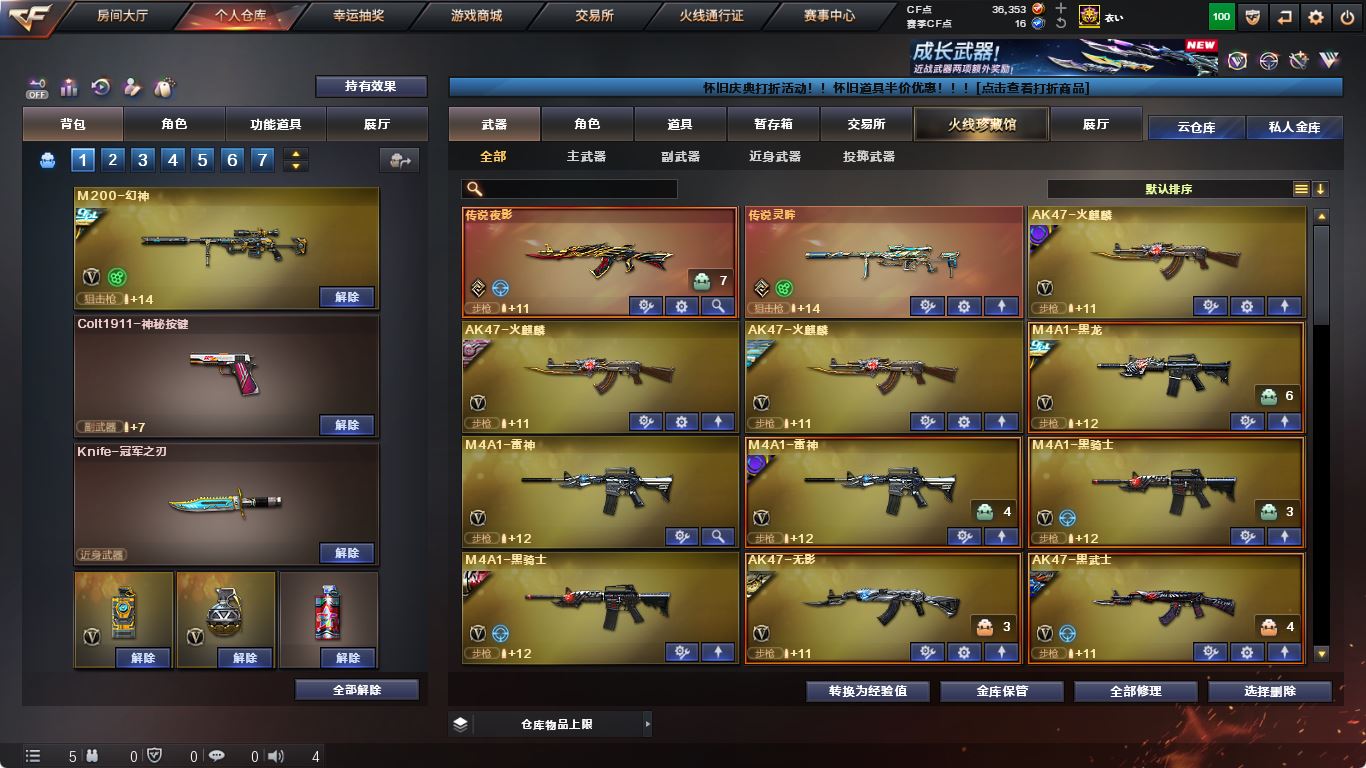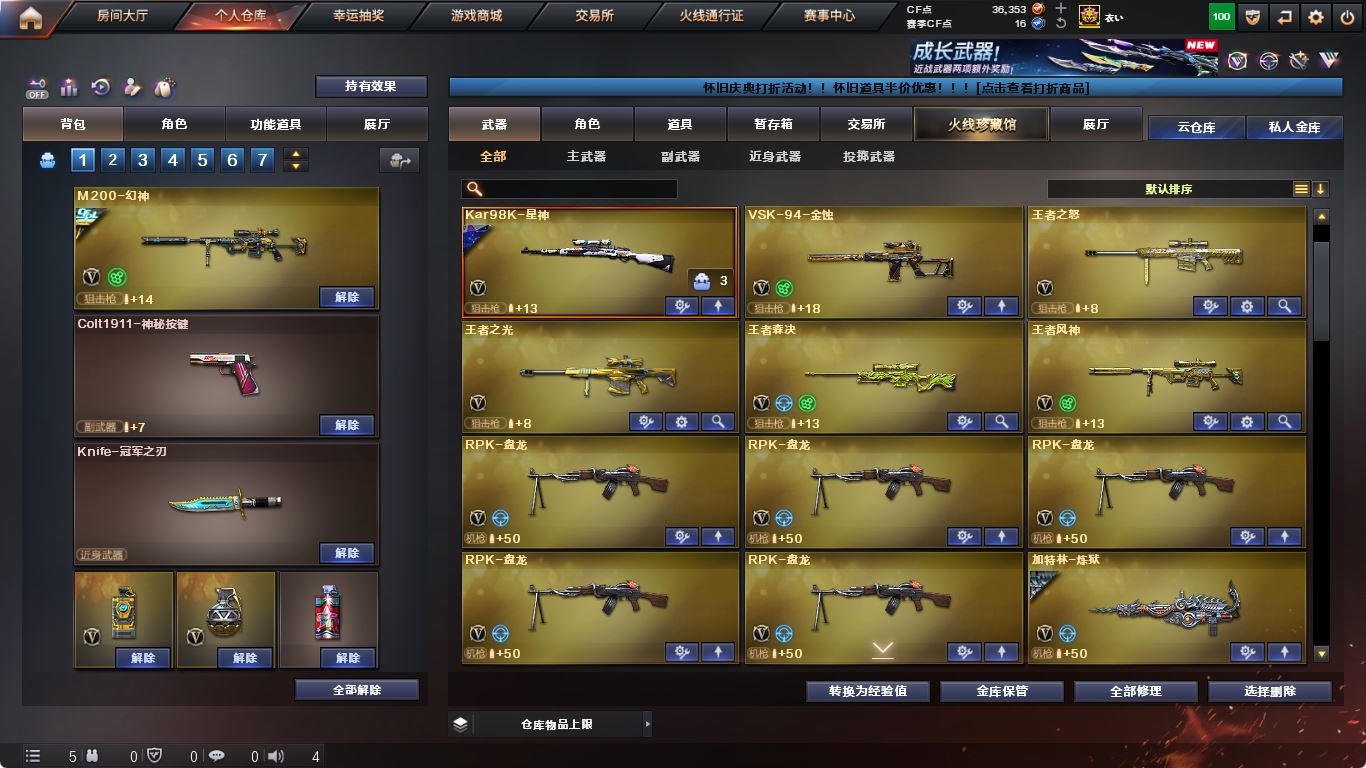 【亮点解析 幻神三件套 Kar98K-星神三件套 裁决三件套】【传说灵眸】【M200-幻神+音效卡+幻神-冠军之幻+幻神-荣耀世冠白鲨+巅峰荣耀+幻神-宠儿+幻神-黄忠】【Kar98K-星神+音效卡+破竹+枪娘默+星神-璀璨】【王者风神】【传说夜影】【ScarLight-白虎+音效卡+虎啸】【QBZ03-金色蔷薇+音效卡+巅峰荣耀】【生化 5盘龙 3炼狱 5烈龙 迷你小钢 蝴蝶】【裁决+音效卡+流光秘银】【毁灭+音效卡+毁灭-冠军之怒+毁灭-荣耀之怒】【极光+音效卡】【八面凌龙】【火麒麟+音效卡+火麒麟-横秒之巅】【黑龙+音效卡】【雷神+音效卡+巅峰荣耀+雷神-lgd18冠军】【黑骑士+音效卡】【王者之魄 白虎之魄 王者之怒 王者之光】【无影 黑武士 天启 hk417-朱雀 玄武】【10手枪 修罗*3 天神*2 cop幻灵*4】【10近战 Knife-冠军之刃 屠龙*2 龙啸 擎天 麒麟刺 幻灵之锋 王者之锋 王者之击】【手雷 幻灵雷*5】【四防 影豹 王者春 王者凌霄 王者零国色天香 王者潘多拉】【幻神音效卡 Kar98K-星神音效卡 裁决音效卡 】;Knife-冠军之刃,RPK-盘龙,QBZ03-金色蔷薇,M200-幻神,Scar Light-白虎,传说灵眸,Kar98K-星神,