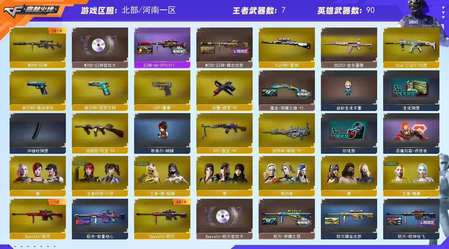 【幻神+幻神ag冠军+幻神黄忠+幻神音效卡】usp雷暴+冠军柯尔特+竞技柯尔特【星神 白虎 白虎电玩 世冠雷神】【火麒麟世冠ag 雷神荣耀之魄 毁灭荣耀之怒 毁灭冠军之怒 毁灭张飞】【幻神 雷神 毁灭 黑骑士音效卡】【王者之戮 王者之势 王者之心】【qbz金色蔷薇 火麒麟 雷神 毁灭】4盘6烈2炼狱【雷神精英刀锋 天龙曼陀罗 斯泰尔蝴蝶】【王者葵貂蝉 王者魅影 王者玲珑小乔】;USP-雷暴,柯尔特-冠军之特,RPK-盘龙,QBZ03-金色蔷薇,M200-幻神,Scar Light-白虎,Kar98K-星神,