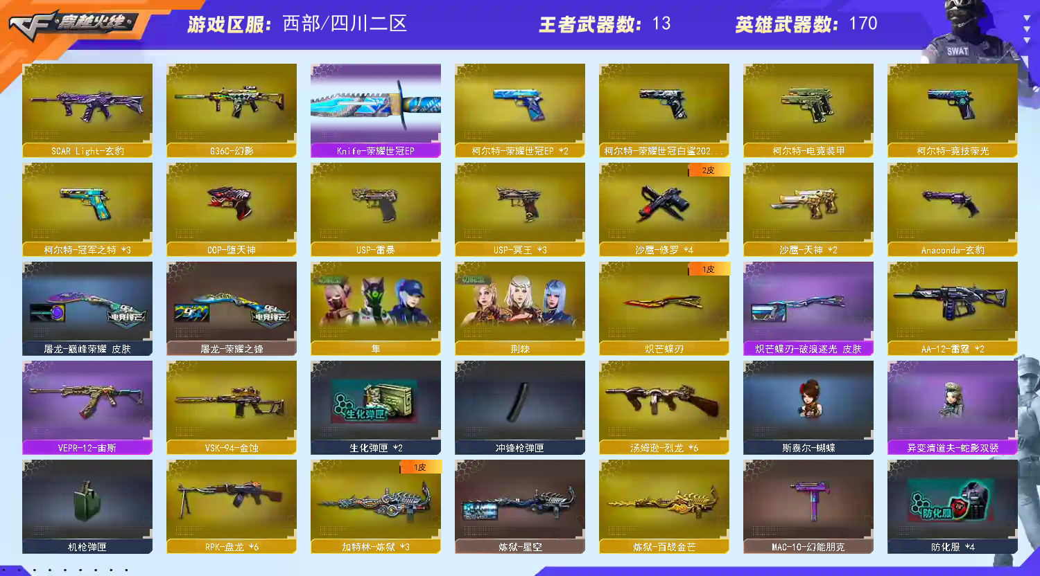 传说角色已开4防,爆破生化双全,柯尔特7套,手雷7套,CopUSP齐全;USP-雷暴,柯尔特-荣耀世冠白鲨2023,传说幽冥,柯尔特-冠军之特,炽芒蝶刃,传说星骇,传说女帝,