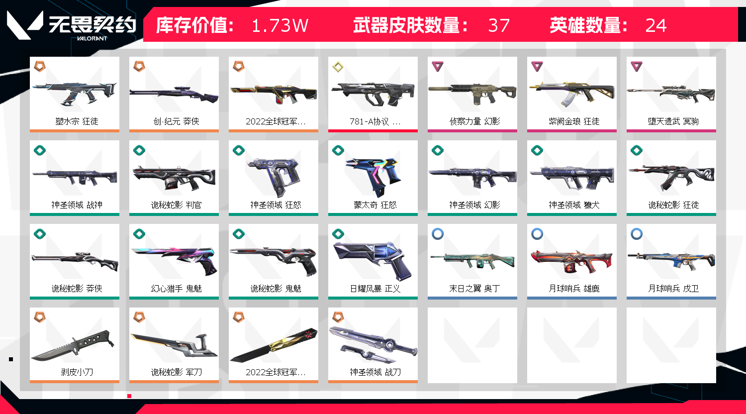 首页 > 租号大厅 > 无畏契约-wegame > wegame/wegame > ✨2022冠军套装✨剥皮小刀✨塑水 紫金狂徒✨侦察幻影✨781獠犬✨堕天大狙