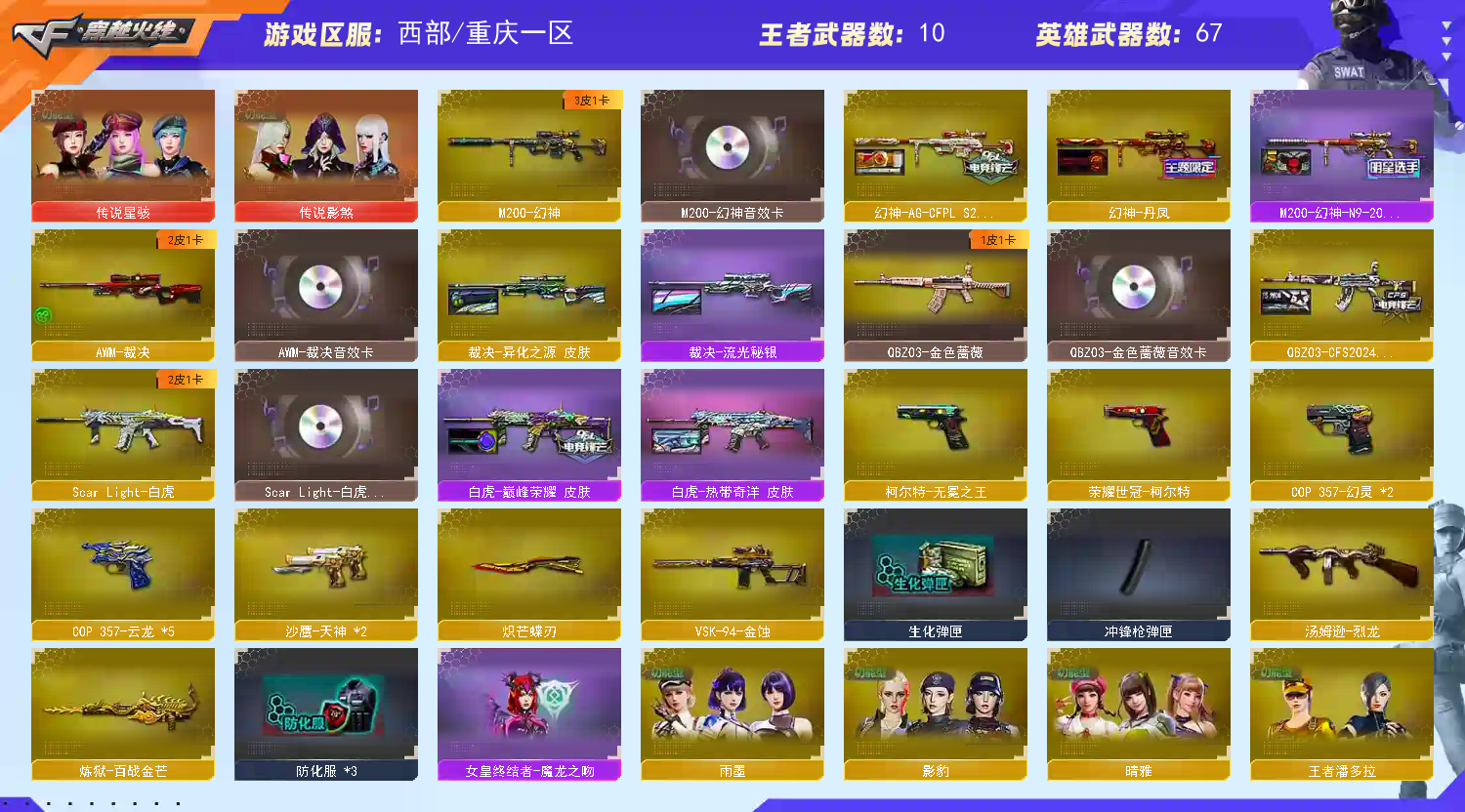 《4防影煞》《传说星骇》《m200幻神+n9+ag皮+丹凤+音效卡》《裁决+流光秘银+异化之源+音效卡》《王者星霆》《金蚀》《cop幻灵 cop云龙 柯尔特无冕之王 世冠柯尔特 1911大黄蜂》《炽芒碟刃》《幻灵套 云龙套》《白虎》《qbz天罚》《王者风势》《qbz王者蔷薇》《qbz金色蔷薇》《烈火》《毁灭》《火麒麟》《雷神》《朱雀蛇隐宗 火麒麟零纪元 雷神小红 迷你律动酷熊 m37葵》《金刚伞》《4防晴雅 4防影豹 4防雨墨 奇洋探员满配 蛇隐宗满配 云海玲珑 4防王者潘多拉 兰梨园特工》《b s战队炫彩背包 edg炫彩背包 超级背包》《qbz天罚音效卡 qbz金色蔷薇音效卡 awm昌龙怀旧音效卡 白虎音效卡 雷神音效卡 黑骑士音效卡 毁灭音效卡 炼狱百战金芒庆典舞曲音效卡》《qbz03cfs2024 烈火熔核 雷神女团皮 雷神拼搏 雷神脉冲核心 白虎热带奇洋 白虎巅峰荣耀 雷神宇航兔 毁灭战神张飞 毁灭cfs2018 雷神cfs2019;柯尔特-无冕之王,荣耀世冠-柯尔特,炽芒蝶刃,传说影煞,传说星骇,晴雅,QBZ03-金色蔷薇,