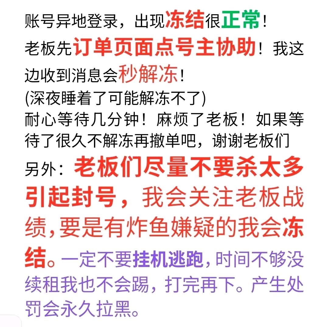不允许开麦骂人,不允许开挂 不许挂机!!! 违反规定一律叩除押金 玩的过程不要退号,否则再次登录会冻结 租客可以点击下方的切换其他方式验证等待登号器自动输入令牌登录;镭切,光荣异象 狂徒,离子武器//2.0 狂徒,西部未来 正义,天界神兵 鬼魅,离子武器 正义,