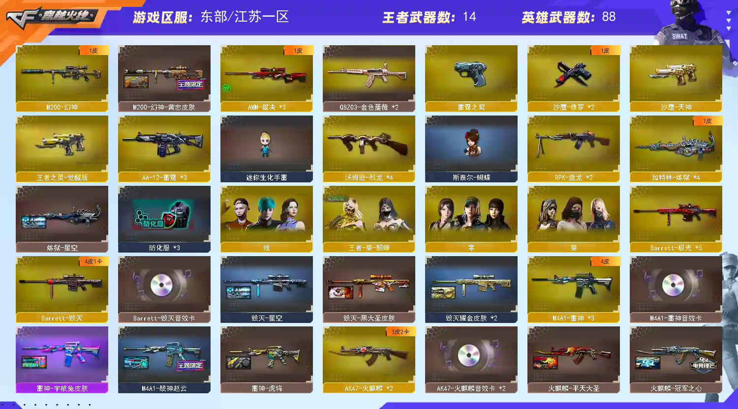 【M200-幻神带幻神-黄忠皮肤】【QBZ金色蔷薇×2】【白虎-电玩蓝兔】【盘龙×2】【炼狱×4】【烈龙×4】【斯泰尔-蝴蝶】【极光×5】【裁决×3】【四防王者-葵-貂蝉】狙击枪:【M200-幻神】【极光×5】【裁决×3】【天龙】【毁灭】【Barrett-雷霆】【王者之怒--王者之光--王者之力】步枪:【QBZ金色蔷薇×2】【白虎-电玩蓝兔】【火麒麟×2】【黑龙×2】【雷神×3】【黑骑士×4】【AK47-无影】【黑武士×2】【AK12-天启】【AN94-超新星】【AK47-机械迷城】【AK47-黑鲨×2】【M4A1-龙血×2】【M4A1-雷霆】【机械迷城-穹宇】【9A-91-烈火×3】【王者之心--王者之魄--王者之戮--王者之武】【AK47-B-战士】【AK47-B-战神】【M4A1-赤狱骑士】【M4A1-苍鸣雷神】机枪:【盘龙×2】【炼狱×4】冲锋枪:【烈龙×4】【斯泰尔-蝴蝶】散弹枪:【AA-12-雷霆×3】手枪:【COP 357-雷霆 王者之灵 COP -白鲨】刀具:【屠龙×2 龙啸 麒麟刺-堕天神 王者之锋--王者之击--王者之刺】手雷:【雷霆高爆手雷套×7 堕天神高爆手雷 雷霆闪光弹手雷套×7 堕天神闪光弹手雷 雷霆烟雾弹手雷套×7 堕天神烟雾弹手雷】音效卡:【毁灭音效卡 火麒麟音效卡×2 黑骑士音效卡 雷神音效卡】角色:【四防王者-葵-貂蝉】【葵 零 炫 】皮肤:【幻神-黄忠】【雷神-宇航兔 雷神-源计划2.0专属】【黑骑士-破浪10年】【火麒麟-冠军之心 火麒麟-AG战队】【AWM-天龙-传奇70KG】;RPK-盘龙,QBZ03-金色蔷薇,M200-幻神,