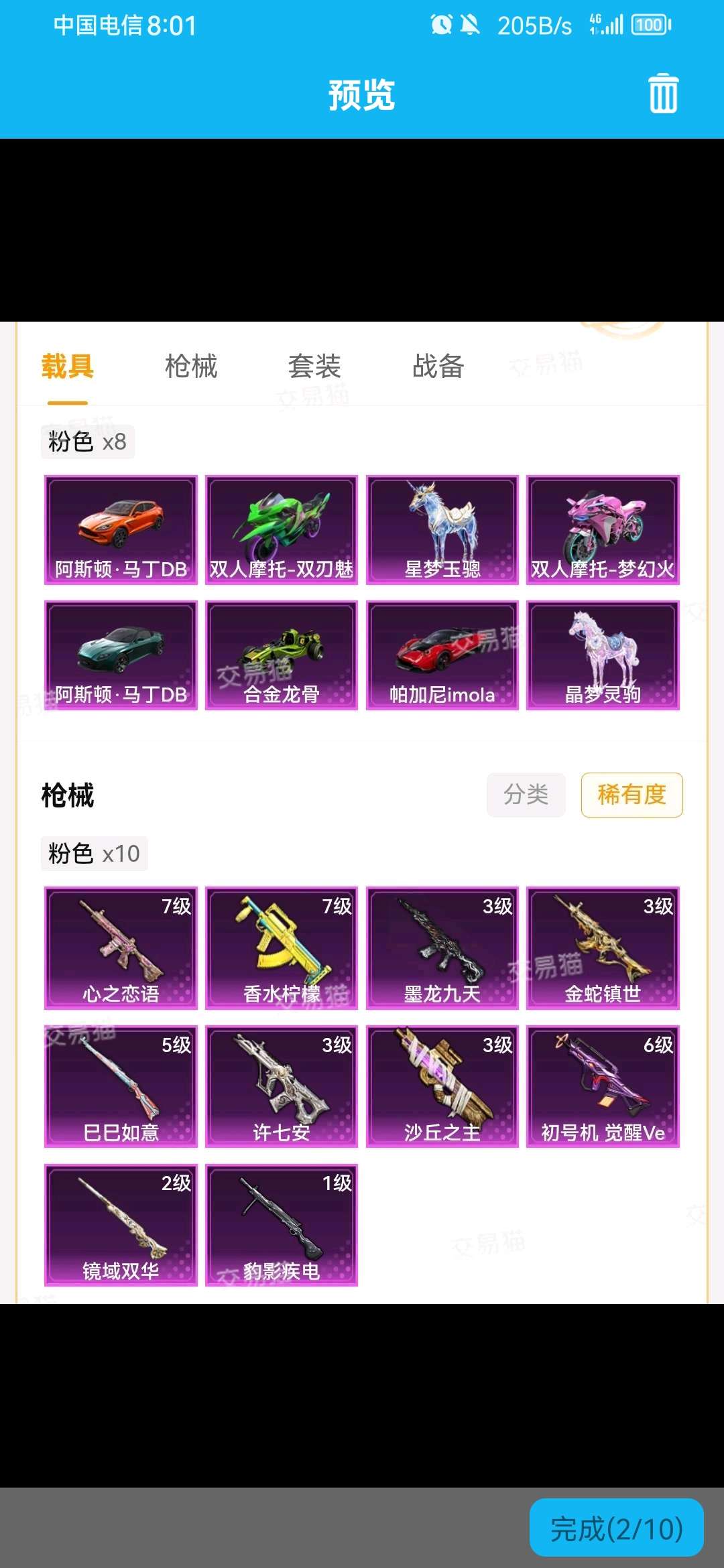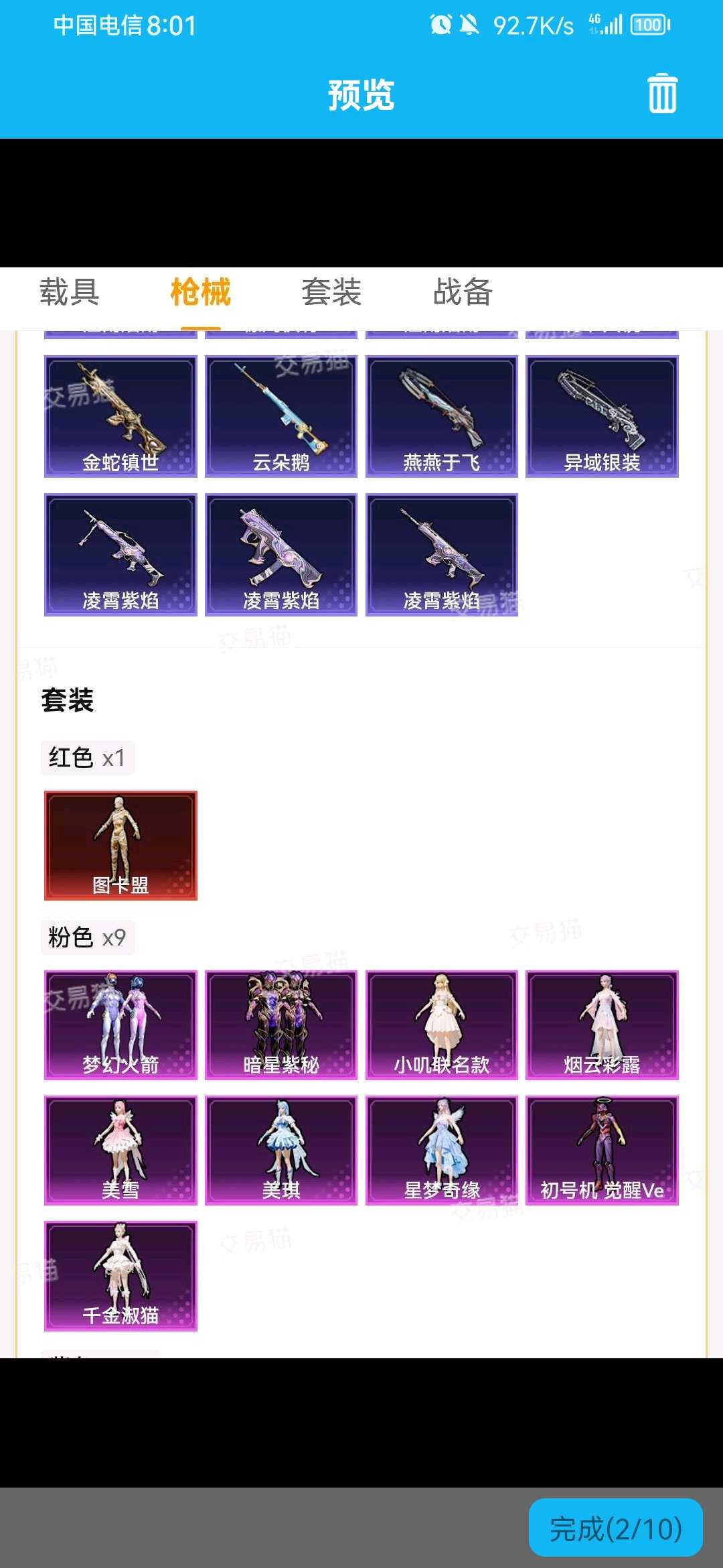 8载具 10升级枪 9粉装 3飞行器 255枪皮 178套装 91947热力 13印记 皇冠