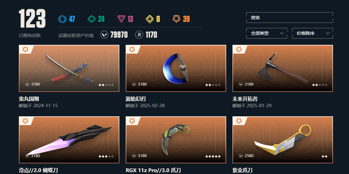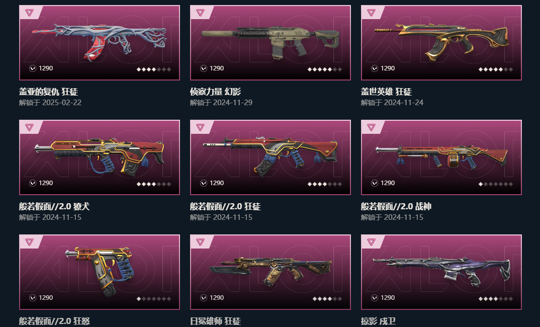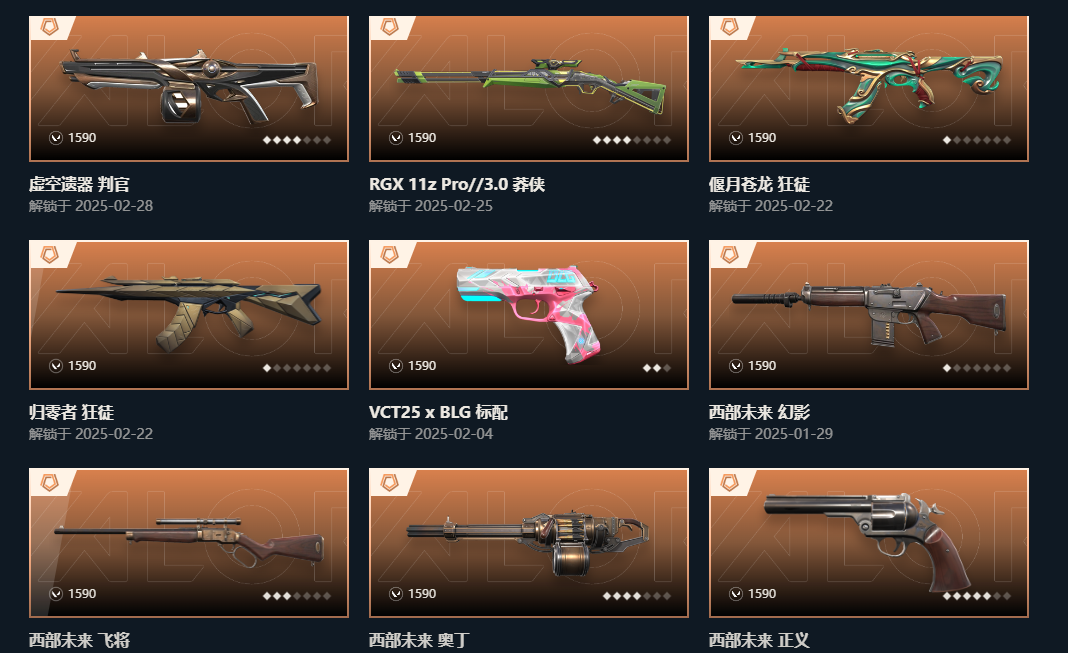wegame无畏契约★ 刀皮数量13 枪皮数量110 限定39 尊爵13 星际猎兵 标配,光环序列 狂怒,瑰梦艺语 鬼魅,诡秘蛇影 鬼魅,末日之翼 短炮,折光棱晶 标配,虚空遗器 正义,星云暗涌 鬼魅,VCT25 x BLG 标配,西部未来 正义,神圣领域 狂怒,月球哨兵 正义,纳米打击 正义,般若假面//2.0 狂怒,逆冲蛮牛 狂怒