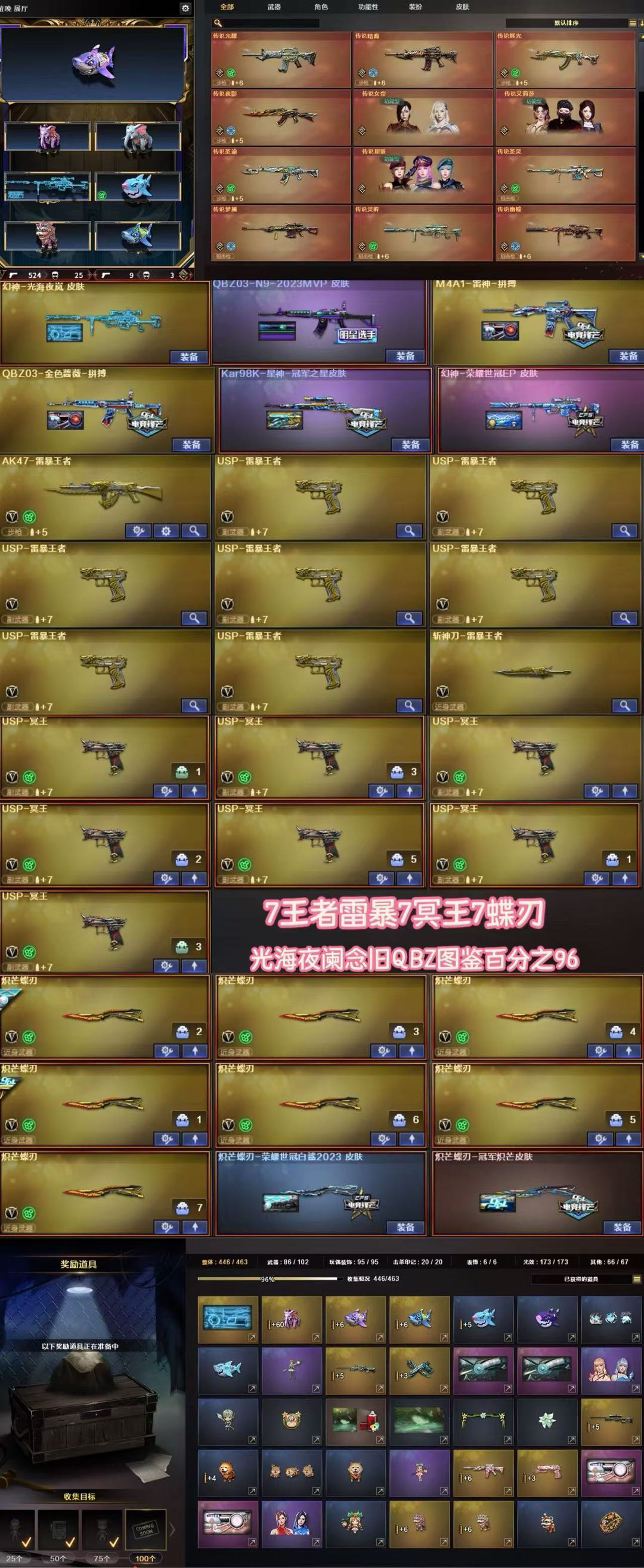 西部天花板满图鉴满皮肤新活动全穿;USP-雷暴,柯尔特-无冕之王,USP-雷暴王者,柯尔特-荣耀世冠白鲨2023,柯尔特-冠军之特,炽芒蝶刃,Knife-冠军之刃,