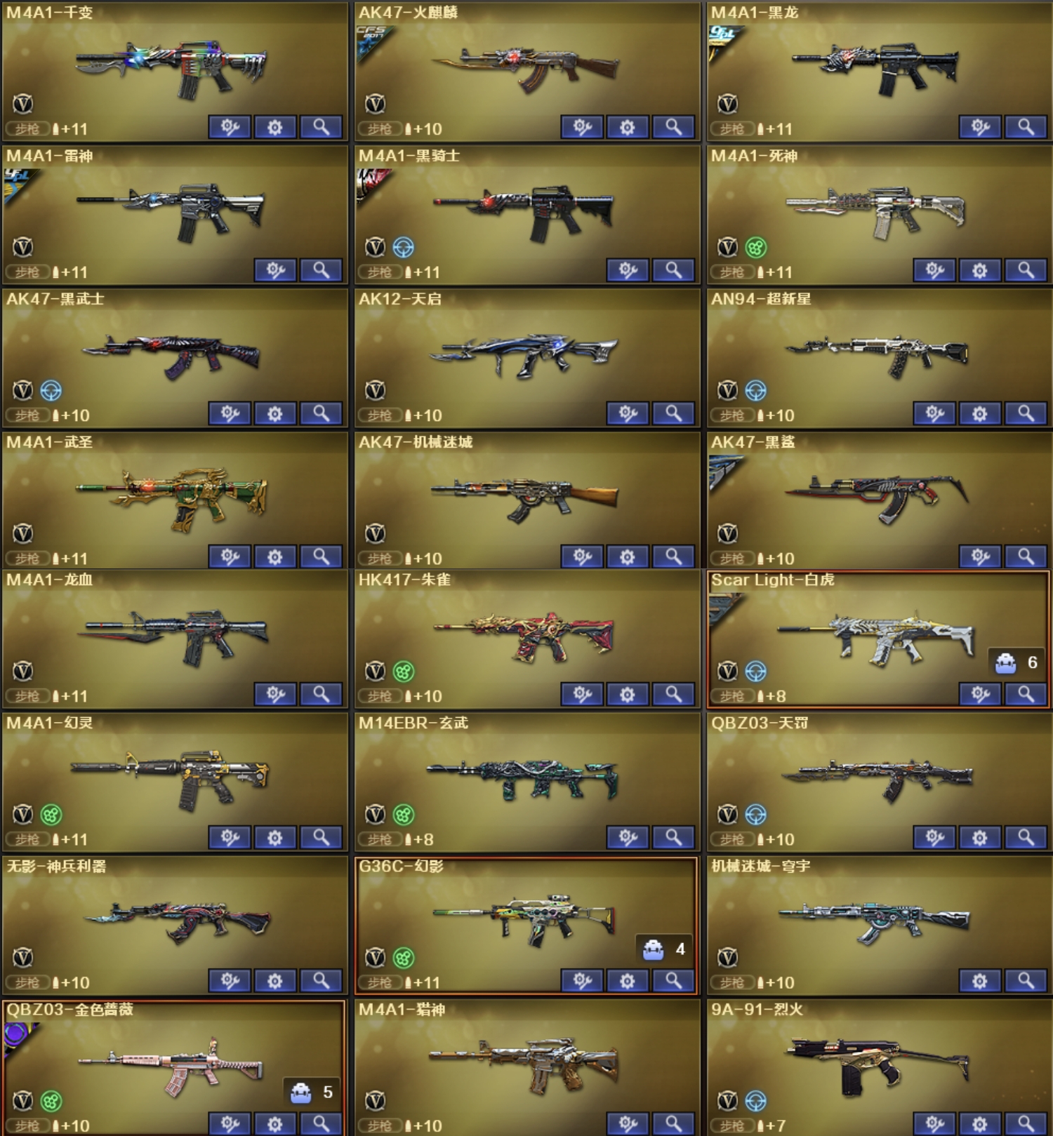 G36C幻影、幻神音效卡、裁决音效卡、白虎音效卡、金色蔷薇音效卡、六烈龙、传说星骇、98K星神、王者之光、M200竞技荣光、王者风神、USP雷暴、cop堕天神、COP幻灵、柯尔特;USP-雷暴,Knife-冠军之刃,传说星骇,隼,电竞教官-云悠悠,QBZ03-金色蔷薇,G36C-幻影,