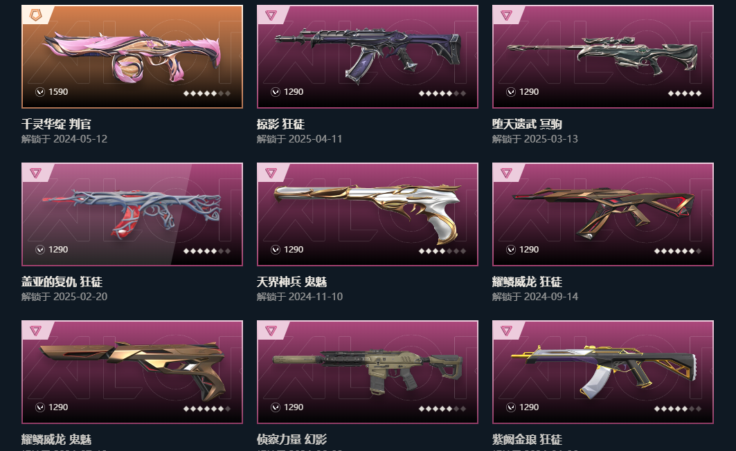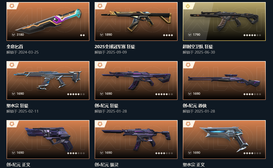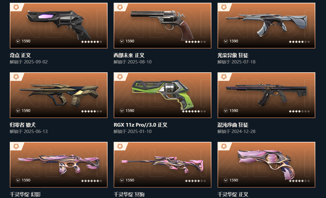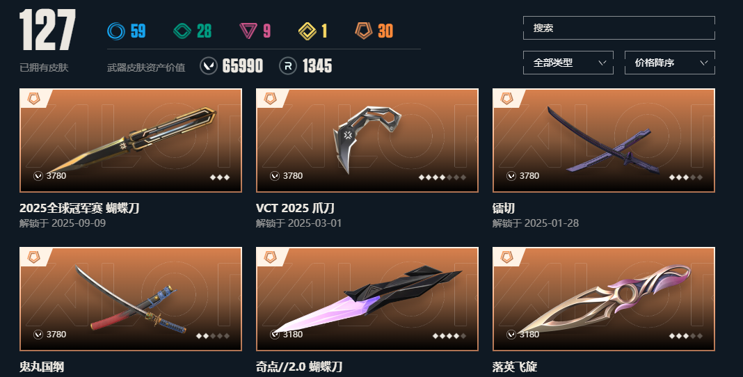 wegame无畏契约★ 刀皮数量13 枪皮数量114 限定30 究极1 尊爵9 皮肤资产价值65990 已用R点1345