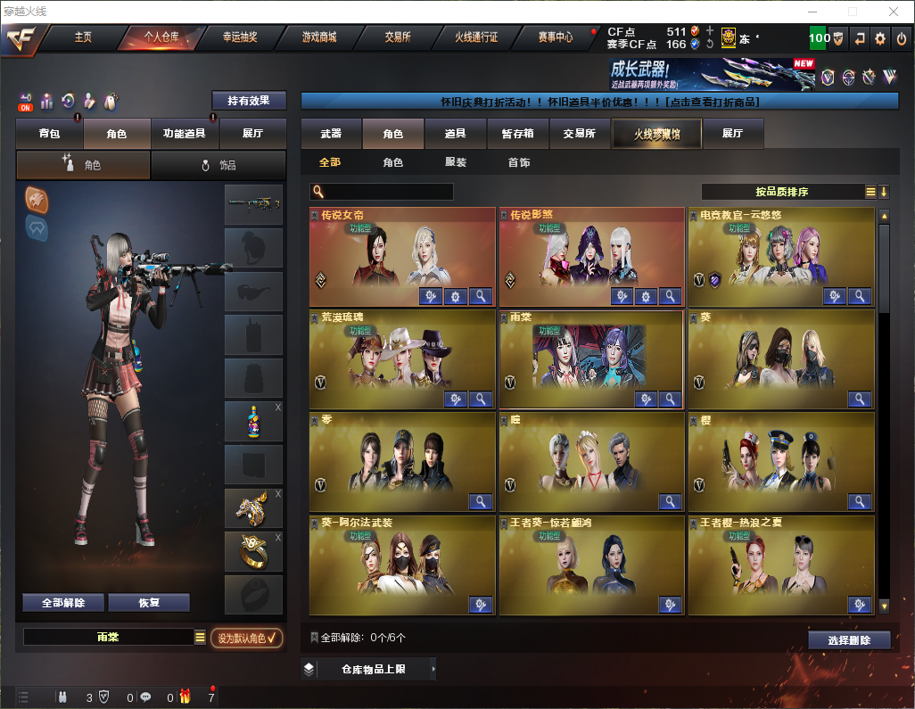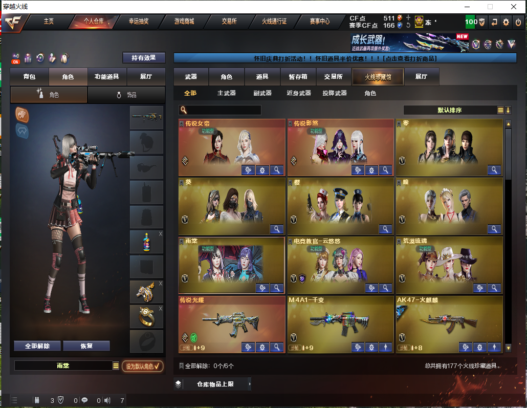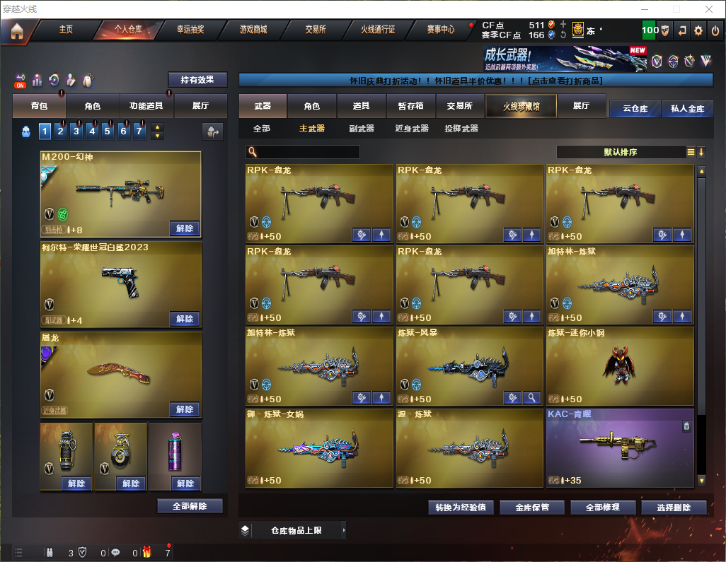 【主武器】M200-幻神/M200-幻神竞技荣光/G36c-幻影/②玄武/传说光耀/斯太尔蝴蝶/异变清道夫/炼狱/炼狱小刚/炼狱风暴/⑥烈龙⑥盘龙/千变/火麒麟/黑龙/②雷神/②黑骑士/死神/黑武士/天启/武圣/机械迷城/黑鲨/朱雀/超新星热带奇洋/QBZ03-独角-III/④玫瑰精灵/蔷薇qbz/烈火/烈火动感闪耀/王者之心觉醒版/王者之武觉醒版/王者之魄觉醒版/②王者之势觉醒版/猩红传说/王者火魄觉醒版/荣耀世冠火麒麟/身先士卒/常胜将军/白虎电玩蓝兔/②天龙/③毁灭/②裁决/VSK-94-金蚀/2蔷薇炮/王者之怒觉醒版/②暗月传说大炮/AA12雷霆/苍鸣雷神/炫金雷神/炫金骑士/裁决雪莉杨/王者之力/爆炎激光超越Max3+2/集束激光超越Max2+2/机甲撕裂者3/末日审判者3/双面神/黑龙吞噬者/神圣爆裂者3/试炼破坏者3/EVO赤血龙魂 【副武器}】柯尔特-荣耀世冠白鲨2023/柯尔特-冠军之特/COP357-云龙/cop357-雷霆/USP-雷暴/柯尔特-竞技荣光/泡泡象COP357/②修罗/②天神/天神动感闪耀/电竞装甲柯尔特/ 【近身武器】⑤屠龙/②龙啸/④擎天/②麒麟刺/斩神刀雷暴/③幻灵之峰/②擎天竞技荣光/屠龙动感闪耀/龙啸热带奇洋/麒麟刺百战金芒/王者之峰觉醒版/王者之啸觉醒版/王者之击觉醒版/迷你宝贝/手斧镜/冰龙/迷你深渊王绿豆/ 【投掷武器】⑥高爆竞技荣光+⑥烟闪/③高爆雷暴+③烟闪/高爆雷霆+烟闪/高爆神功天巧+烟闪/手雷动感闪耀/高爆云龙/手雷热带奇洋/②迷你生化手雷/ 【角色】传说女帝+四防/传说影煞+四防/电竞教官云悠悠+四防/荒漠琉璃+四防/雨棠/葵/零/瞳/樱/葵阿尔法武装/奇洋探员/乔伊教练/王者葵惊若翩鸿/王者樱热浪之夏/修道士/兰海滩派对/零水下丽影/王者零传说之路/对讲机/炫彩背包/圣龙戒/魔龙戒 【皮肤】幻神-荣耀世冠白鲨2023皮肤/蔷薇qbz-冠军之薇+荣耀世冠白鲨皮肤/朱雀-甜蜜火力皮肤/雷神-荣耀之魄+白鲨CFPLS14冠军+星空皮肤/毁灭+荣耀之怒+耀金+星空皮肤/屠龙-巅峰荣耀+荣耀之峰皮肤/黑骑士-冠军之势皮/黑武士-典韦皮肤 【音效卡】裁决音效卡/蔷薇qbz音效卡/白虎音效卡/天罚音效卡/毁灭音效卡/炼狱百战金芒音效卡/黑龙音效卡/黑骑士音效卡 【道具】紫金大元首/全背包/VIP6/AC/烟雾头/变异宝贝/疯狂宝贝/灵魂忍者/绿巨人/灵魂忍者/迷雾幽灵/绿巨人/机械猎手-幻灵猎姬皮肤/圣泉猎手-炽雪皮肤/女皇终结者-魔龙之吻皮肤/钢铁终结者-湮灭之柱皮肤/生化爆破全装;USP-雷暴,柯尔特-荣耀世冠白鲨2023,柯尔特-冠军之特,传说影煞,传说女帝,电竞教官-云悠悠,RPK-盘龙,
