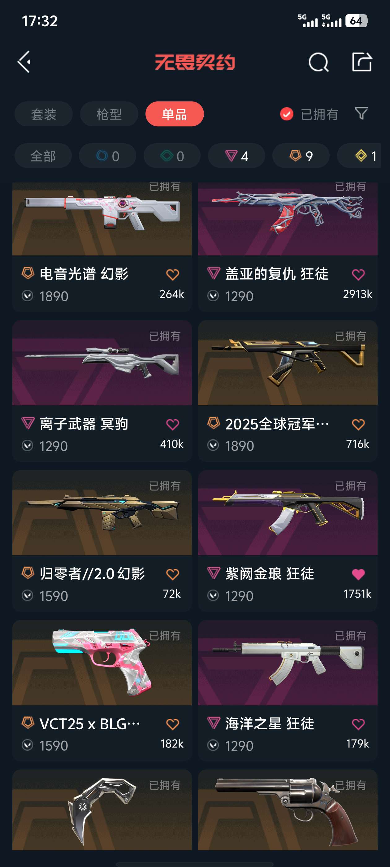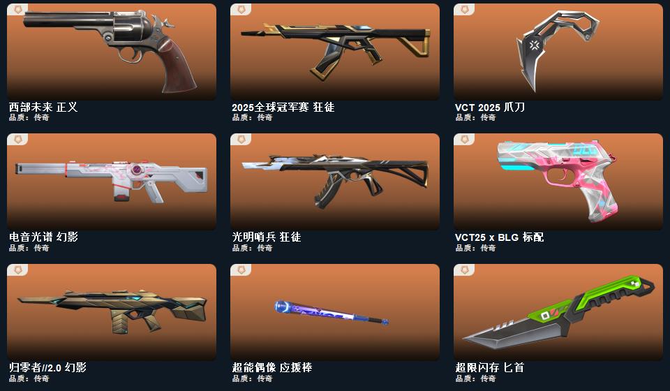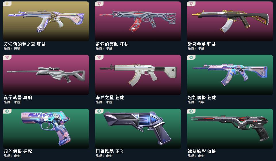 VCT爪刀,电音光谱幻影,盖亚,紫金,25冠军 猫猫,光明哨兵,海洋之星狂徒归零者m4,离子大狙,西部正义,黄金2隐藏分低。