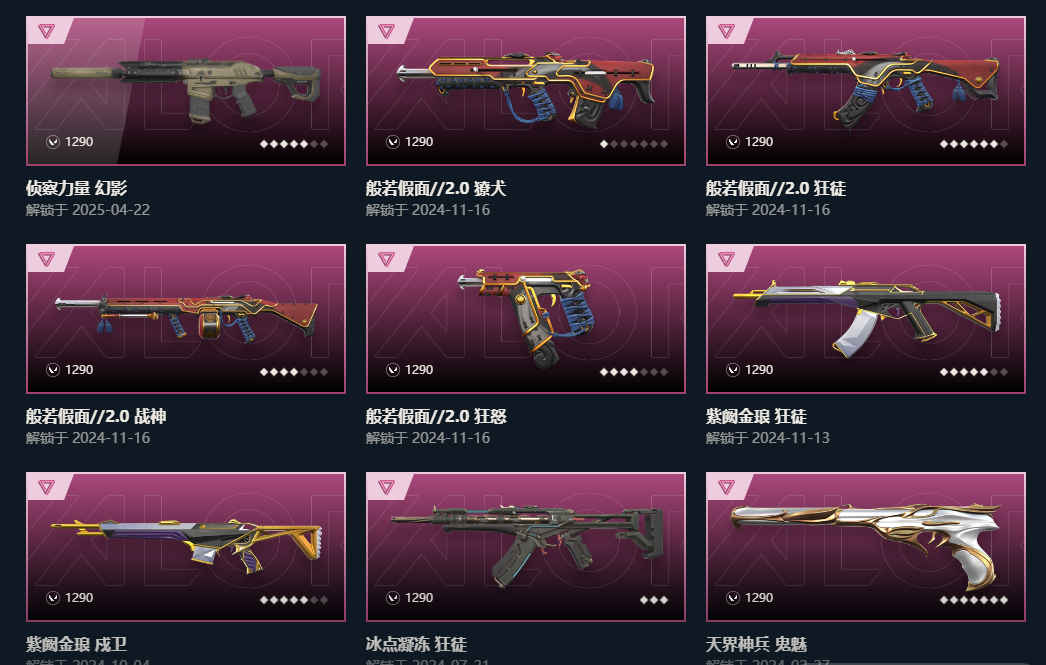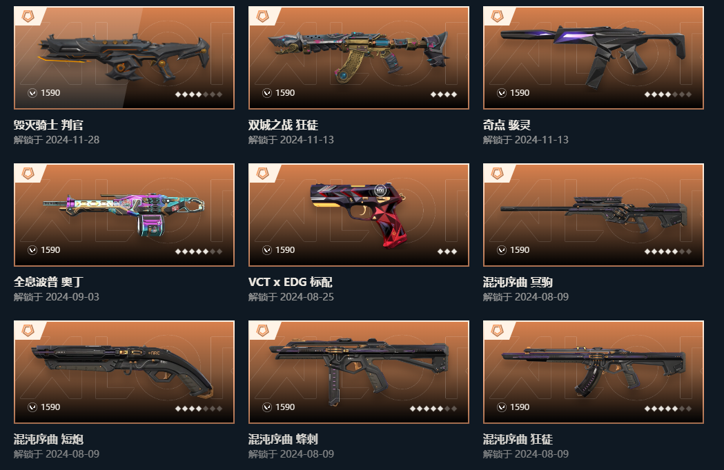 wegame无畏契约★ 刀皮数量16 枪皮数量177,2024全球冠军赛套装、混沌序曲套装、般若假面2.0套装,近战武器-2024全球冠军赛战刀、幻影-2024全球冠军赛、狂徒-双城之战,鬼魅-灵魂消声者、鬼魅-信手涂鸦、鬼魅-天界神兵、鬼魅-胡桃狂想、鬼魅-光导纤维、鬼魅-耀鳞威龙,近战武器-弧光异彩军刀、近战武器-巨神铁甲短剑、近战武器-沙尘幻旅匕首、近战武器-钢轨卫士战锤、近战武器-珍珠棘贝短剑、近战武器-流星兵团短剑、近战武器-闪耀之星荧光棒、近战武器-显卡3.0爪刀