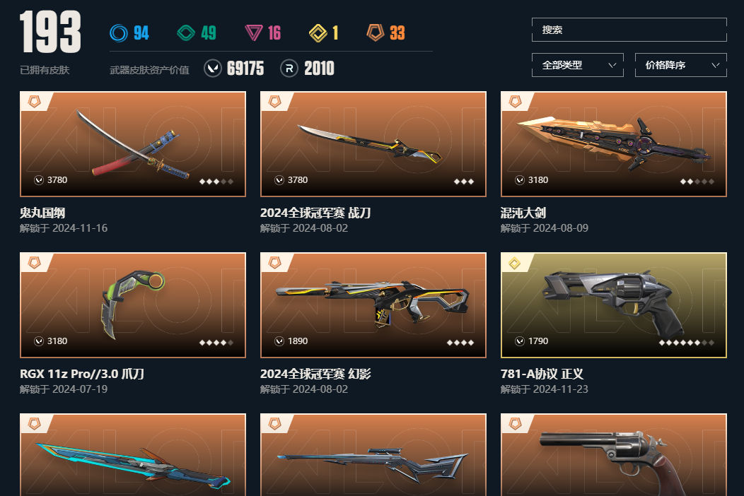 wegame无畏契约★ 刀皮数量16 枪皮数量177,2024全球冠军赛套装、混沌序曲套装、般若假面2.0套装,近战武器-2024全球冠军赛战刀