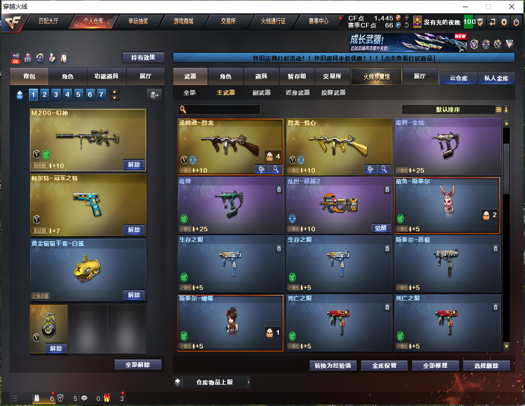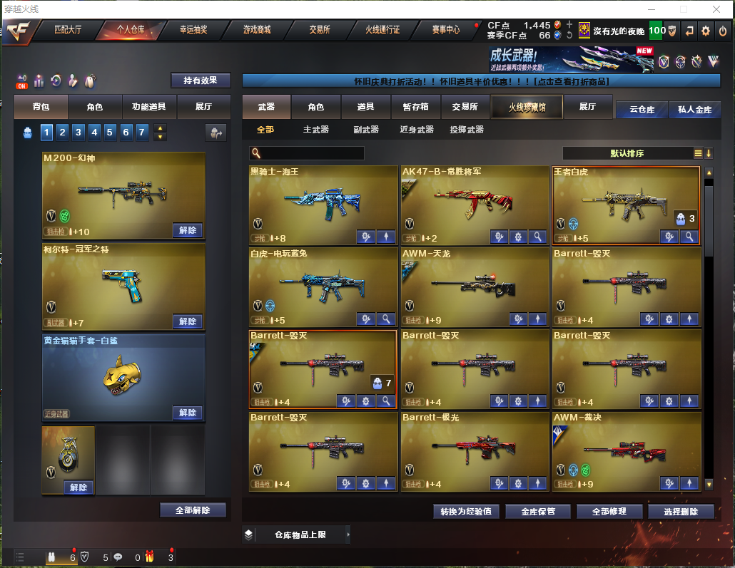 【主武器】M200-幻神/M200-幻神竞技荣光/王者白虎觉醒版/玄武/朱雀/青龙/AK雷暴/白虎电玩蓝兔/斯太尔萌兔/斯太尔蝴蝶/毒蜂/毒刺-金线/悦蓝-惊涛骇浪觉醒版/炼狱悦蓝觉醒版/炼狱百战金芒/炼狱/炼狱小刚/⑥烈龙⑥盘龙/②千变/④火麒麟/黑龙/雷神/②黑骑士/天启/武圣/②龙血/无影/黑武士/机械迷城/蔷薇qbz/猎神/烈火/烈火动感闪耀/王者之影觉醒版/天启悦智觉醒版/超新星悦享觉醒版/猩红传说/⑤毁灭/极光/裁决/朱雀炮/蔷薇炮/王者之力觉醒版/苍鸣雷神/极光/雷神精英刀锋/QBZ03掌火萌橙/炫金超新星/炫金火麒麟/炫金黑骑士/王者大炮英勇金戈/炫金天龙/激光毁灭者3/双面神/神圣爆裂者+末日3/生存之眼/死亡之眼庆典CFS2021/MK5SS秘银/ 【副武器}】柯尔特-冠军之特/USP-神功天巧/COP357雷霆王者觉醒版/柯尔特-竞技荣光/COP白鲨/④修罗/②天神/COP旗袍/③涂鸦手枪/ 【近身武器】炽芒蝶刃/黄金猫猫手套白鲨/冠军之刃/屠龙/龙啸/擎天/②麒麟刺/斩神刀雷暴/②擎天竞技荣光/屠龙动感闪耀/麒麟刺百战金芒/王者之峰觉醒版/王者之啸觉醒版/王者之刺觉醒版/金刚伞电玩红兔/剧毒匕首毒蝰/黄金尼泊尔/迷你波特博士牛牛冰龙/手斧镜 【投掷武器】②迷你生化手雷+①黑桃战神/③高爆雷暴+③烟闪/②高爆竞技荣光+②烟闪/手雷动感闪耀 【角色】传说女帝+四防/沙漠玫瑰+四防/电竞教官云悠悠+四防/晴雅+四防/魅影/零纪元/战地猎狐/王者葵貂蝉/王者玲珑小乔/王者沙漠玫瑰/王者樱热浪之夏/王者炫/修道士/炽天使/空/卡塔琳娜/灵动武士/竞技玫瑰/流浪蔷薇/女主播/灵狐者职业经理/对讲机/炫彩背包/圣龙戒/魔龙戒 【皮肤】炼狱-斗鱼平台皮肤+星空皮肤/火麒麟-斗鱼平台皮肤/雷神+斗鱼平台皮肤+星空皮肤/毁灭-荣耀之怒皮肤+BEAN2020MVP皮肤+耀金皮肤/裁决-百战天津皮肤/屠龙-荣耀之峰皮肤/ 【音效卡】毁灭音效卡/炼狱百战金芒音效卡/ 【道具】紫金大元首/全背包/VIP6/AC/烟雾头/变异宝贝/疯狂宝贝/灵魂忍者/绿巨人/全弹夹/时空猎手-幻影猎人皮肤/圣泉猎手-炽雪皮肤/女皇终结者-魔龙之吻皮肤/钢铁终结者-湮灭之柱皮肤/生化爆破全装;柯尔特-冠军之特,炽芒蝶刃,Knife-冠军之刃,沙漠玫瑰,传说女帝,电竞教官-云悠悠,晴雅,
