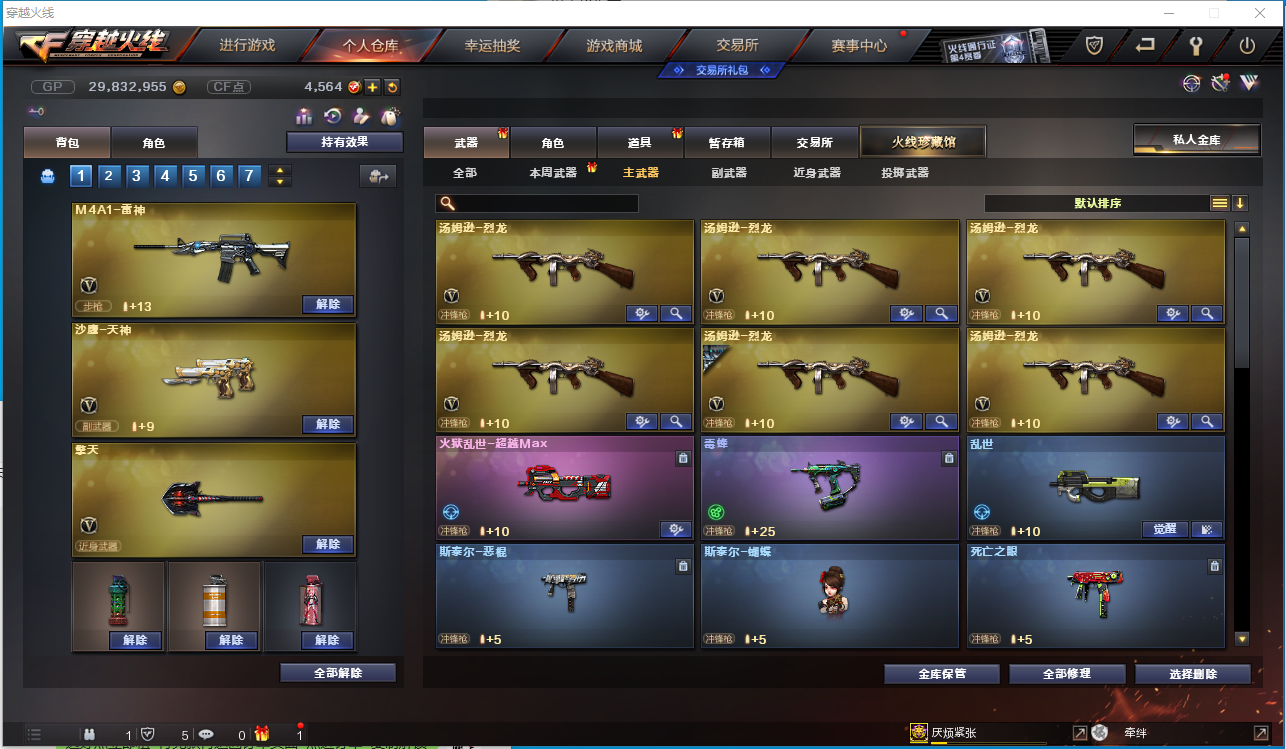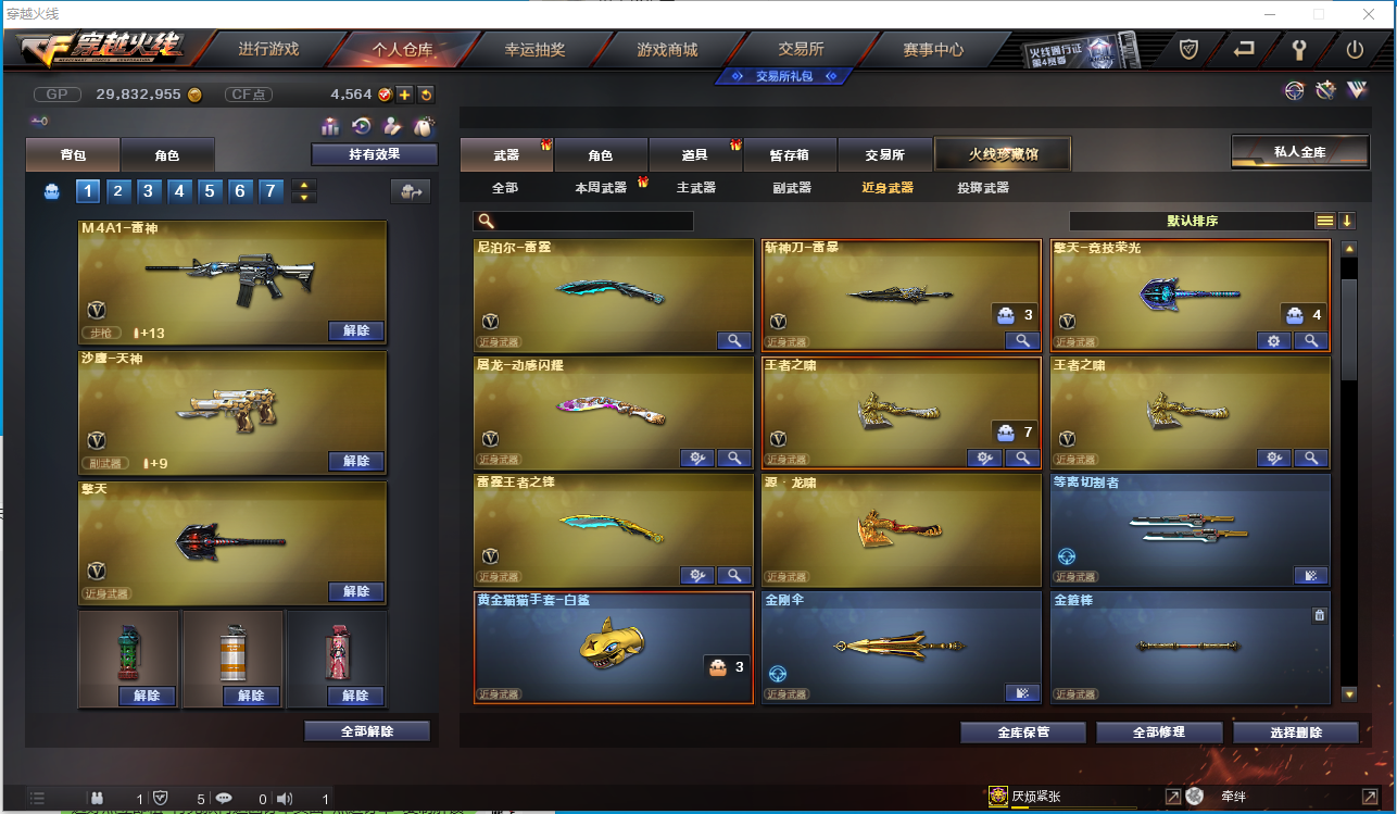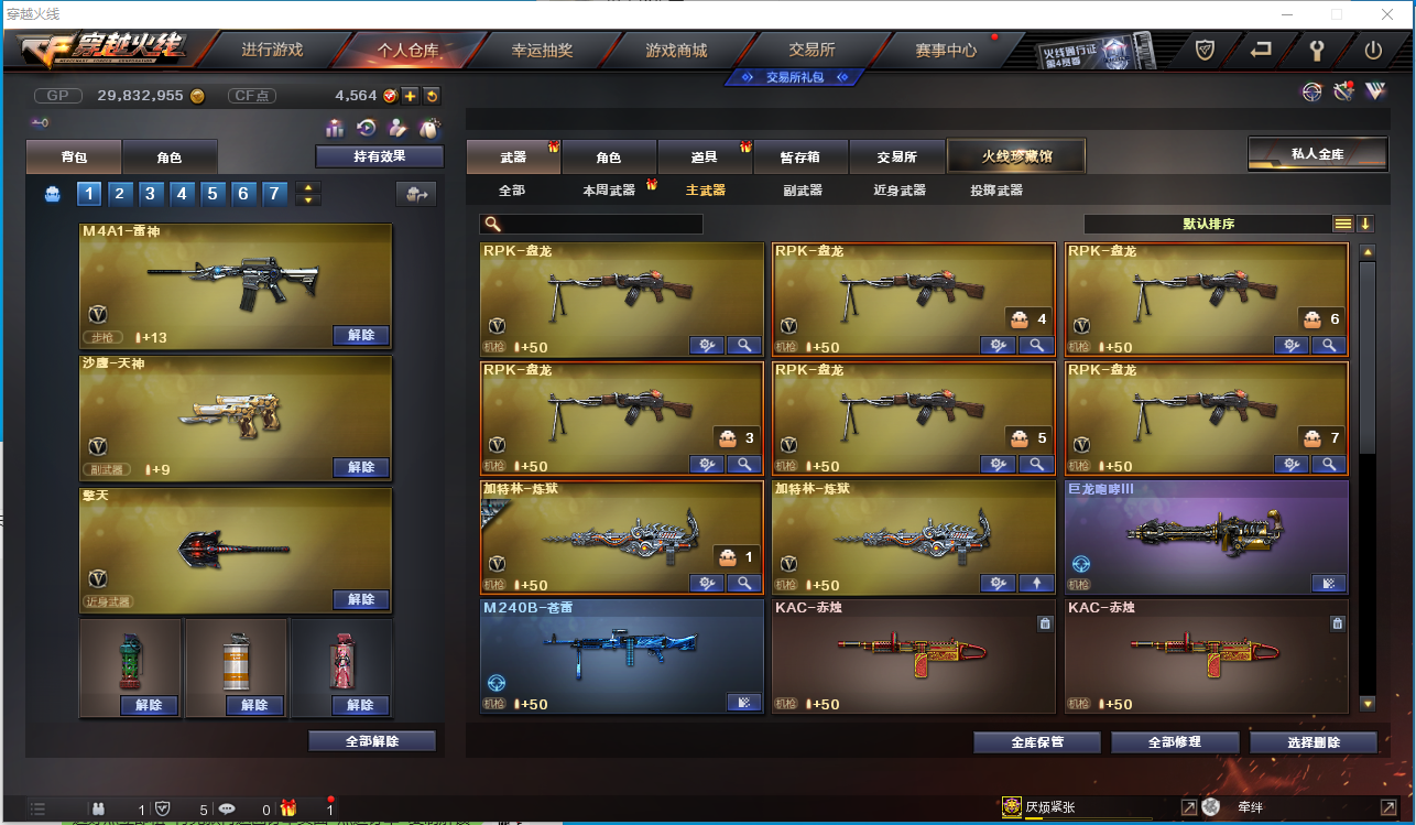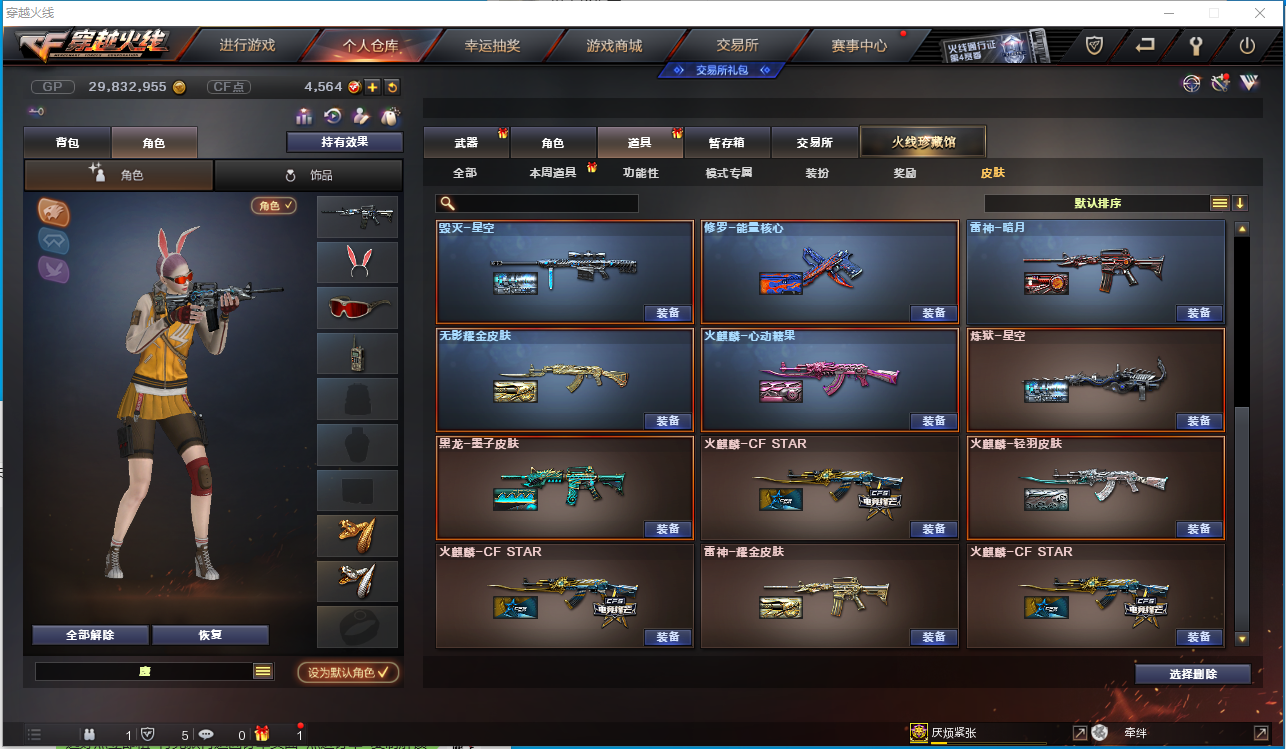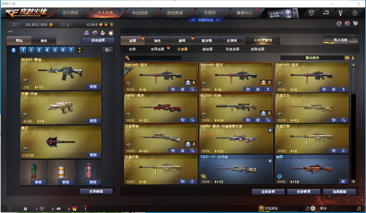 【角色】电竞教官-云悠悠、零、乔伊教练、王者-瞳-闭月羞花、王者魅影、樱、鹰、初恋灵狐、风暴女、虎妞、嘉年华灵狐、救世主-X、木兰、潘多拉-X、斯沃特-X、铁骑荣耀、新猎狐者、雪莉杨、影舞者-X、 【主武器】M200-幻神、传说光耀、M4A1-千变、AK47-火麒麟、M4A1-黑龙、M4A1-雷神、M4A1-黑骑士、AK47-无影、AK12-天启、AN94-超新星、AK47-黑鲨 、M4A1-青龙、HK417-朱雀、Scar Linght-白虎、无影-神兵利器、烈火-动感闪耀、QBZ03-金色蔷薇、9A-91-烈火、火麒麟-灵狐、Barrett-毁灭、AWM-裁决、六盘 六烈+蝴蝶、加特林-炼狱*2、AA-12-雷霆、王者之心、王者之魄、王者之武、王者之力、王者之怒、王者星神、 【挑战强化武器】火狱乱世-超越MAX、毁灭征服者-超越MAX、 【副武器】沙鹰-修罗*2、沙鹰-天神*3、USP-雷暴、柯尔特-竞技荣光、天神-动感闪耀、阐释者III 【近身武器】黄金猫猫手套-白鲨、雷霆王者之锋、王者之啸、屠龙、龙啸、擎天、麒麟刺、尼泊尔-雷霆、斩神刀-雷暴、擎天-竞技荣光、屠龙-动感闪耀、 【投掷武器】雷霆手雷套、雷暴手雷套*4、竞技荣光手雷套、手雷-动感闪耀、 【音效卡】M4A1-黑骑士音效卡、Barrett-毁灭音效卡、 【皮肤】雷神-烈火皮肤、QBZ03-冠军之薇、黑骑士-暗月、天启-暗月、修罗-能量核心、天神-暗月、雷神-能量核心、无影-能量核心、烈龙-星空、毁灭-星空、雷神-暗月、无影耀金皮肤、火麒麟-心动糖果、炼狱-星空、黑龙-墨子皮肤、火麒麟-CF STAR、火麒麟-轻羽皮肤、雷神-耀金皮肤、;USP-雷暴,电竞教官-云悠悠,RPK-盘龙,QBZ03-金色蔷薇,M200-幻神,Scar Light-白虎,