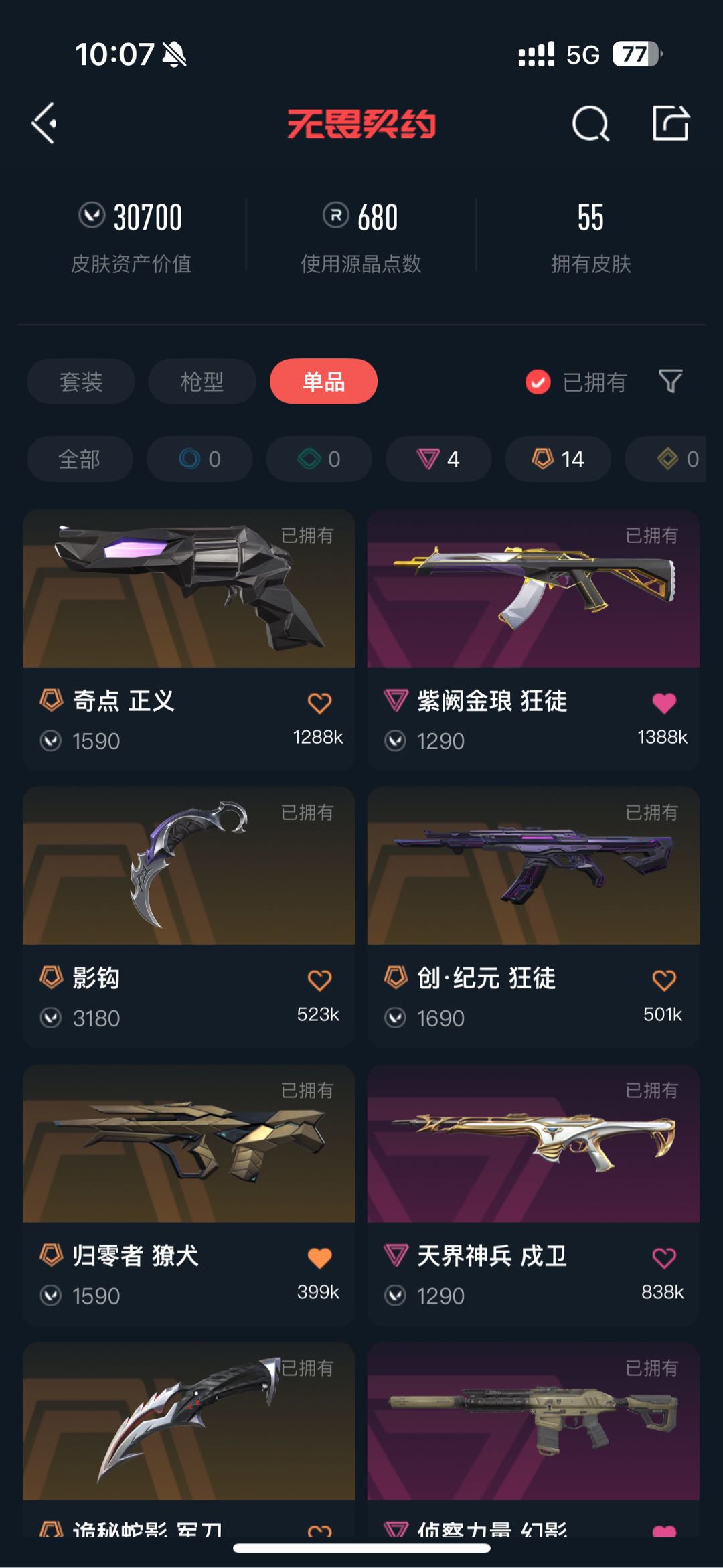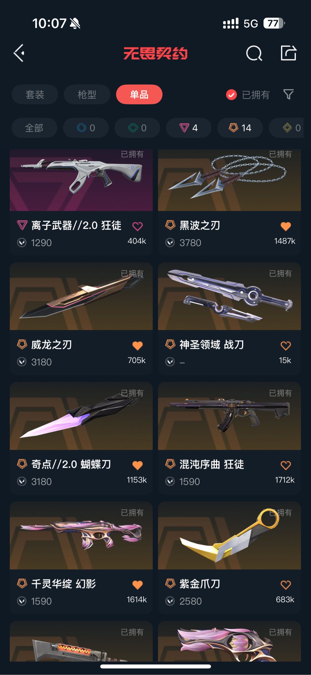 热门皮肤 狂徒:紫金 离子2.0 创纪元 混沌序曲 幻影:侦查力量 千灵华绽 獠犬:归零者 戍卫:天界神兵 正义:奇点 千灵华绽 刀皮:黑波之刃 影勾 紫金爪刀 奇点蝴蝶刀 威龙之刃;黑波之刃,紫金爪刀,威龙之刃,归零者 獠犬,侦察力量 幻影,紫阙金琅 狂徒,天界神兵 戍卫,