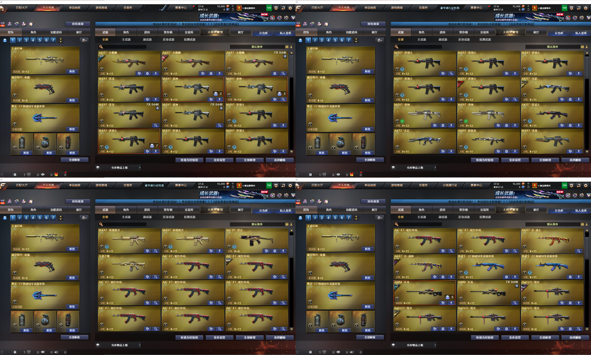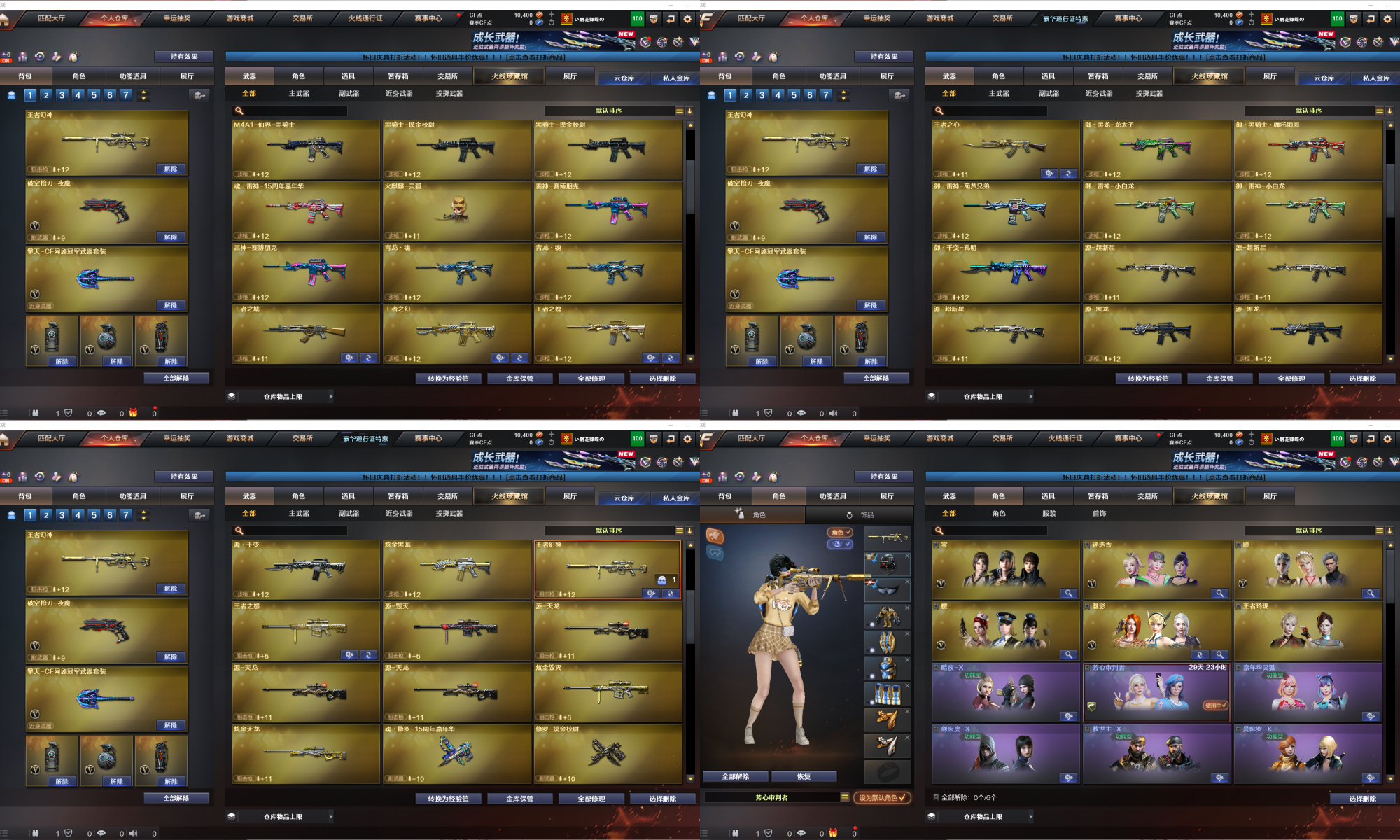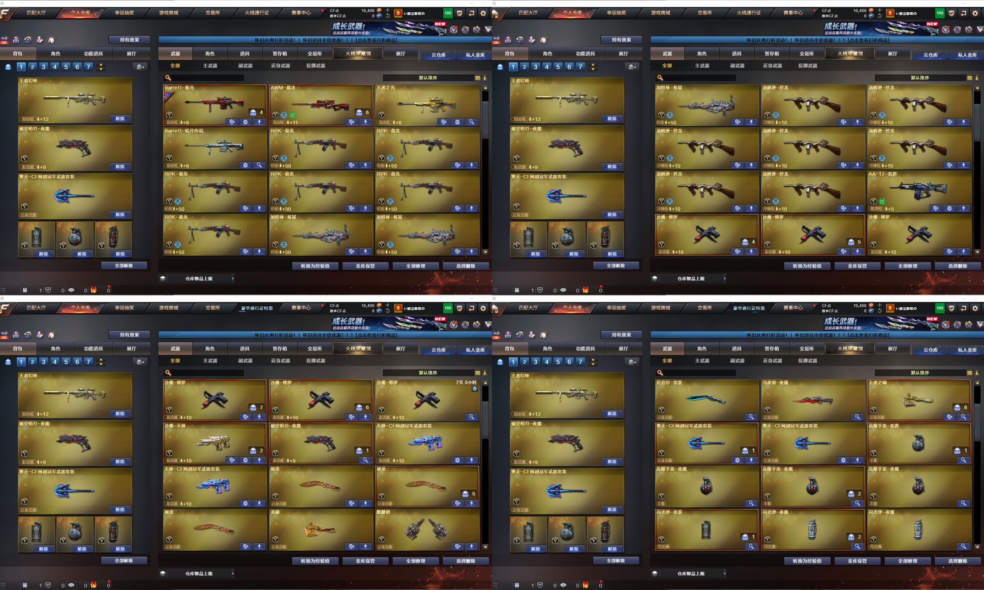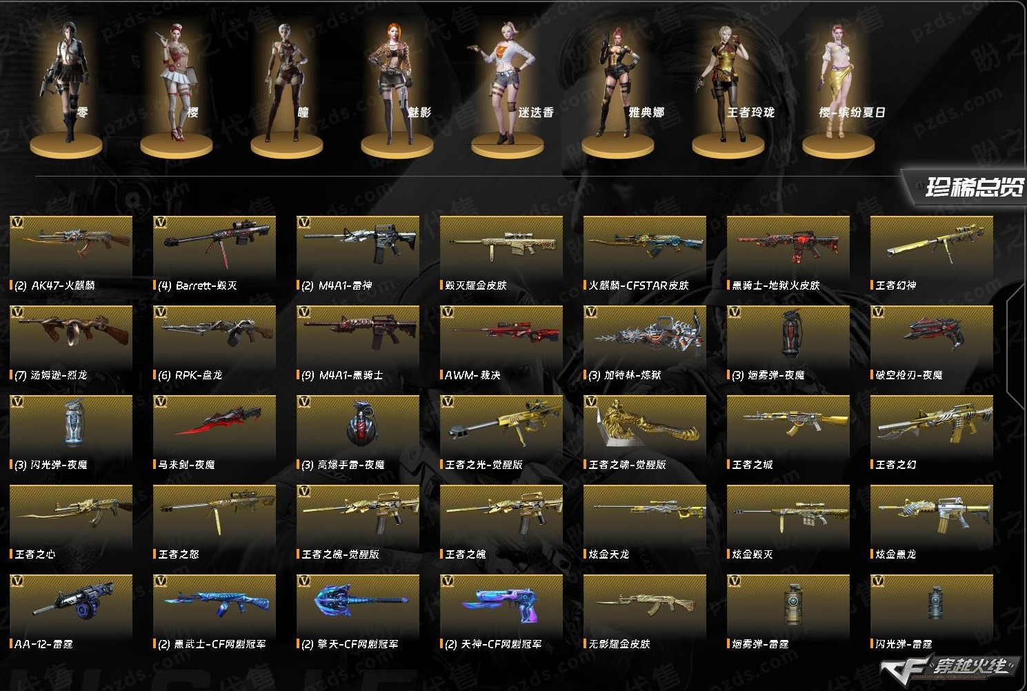 【重要套装】网剧冠军套装 【重要角色】_零/_樱/_瞳/魅影/_迷迭香/雅典娜/王者玲珑/樱-缤纷夏日 【传说武器】 【英雄武器】Barrett-毁灭(4)/Barrett-极光/Barrett-暗月传说/王者之光-觉醒版/AWM-天龙/AWM-裁决/M4A1-雷神(2)/M4A1-死神(2)/M4A1-黑龙/M4A1-龙血/M4A1-黑骑士(9)/M4A1-玫瑰精灵(2)/王者之魄-觉醒版/AK12-天启/AK47-火麒麟(2)/AK47-无影/AK47-黑武士/黑武士-CF网剧冠军(2)/AK-47-猩红传说(10)/AK47-B-战士/AK47-B-战神/AN94-超新星/9A91-烈火/RPK-盘龙(6)/汤姆逊-烈龙(7)/AA-12-雷霆/加特林-炼狱(3)/沙鹰-天神/天神-CF网剧冠军(2)/沙鹰-修罗(5)/破空枪刃-夜魔/麒麟刺/龙啸/王者之啸-觉醒版/擎天-CF网剧冠军(2)/屠龙(3)/雷霆之锋/马来剑-夜魔/高爆手雷-雷霆/高爆手雷-夜魔(3)/烟雾弹-雷霆/烟雾弹-夜魔(3)/闪光弹-雷霆/闪光弹-夜魔(3) 【王者武器】王者之心/王者之城/王者之幻/王者之魄/王者幻神/王者之怒 【小人枪】火麒麟-灵狐/AWM-灵狐-15周年嘉年华/M37-葵/魔能飞环-曼陀罗 【其他重要武器】炫金黑龙/炫金毁灭/炫金天龙/黑骑士-摸金校尉(2)/M4A1-十二生肖·龙-雷神/M4A1-仙界-黑骑士/M4A1-秘银赤龙(6)/雷神-赛博朋克(2)/M4A1-紫狱/AK-47-二次元/AK-103-红色悦动/M4A1-万圣节2020/9A91-赤血龙魂(3)/M4A1-电音/AK47-娜塔莎/M4A1-战龙/AK47-十二生肖-蛇/红龙AK47/黄金AK-47/HK417-赤血龙魂/AK47-破空冰刃/M4A1-XS-耀龙/56式步枪-梨花/AK47-肯德基/AK47-樱花/9A91-2017万圣节/AWM-卡通/AWM-CFS 2020/M200-牡丹(3)/AWM-T/98K-烛龙/M200-大黄蜂/Barrett-翔龙/AWM-恶棍/破天狂龙(2)/AWM-S/AWM-Pink/AWM-万圣节刀锋/AWM-A/暗金M200/巴雷特-情人节2020/M82A1-青龙/AWM-蓝水晶/AWM-圣诞/M200-万圣节/破天九龙/MG3-翔龙/EVO III-赤血龙魂/斯太尔-能量核心/死亡之眼/斯泰尔-巧克力/神圣爆裂者III-蛇姬/Spas-12-黑金/SPAS-12-雷电核心/新USP-枪王排位奖励(2)/沙鹰-枪王排位(2)/USP-黑大圣(2)/愤怒公牛左轮-枪王排位(2)/COP-金蝉子-枪王排位(2)/新USP-怒火大圣/修罗-摸金校尉(2)/Cop357-赤龙/Anaconda-黑金神龙(2)/沙漠之鹰-炎龙/COP 357-子鼠/COP 357--绚樱/COP 357-青龙/凤凰之灵/蝴蝶刀-枪王排位/尼泊尔-炎龙/斩神刀-御龙/丛林匕首-卧龙(4)/闪光弹-枪王排位/手雷-能量核心(2)/强化版迅捷虫手雷(4)/红色诅咒娃娃手雷/胜利奖杯烟雾弹-枪王排位/闪光弹-小乔 【重要武器皮肤】毁灭耀金皮肤/毁灭-墨兰皮肤/极光-能量核心/AWM-天龙-传奇70KG/AWM-天龙-传奇白鲨/火麒麟-CFSTAR/火麒麟-AG/无影耀金皮肤/黑骑士-地狱火/黑龙-能量核心/战神-流金岁月皮肤/战神-紫绶金章皮肤/战神-粉色甜心皮肤 【重要光效】王者之魄金色光效/王者之幻金色光效/炼狱-悦蓝金色光效/AWM-天龙蓝色光效 【重要音效卡】M4A1-黑骑士音效卡 【重要戒指】15周年限定戒指/金蛇戒/银蛇戒/17赛季纪念戒指-耀金/18赛季纪念戒指-耀金/20赛季纪念戒指-耀金/21赛季纪念戒指-耀银(拇指)/24赛季纪念戒指-耀银(拇指)/25赛季纪念戒指-耀铜(食指)/25赛季纪念戒指-耀铜(拇指) 【拥有重要玩偶】金色幸运鼠玩偶;RPK-盘龙,