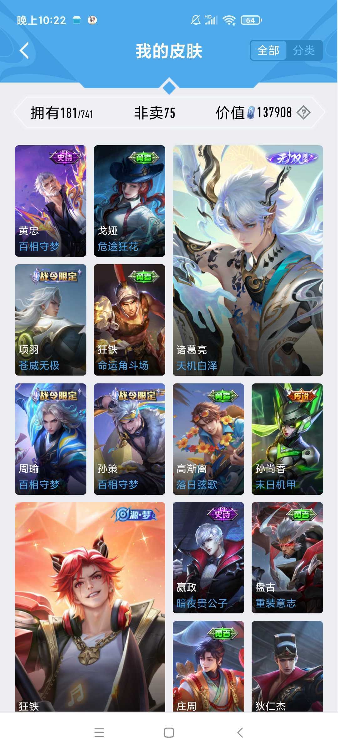 v10、12水539皮、死亡执政官、刘备星传说时之思念、小兵皮肤大耳狗甜茶、瑶无双真我赫兹、愿照·九州拓、怪盗基德、画中仙、至尊宝、凤求凰、神威、天魔缭乱