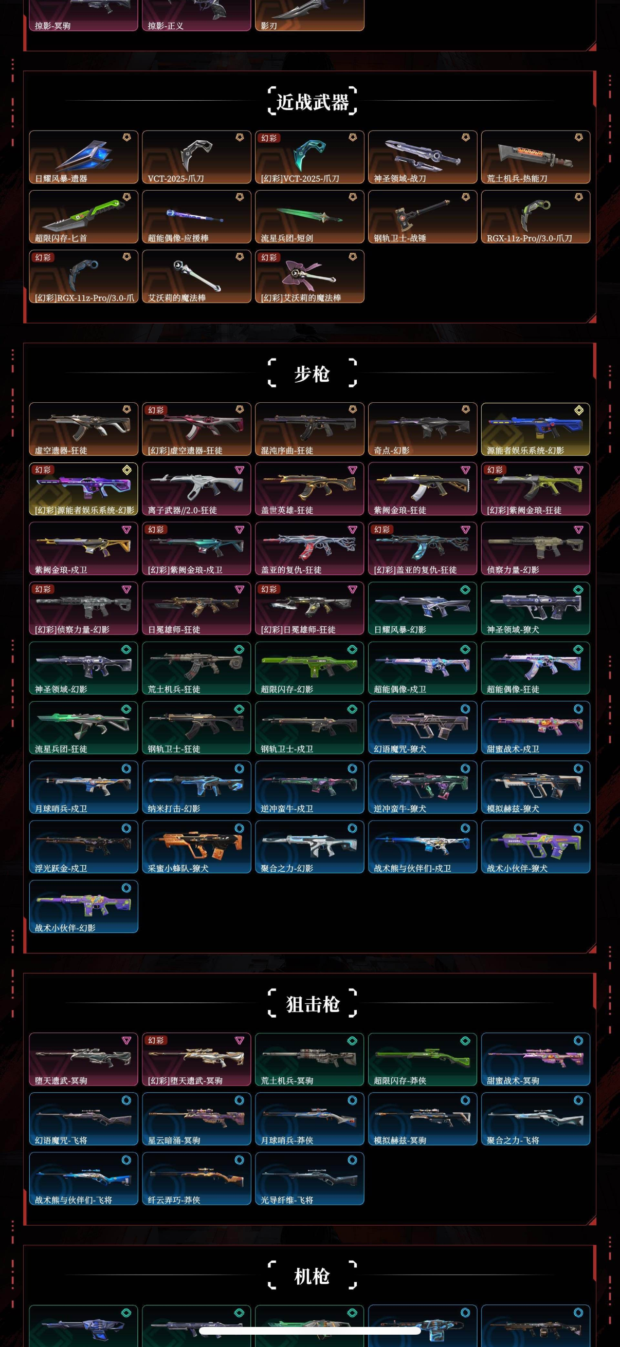 【拥有近战武器】日耀风暴-遗器,VCT-2025-爪刀,神圣领域-战刀,荒土机兵-热能刀,超限闪存-匕首,超能偶像-应援棒,流星兵团-短剑,钢轨卫士-战锤,RGX-11z-Pro//3.0-爪刀,艾沃莉的魔法棒,