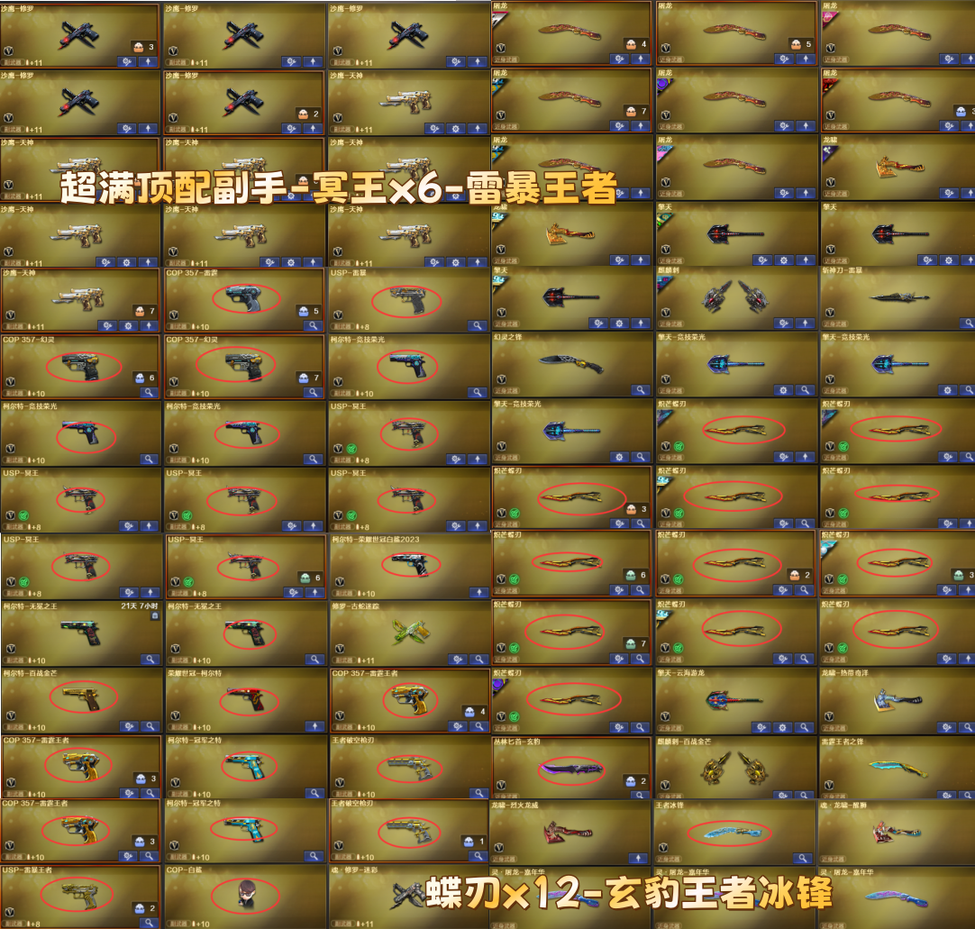 全装;USP-雷暴,柯尔特-无冕之王,USP-雷暴王者,荣耀世冠-柯尔特,柯尔特-荣耀世冠白鲨2023,柯尔特-冠军之特,炽芒蝶刃,