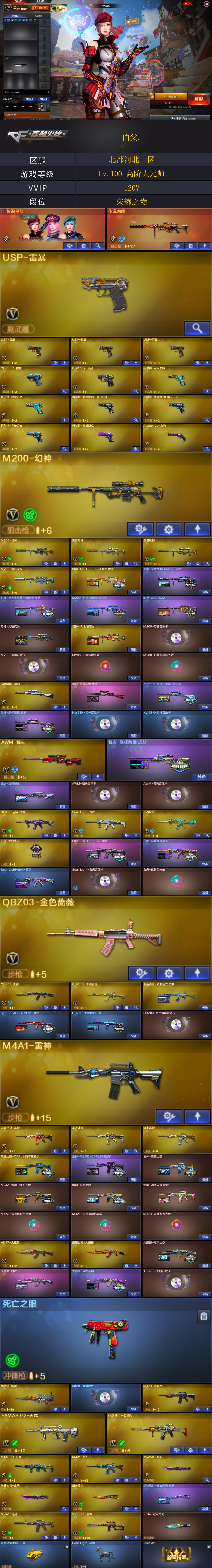 【商品标题】:北部河北一区-120V-可二次实名-【Lv.100.高阶大元帅】-【稀有武器】:传说幽瞳/M200-幻神(2)/Kar98K-星神/VSK-94-金蚀/G36C-幻影/ScarLight-白虎/M14EBR-玄武/M4A1-青龙/QBZ03-天罚/M4A1-幻灵/雷霆之契/USP-雷暴/COP357-幻灵/柯尔特-竞技荣光/天神-动感闪耀/柯尔特-荣耀世冠白鲨2023(2)/修罗-古蛇迷踪/柯尔特-冠军之特(2)/金色蔷薇-古蛇迷踪/QBZ03-金色蔷薇/AK47-火麒麟/M4A1-黑龙/M4A1-雷神(2)/M4A1-黑骑士/AK47-无影/AK47-黑武士/荣耀世冠-火麒麟/荣耀世冠-雷神/Barrett-毁灭/Barrett-极光/AWM-裁决(2)/M200-竞技荣光/加特林-炼狱/悦蓝-惊涛骇浪-觉醒版/AA-12-雷霆/炽芒蝶刃/幻灵之锋(2)/擎天-竞技荣光 【王者武器】:QBZ-03-王者蔷薇-觉醒版/王者之怒-觉醒版/王者幻神-觉醒版/王者风神-觉醒版/王者凰鸣-觉醒版 【热门角色】:电竞教官-云悠悠/机械姬/隼/奇洋探员/乔伊教练/蛇隐宗/王者-葵-貂蝉/王者影豹/炽天使/兔囡囡/潘多拉 【热门音效卡】:M200-幻神音效卡(2)/Kar98K-星神音效卡(2)/AWM-裁决音效卡(2)/Scar Light-白虎音效卡/QBZ03-金色蔷薇音效卡/加特林-炼狱音效卡/QBZ03-天罚音效卡/Barrett-毁灭音效卡/M4A1-黑骑士音效卡/AK47-火麒麟音效卡/Barrett-极光音效卡 【热门皮肤】:幻神-AG-CFPLS24冠军皮肤/幻神-荣耀世冠白鲨2023皮肤/幻神-星火小队签名臻藏版皮肤/M200-幻神-荣耀世冠白鲨/幻神-CFS2022/幻神-周瑜皮肤/幻神-纸灯龙皮肤/白虎-白鲨-CFPLS23冠军/裁决-巅峰荣耀皮肤/龙啸-巅峰荣耀皮肤/金色蔷薇-破浪逐光皮肤/荣耀之魄-CFPL十周年臻藏版/屠龙-星耀皮肤/火麒麟-白虎/Kar98K-星神-冠军之星皮肤/雷神-R.LGD-CFPLS18冠军/星神-巅峰荣耀 皮肤/火麒麟-巅峰荣耀/白虎-巅峰荣耀 皮肤/裁决-流光秘银/黑龙-冠军之武/炽芒蝶刃-破浪逐光皮肤/QBZ03-AG-CFPLS19冠军/屠龙-巅峰荣耀皮肤/QBZ03-荣耀世冠白鲨/ScarLight-白虎-暗星/火麒麟-冠军之心/M4A1-雷神-CFS2019/屠龙-荣耀之锋(2)/毁灭-荣耀之怒/雷神-冠军之魄/毁灭-CFS2020/雷神-荣耀之魄 【其他亮点】:Knife-冠军之刃/白虎-迷你小艾/白虎-九尾白狐/柯尔特-赛博朋克/Scar Light-马枪/黄金猫猫手套-白鲨/烟雾弹-荣耀世冠白鲨2023/超核名片 (截图展示段位不代表实际段位,如赛季更新等不可抗拒因素发生变化,其余道具看截图或咨询客服);USP-雷暴,柯尔特-无冕之王,柯尔特-荣耀世冠白鲨2023,柯尔特-冠军之特,炽芒蝶刃,Knife-冠军之刃,传说星骇,